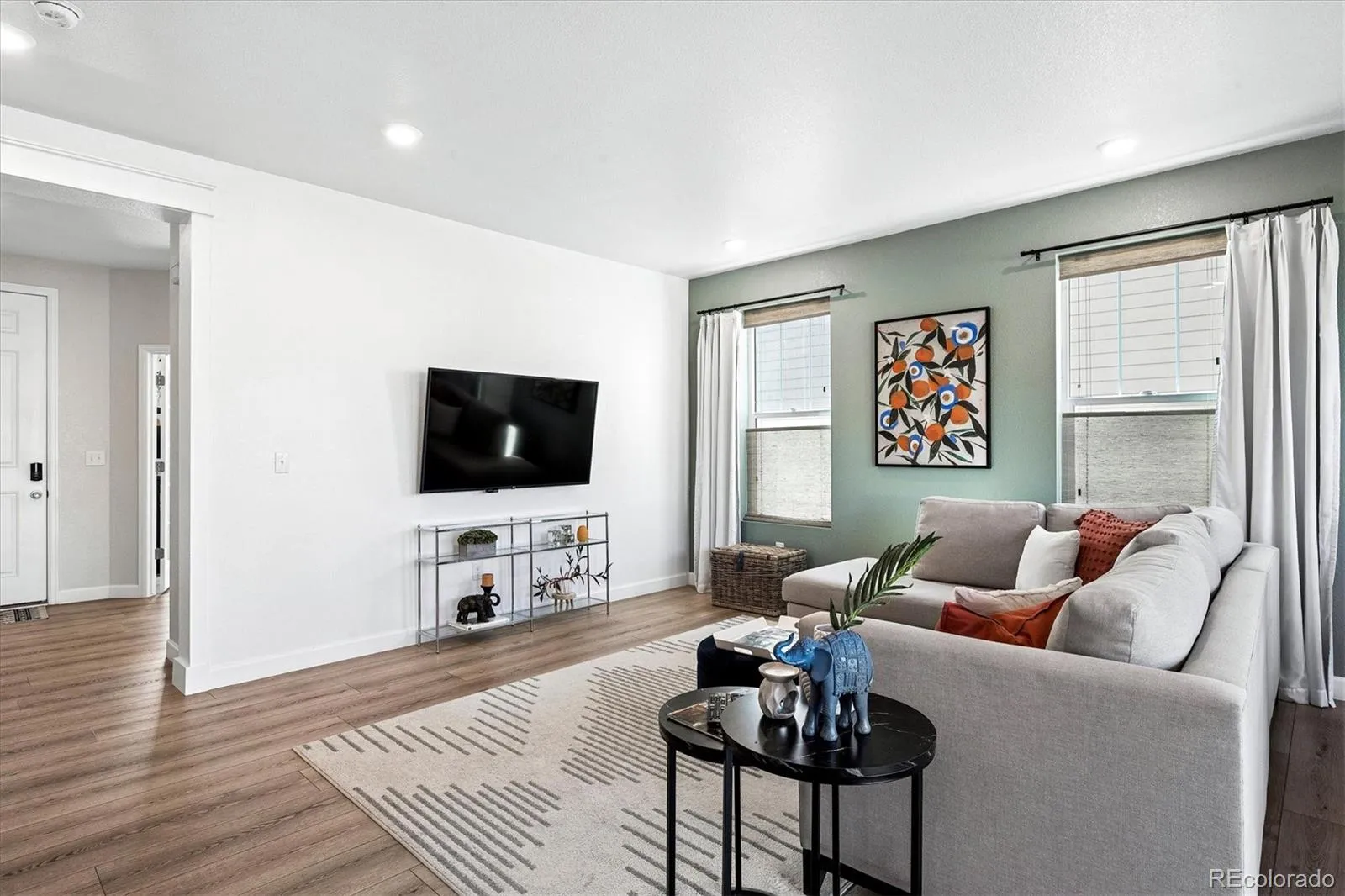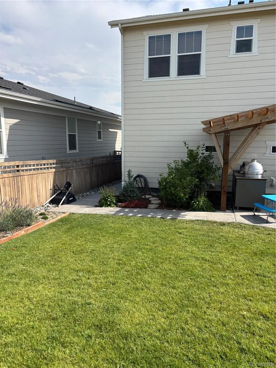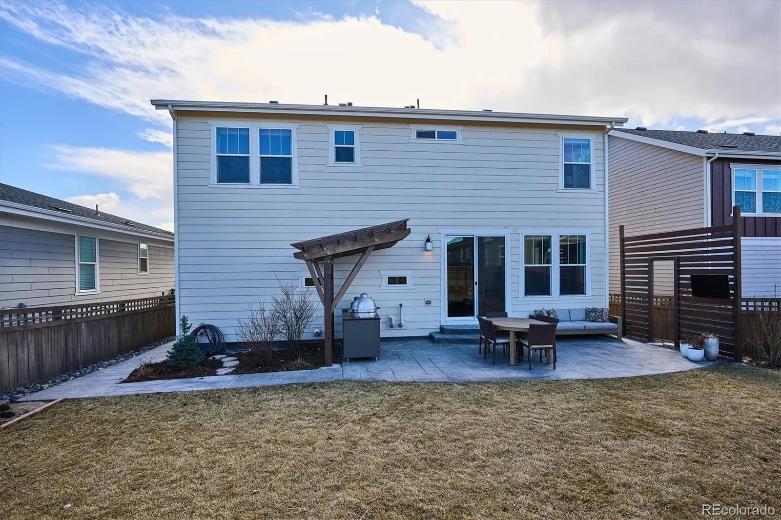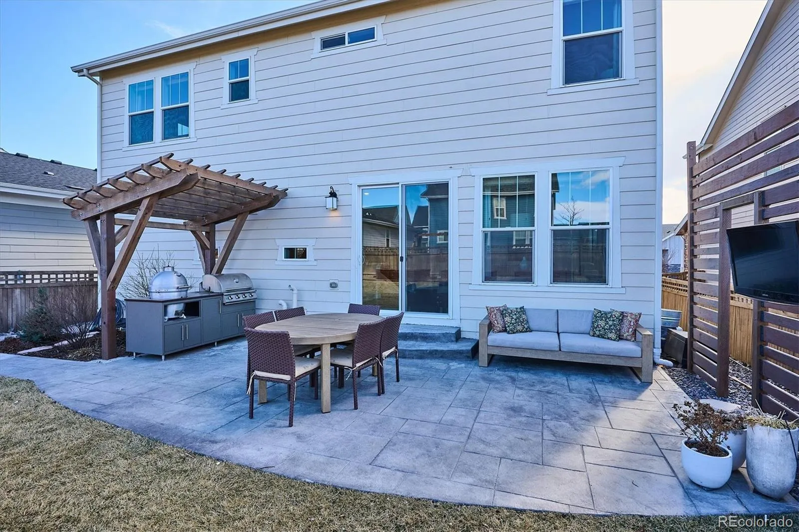 Welcome to this beautifully designed south-facing home in the vibrant Painted Prairie community, where modern style and thoughtful details come together splendidly. With 3 bedrooms, a spacious loft, & a private enclosed main-floor office, this home offers flexibility for the way you live, work, & gather. From the moment you step inside, the warmth of hardwood floors and the open, airy layout invite you in. The bright great room flows seamlessly into the kitchen, creating a natural gathering space filled with light & connection, perfect for quiet mornings, lively dinners, or entertaining. The custom kitchen serves as the heart of the home, featuring quartz countertops, a chic tile backsplash, extended cabinetry, & a generous walk-in pantry designed for both beauty and function. Upstairs, the loft offers a additional living space ideal for relaxing, working, or play, complete with custom cabinetry for added storage & a gorgeous wood detailed wall. Down the hall you’ll find two sunny secondary bedrooms, a full bath, and the convenient 2nd floor laundry room that adds ease to daily routines. The primary suite is a true retreat, highlighted by custom woodwork paneling, a spa-inspired bathroom, and a beautifully finished custom closet designed to simplify & elevate. The full unfinished basement with 9-foot ceilings presents endless possibilities. Outdoor living is just as inviting, with full professional landscaping, raised garden beds w/irrigation system, stamped concrete patio & wraparound walkway, pergola, sun shade, TV & outdoor kitchen complete with smoker and grill, ideal for enjoying Colorado evenings and gathering under the open sky. A new roof installed in 2024 and owned solar panels (to be paid off with an acceptable offer) provide both peace of mind and long-term efficiency. Addt’l features include fiber internet wiring, scuff-defense paint, custom window coverings throughout, ceiling fans in all bedrooms, keyless entry, added garage storage & bike hangars.