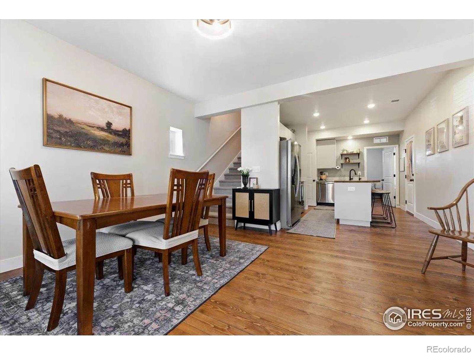 Welcome to this upgraded, South facing, end-unit townhome that lives larger than expected. Featuring a main-level primary suite with real hardwood floors throughout, this home combines thoughtful design with everyday comfort. The kitchen impresses with stainless steel appliances, a butcher block island, and generous storage. With three levels of finished living space – including a loft, fully finished basement with fireplace, wet bar, full bath and bedroom – there’s room for everyone. Enjoy added privacy with open space behind and community landscaping alongside, plus a fenced yard and covered patio accessed through the oversized two-car garage.