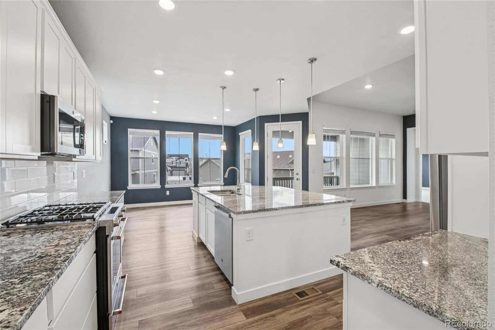 Discover the perfect blend of luxury, space, and community in this beautifully upgraded 4-bedroom, 3-bathroom ranch in sought-after Barefoot Lakes. Situated on a professionally landscaped 9,736 sq ft lot, this home showcases modern finishes, an open-concept layout, and exceptional indoor-outdoor living. The bright main level features a spacious chef’s kitchen with quartz countertops, stainless steel appliances, a large pantry, breakfast nook, and oversized eat-in island—ideal for everyday living and entertaining. A generous dining area and mudroom off the garage add both style and function. Step outside to enjoy the covered deck, pergola, and expansive concrete patio—perfect for gatherings or relaxing evenings The private primary suite offers a large walk-in closet, dual vanities, and convenient direct access to the laundry room. Three additional bedrooms and two full baths provide flexible space for guests, family, or a home office. The low-maintenance backyard is spacious and full of potential for play, pets, or gardening. Enjoy all that Barefoot Lakes has to offer, including miles of scenic trails, over 100 acres of water for paddle-boarding and fishing, and The Cove clubhouse featuring a resort-style pool, fitness center, courts, and community spaces. Colorado living at its finest—this one is not to be missed!
