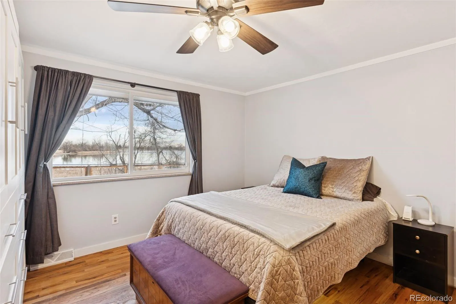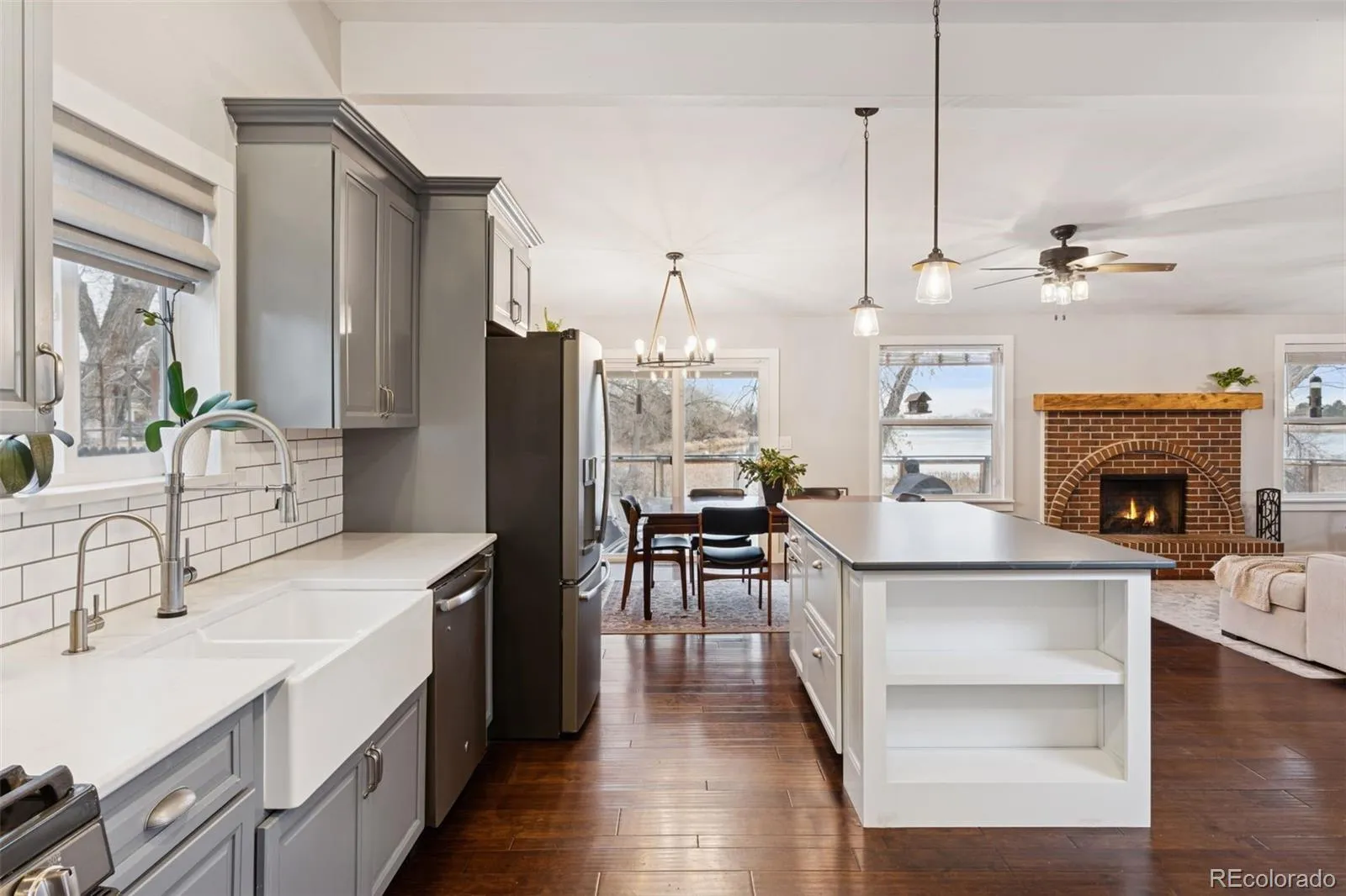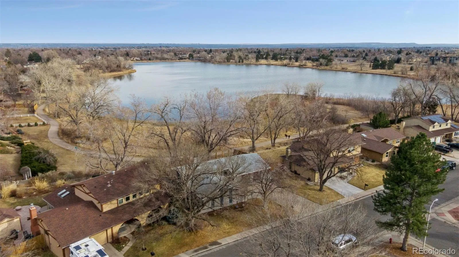 A rare opportunity to own true lakefront property, this exceptional Kendrick Lake residence offers direct access to the lake and one-mile path surrounding with sweeping water views. Enjoy fishing, walking, running, or biking year round directly out your back door. Inside, hardwood floors lead to a fully remodeled kitchen appointed with sueded quartz countertops, stainless steel appliances and custom, soft-close cabinetry, thoughtfully designed to maximize storage and functionality. Counter seating invites connection, while a cozy wood-burning fireplace anchors the living space. Wake up to unobstructed lake views from the primary suite which also features a beautifully renovated bathroom with a large, step-in Roman style double shower and dual vanities. The main level is complemented by two additional bedrooms both with oversized windows and updated full bathroom. The versatile basement includes another wood-burning fireplace, an egress window and private full bath, ideal as a guest suite, secondary primary bedroom or expansive recreation room. Outdoors, a fully fenced backyard with a custom see-through fence preserves uninterrupted lake views for truly spectacular sunsets, alongside a patio and sprinkler system. Homes in this prime waterfront position seldom become available, making this offering especially distinctive within the Denver metro area with no community HOA. Conveniently located within minutes of plentiful shopping and dining options at Belmar along with quick access to 6th Avenue for direct access to Denver within 15 minutes.