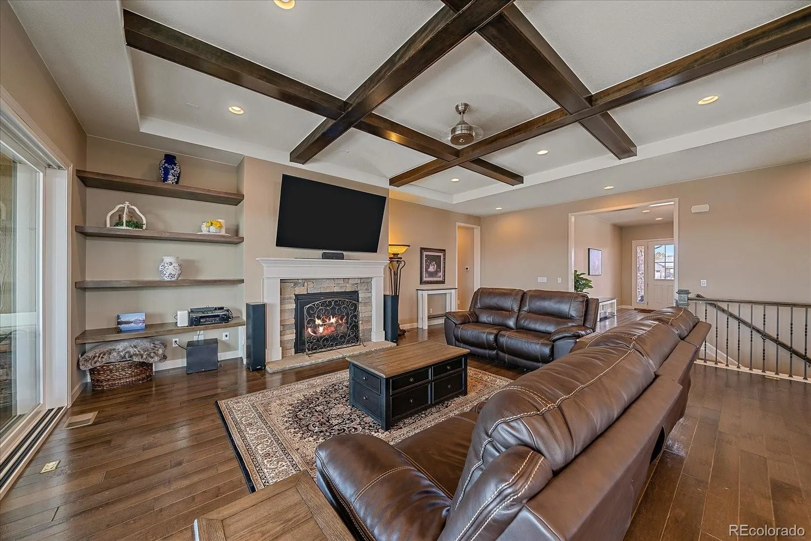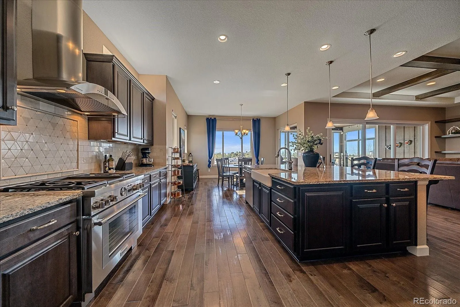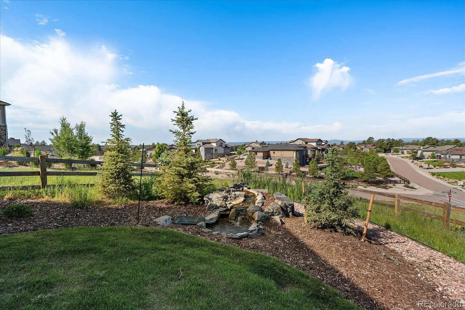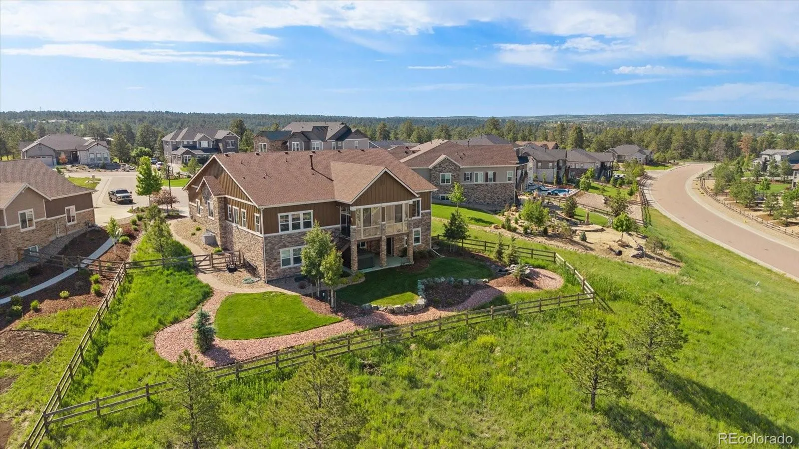 Views, views, views from almost every room, they are spectacular. Embrace the Colorado lifestyle in this ranch style estate home gracefully set on a cul de sac in the prestigious Timbers at the Pinery. This home showcases luxury finishes, soaring ceilings and is bathed in natural light. The great room has a wall of glass, custom shelving, fireplace, coffered ceiling and is open to the kitchen. The gourmet kitchen will impress you with it’s oversized island/bar, granite counters, high end appliances including Thermador stove & dishwasher, ss hood, butler’s pantry with wine frig & large walk in pantry. The adjoining spacious nook looks out to the breathtaking mountains. Step into the sunroom to enjoy seamless indoor/outdoor living. You will just want to relax and soak in the views year round including grilling 365 days a year. The dining room is perfect for entertaining. Escape to the primary suite which is a private sanctuary for relaxation. The 5 piece bath features jetted soaking tub, large shower, and massive walk in closet. The secondary bedrooms on main floor are both a great size and feature a jack & jill bath. Main floor study is highlighted with french doors and a custom wall of shelves. The finished walkout expands your living space and features 9′ ceilings, and a large family room plumbed for a wet bar. Work out in the spacious gym which could also be another bedroom. There is a private bedroom and 3/4 bath downstairs too. In the unfinished area there is plenty of room for storage plus a workshop, wow. Other amenities include 10′ ceilings main floor, engineered hardwood floor, remote control shades, and secondary sub panel. You will love the professionally landscaped yard with water feature, trees, boulders, split rail fence & swim spa. This home is close to trails, parks, golf courses, top rated schools, & shopping and dining options. A once in a lifetime opportunity to own a home with these unparalleled views that are impossible to replicate.