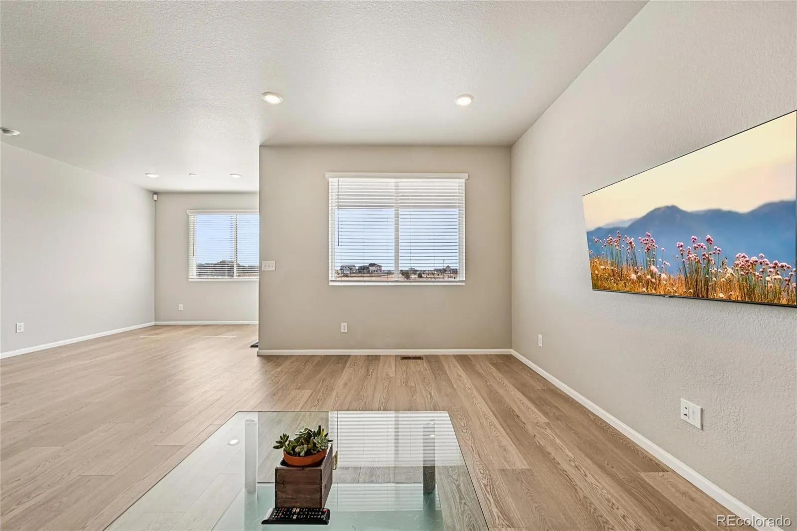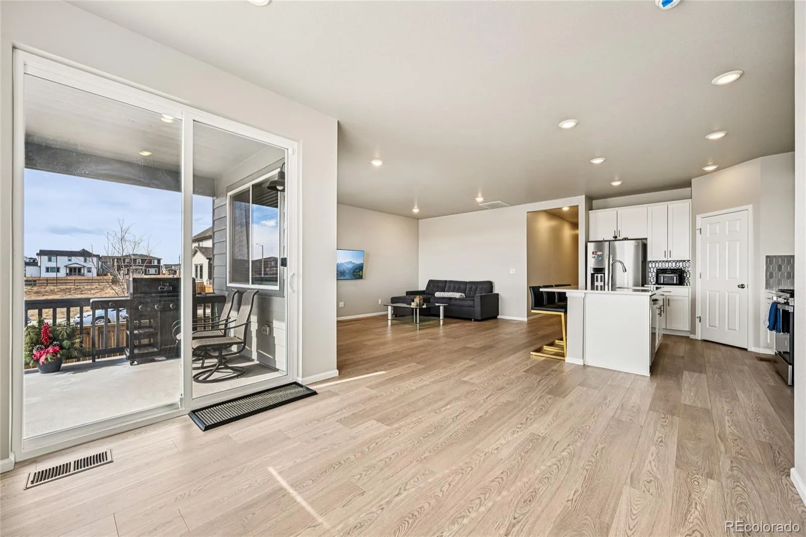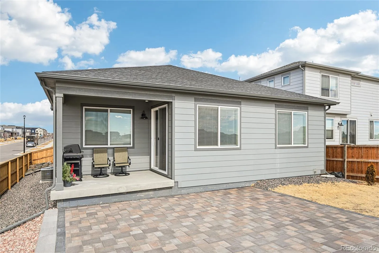 Welcome to this like-new ranch home in the desirable Ridgeline Vista, Brighton community—where one-level living truly shines. Perfectly positioned on a spacious corner lot, this meticulously maintained home offers comfort, style, and effortless functionality. Step inside to a bright and cheerful open layout featuring easy-maintenance LVP flooring and recessed lighting throughout. The inviting living space flows seamlessly into a chef’s kitchen designed to impress, complete with modern stainless steel appliances, sleek quartz countertops, a large center eat-in island, and a walk-in pantry for all your essentials. The adjacent dining area opens to a generous covered patio—ideal for outdoor dining and relaxing rain or shine. The thoughtfully designed floor plan includes three generously sized bedrooms, with the secondary bedrooms situated opposite the primary suite for added privacy. The primary retreat features a spacious walk-in closet and a private en-suite bath. A Green Energy HERS rating of 59 with foam insulation throughout the home from the crawl space to the attic to help protect the home and keep energy bills low. Enjoy the beautifully enhanced backyard, completed in 2025, with 488 sq ft granite aggregate paver patio, small retaining wall, landscape rock accents, and newly planted trees—perfectly set up for springtime enjoyment. Located close to the neighborhood park with easy access to groceries, shopping, dining, and just minutes to I-76, this move-in-ready home blends convenience with comfort. Experience a home that not only surrounds you with warmth and style but also supports a sustainable, eco-friendly lifestyle.