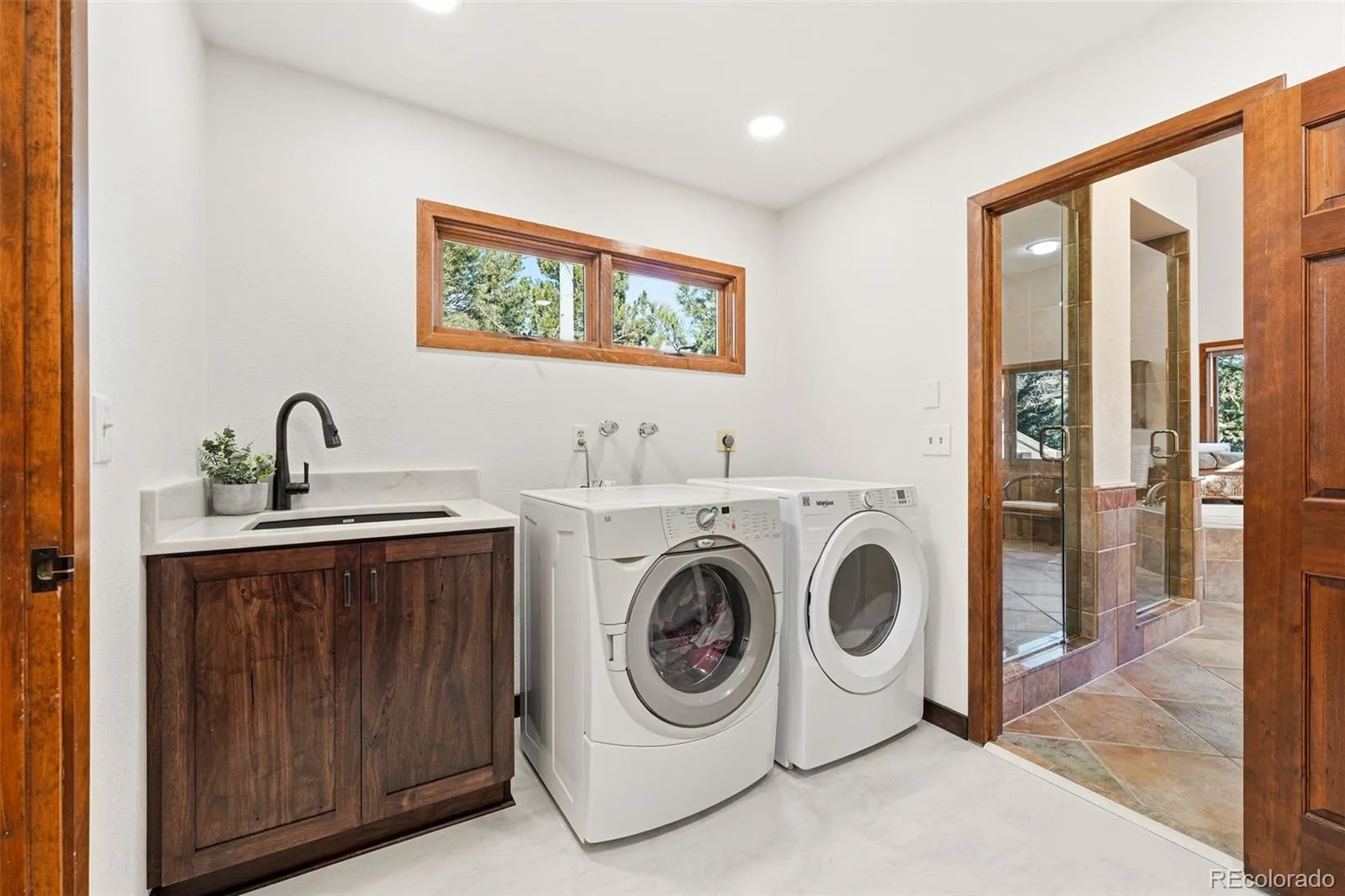 Step down to the primary suite with vaulted ceilings, cozy fireplace, private deck access, and spa bath with heated floors, jetted tub, dual vanities, dual showers, walk-in closet, and hot water recirculation. Laundry with new sink and dryer is conveniently nearby.