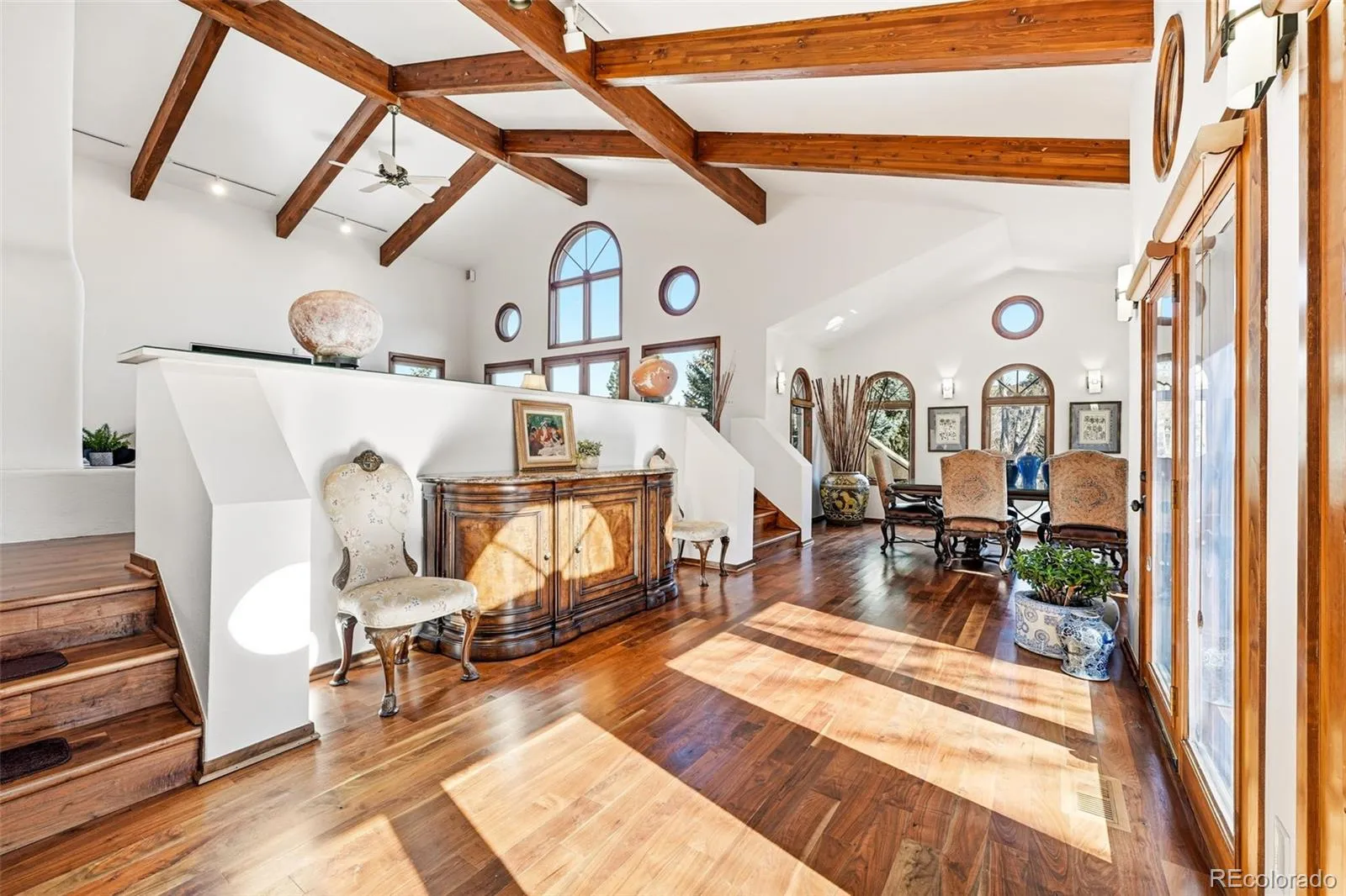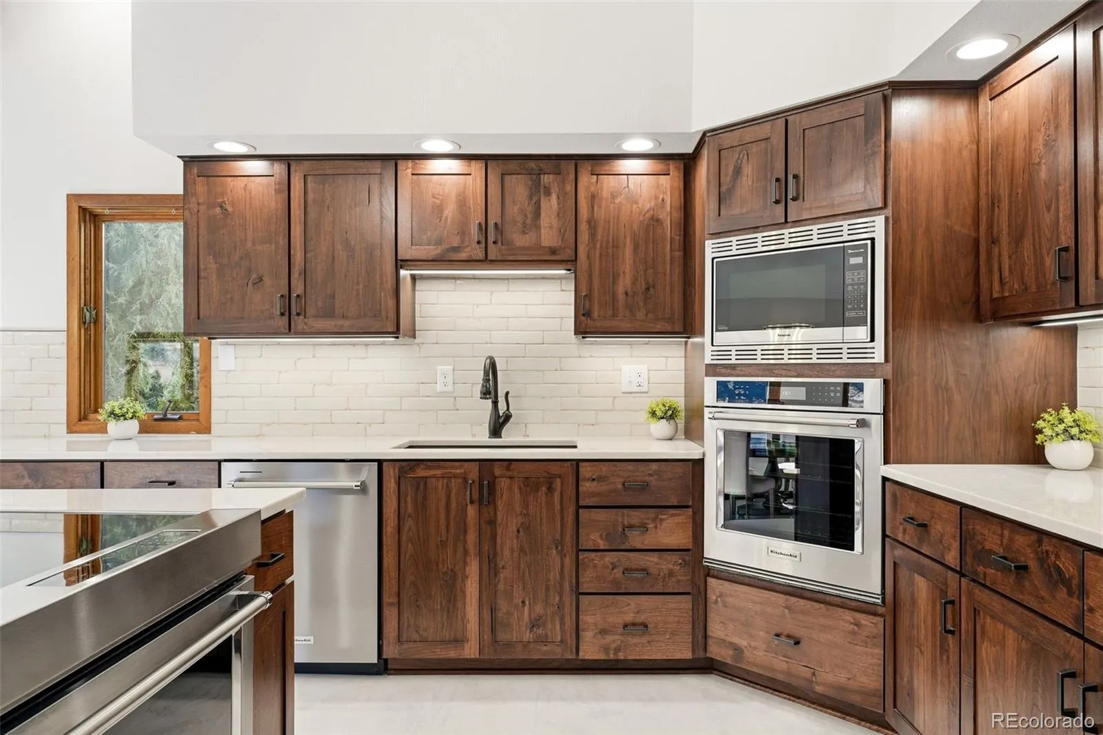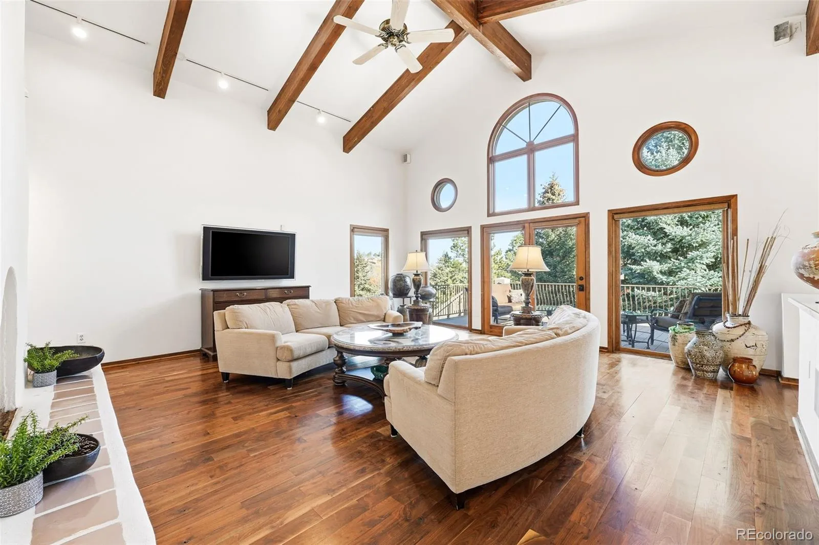 A cobblestone paver driveway, terraced retaining walls, mature pines, aspens, and spruce create a striking sense of arrival. Rebuilt multi-level decking, integrated lighting, zoned sound, new patio awning, roof ice-melt system, fire-mitigation perimeter, and so much more.