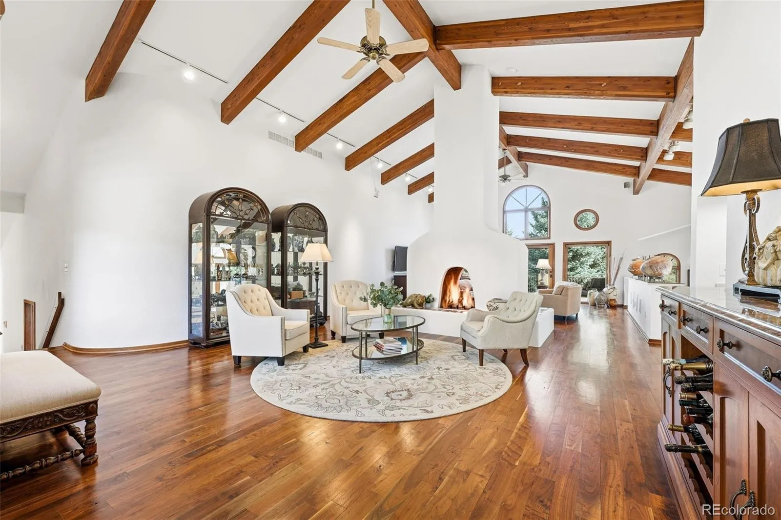 Inside, the vaulted great room showcases wood-beamed ceilings, solid walnut floors, adobe fireplace, new wet bar with quartz countertop, and whole-house 5-zone sound. The freshly renovated kitchen offers quartz countertops, walnut cabinetry, induction range, wall oven, new refrigerator, energy-efficient dishwasher, and updated modern lighting. It flows to the solarium, formal dining room, and private cobblestone patio – perfect for entertaining and grilling.