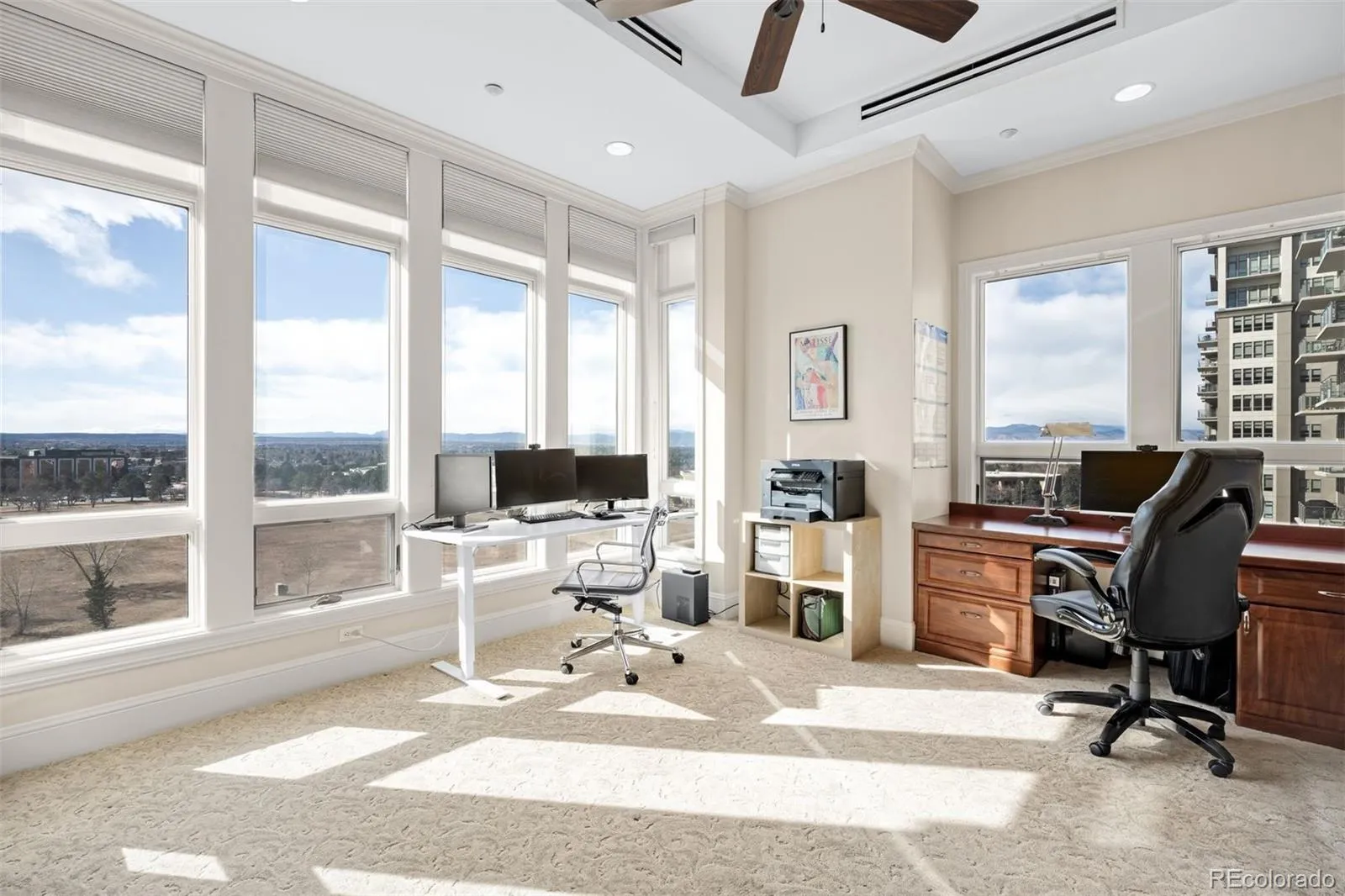 Positioned at the coveted end of one of the U-shaped towers at The Landmark, this expansive residence offers rare privacy and panoramic southwestern views that truly set it apart. The home enjoys open sightlines with no direct views into neighboring units, just sweeping vistas of Pikes Peak and the Front Range from an oversized balcony. Inside, thoughtful 2019 updates blend timeless finishes with modern comfort. The kitchen is outfitted with KitchenAid appliances, upgraded granite countertops and abundant cabinetry, flowing seamlessly into the dining and living spaces. Luxury vinyl flooring runs throughout the main space, while a dramatic stacked stone surround elevates the gas fireplace and triple-paned windows throughout ensure exceptional quiet and energy efficiency. One of the home’s most compelling features is its dual-suite layout. Two primary-style bedrooms are positioned on opposite ends of the residence for maximum privacy. The main suite offers a generously sized bedroom and a 5 piece en-suite bath complete with jetted soaking tub, frameless glass shower, dual sink vanity, and a walk-in closet. The second suite, currently styled as an office with a Murphy bed and custom built-ins, features an en-suite bath accessible from both the bedroom and a secondary entrance off the dining room, perfect for guests. Additional highlights include a dedicated laundry room with stackable Electrolux washer and dryer plus extra storage, custom built-ins throughout, remote-controlled shades, and elevated finishes at every turn. Life at The Landmark delivers true lock-and-leave luxury with concierge service, 24-hr security, on-site management/maintenance, fitness centers, sauna/steam rooms, pools, business centers, guest suites, and a private theater. Just outside your door, an exceptional retail district offers restaurants of nearly every cuisine, a coffee shop, yoga, a golf simulator, and more. This is refined, maintenance-free living with iconic Colorado views.