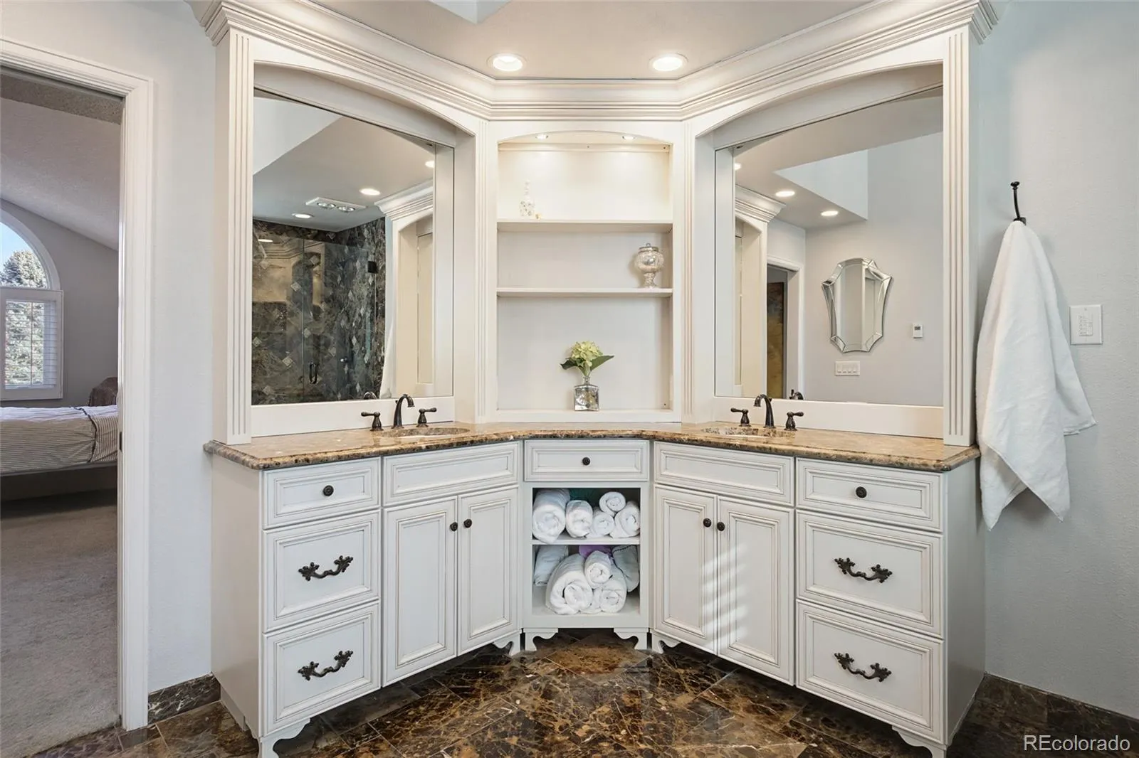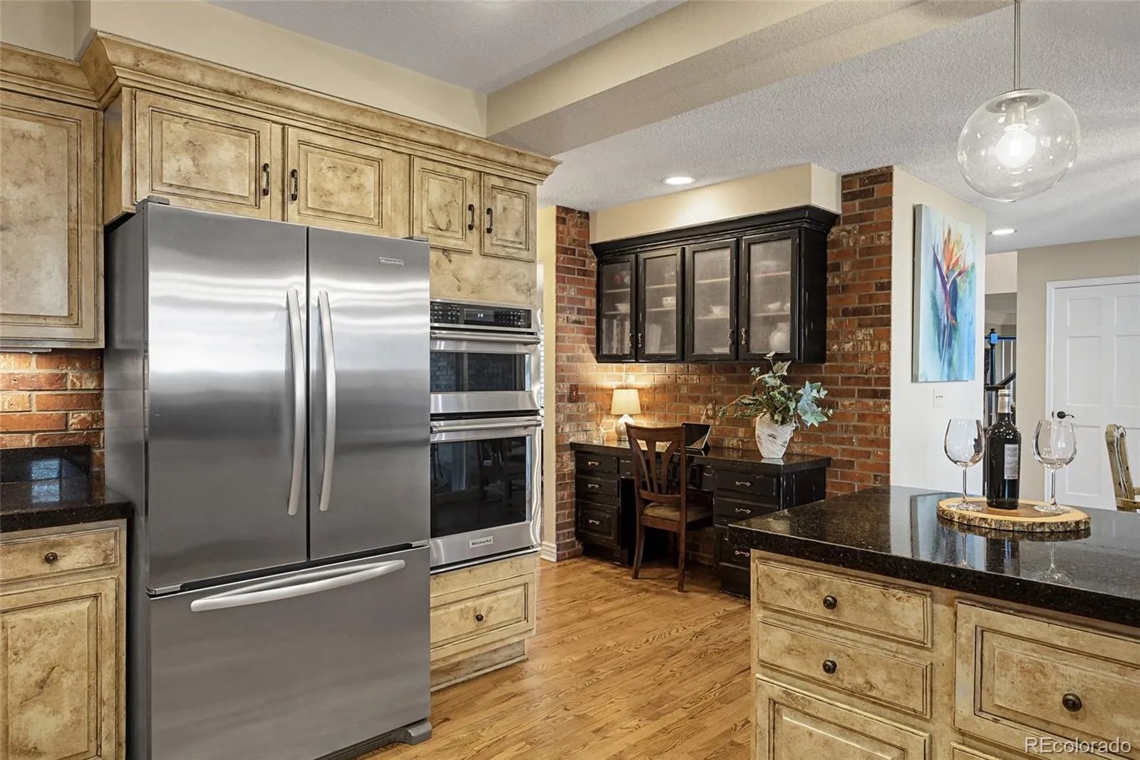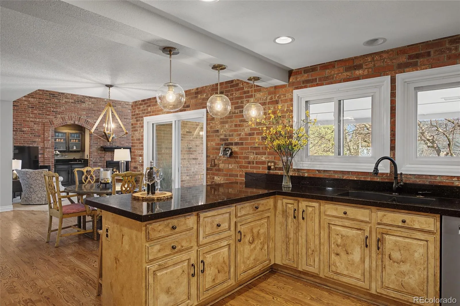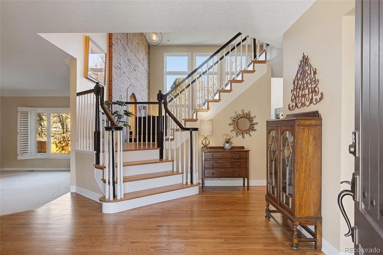 This beautiful family residence is a rare blend of timeless architecture and modern luxury, set on a coveted corner lot surrounded by mature landscaping with exceptional privacy. From the moment you arrive via the circular driveway, the home makes a statement—classic, substantial, and inviting. High ceilings, rich crown moulding, and 6-inch baseboards create an elevated feel, while expansive windows flood the interior with natural light. The heart of the home is a dramatic two-story great room with exposed brick wall that brings rustic warmth and architectural drama. The chef’s kitchen features KitchenAid and Bosch appliances, tons of cabinetry, spacious pantry closet, built in planning desk, and flows into the breakfast room and family room with a gas fireplace—perfect for everyday living. Formal spaces include an elegant paneled study, a gracious living room, and a formal dining room designed for memorable gatherings. Three gas fireplaces throughout the home add warmth and charm. The thoughtfully designed floor plan offers five bedrooms and five baths. The stunning primary suite with gas fireplace, walk-in closet, luxurious six-piece ensuite bath featuring dual showers and elegant soaking tub is undeniably indulgent. Guest accommodations include one bedroom with ensuite bath, and two with a Jack-and-Jill setup. The second-floor laundry room has washer and dryer included. The walk-out basement contains the large exercise room, 5th bedroom/hobby room and bath with post exercise steam shower, for guests or family. The covered deck with gas grill, patio with firepit, and fenced yard is big enough for both soccer practice and marshmellow roasting parties. Located near Hamlet Park, with walking and golf cart paths to Columbine Country Club, close to Old Town Littleton, light rail station, retail, restaurants, golf, tennis, Clement Park, and local favorites like the Lakehouse and Colore restaurants, this home delivers an exceptional lifestyle in an unbeatable setting.