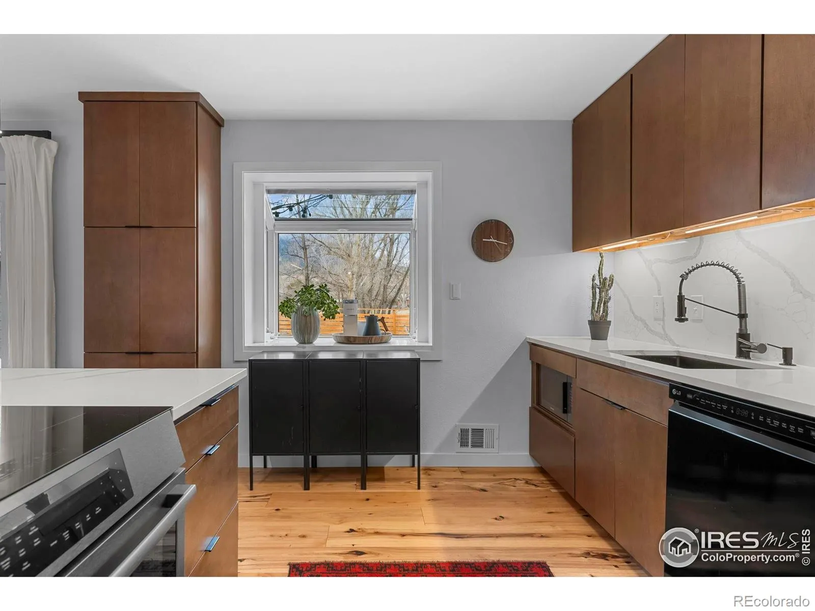 SHOWINGS START SAT, FEB. 21st! Love Where You Live in this beautifully updated mid-century modern, ranch-style home, offering exceptional value in Boulder. With striking modern curb appeal featuring a sleek black brick exterior and new front and garage doors, this home makes a memorable first impression. Perfectly situated on one of the neighborhood’s premier lots, the property backs to Martin Park and the Bear Creek Path, showcasing stunning west-facing Flatiron views and just a short walk to top-rated Creekside Elementary. Inside, the extensively renovated main-level shines with new hickory wood flooring & a thoughtfully redesigned chef’s kitchen complete with rich walnut-toned soft-close cabinetry, quartz countertops, center island with seating, and high-end appliances including a Bosch induction cooktop and Samsung Smart Refrigerator. The inviting living room features a stylish electric fireplace and custom designer lighting thru-out. Three well-sized bedrooms on the main-level, along with an expanded and beautifully updated full bath offering a double-sink vanity & additional storage. Step outside to a fully fenced backyard retreat with a spacious flagstone patio – perfect for relaxing or entertaining while enjoying the views. The fully finished basement adds valuable living space, including a family room, flexible exercise/bonus room, powder bath, 4th bedroom, a spacious work from home space/5th bedroom, and updated bath with double sinks and walk-in shower. Additional updates include a newer roof and windows. Unbeatable location within walking distance to Martin Park, Creekside Elementary, Under the Sun, Southern Sun Brewery, Whole Foods, King Soopers, Sweet Cow, and more. Easy access to Pearl Street, CU Boulder, and a convenient commute to Denver. Don’t miss this opportunity to enjoy the very best of Boulder living!