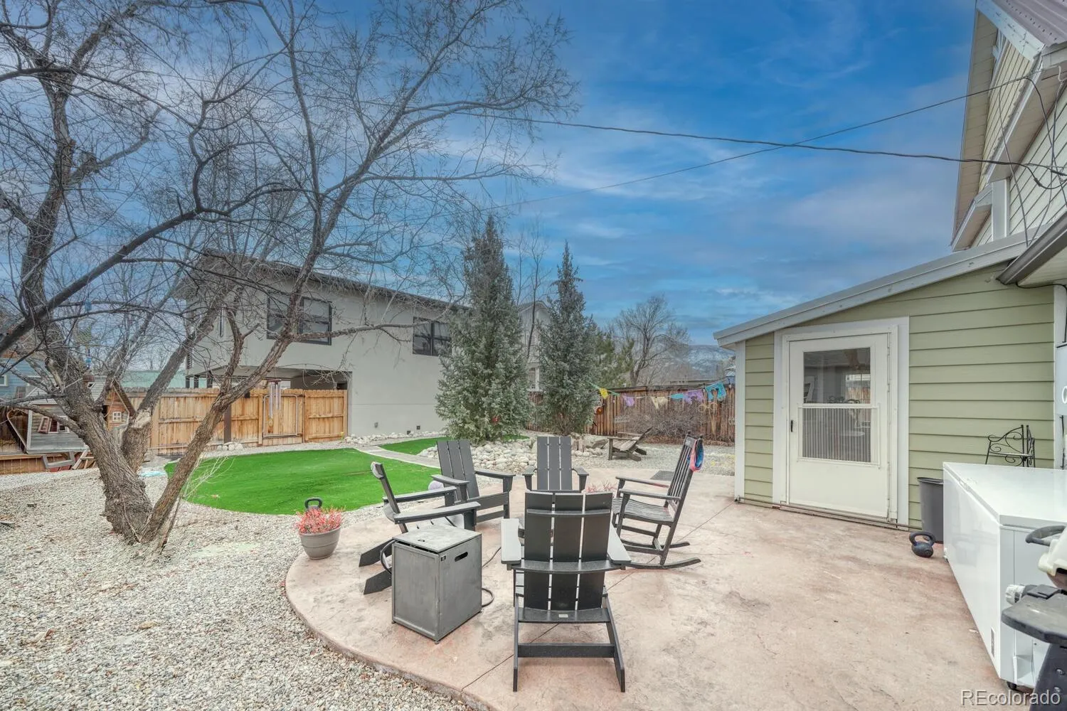 A landscaped backyard connects both living areas and features Salida Turf, Short Green with thatch, pet-friendly and antimicrobial, installed in 2024. This low-maintenance outdoor space is well suited for gathering and recreation.