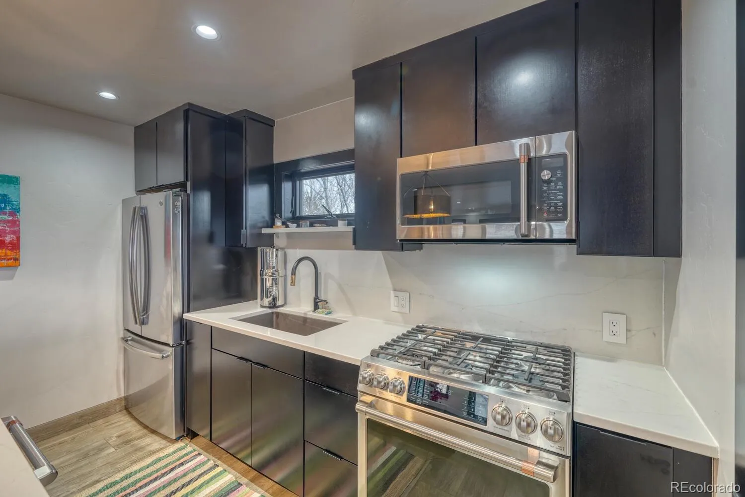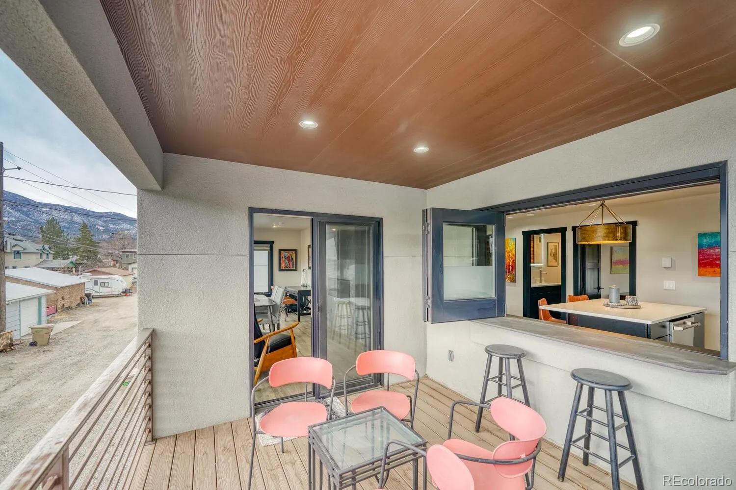 The ADU showcases handmade steel railings on the interior stairs and deck, a double-sided fireplace opening into a spacious sunroom, and decking with a private balcony. An indoor/outdoor pass-through window connects the kitchen to the balcony, creating seamless dining and entertaining space.