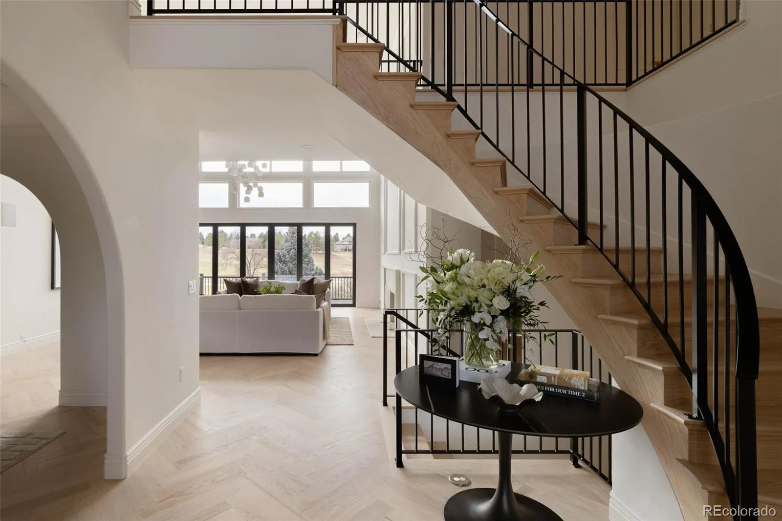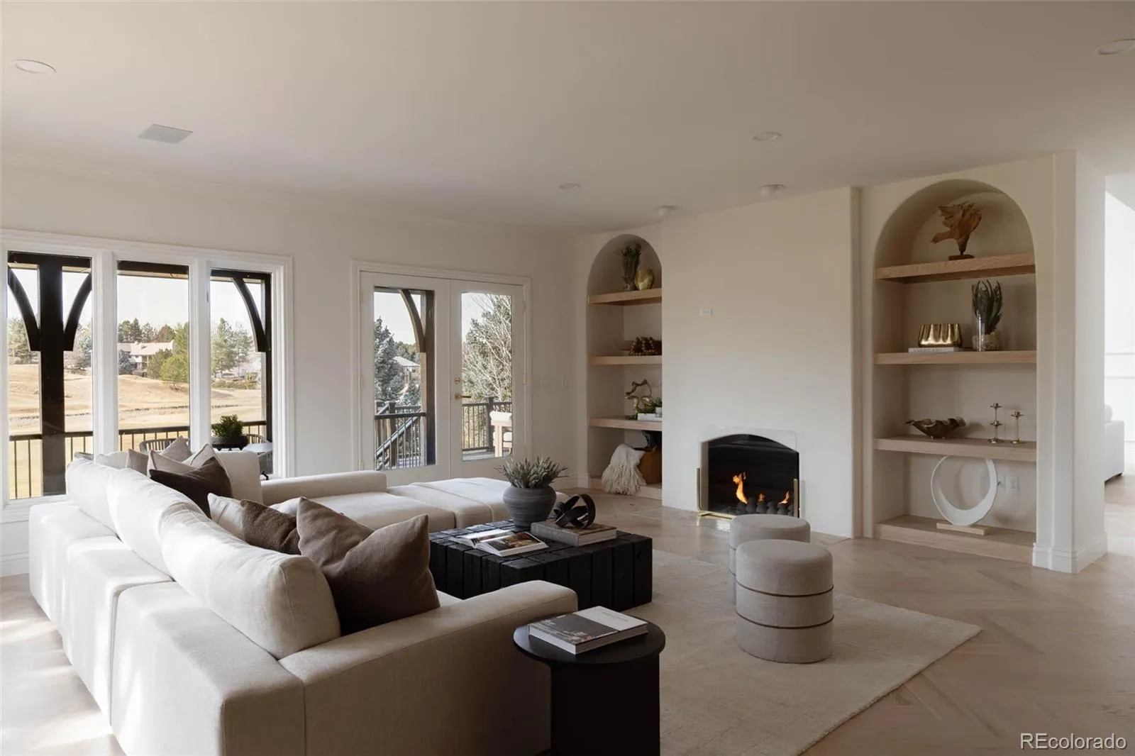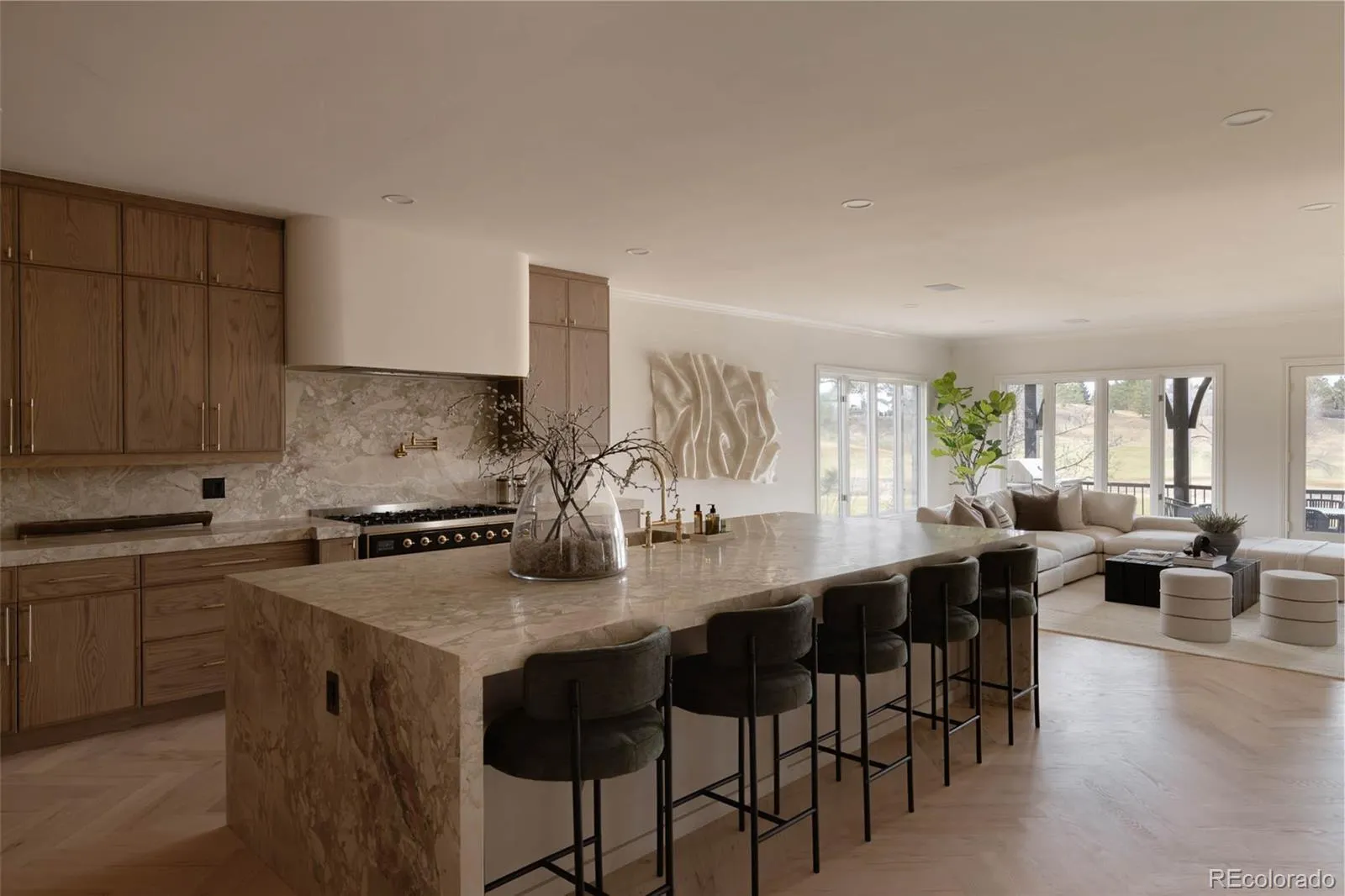 Open House Saturday 2/21 10am – 12pm. Rare fully renovated estate on Hole 16 of Glenmoor Country Club, featuring six bedrooms and seven bathrooms. No detail was spared in this renovation. The entry sets a composed tone, framed by a private office and powder bath, while a formal dining room connects seamlessly to the kitchen for natural entertaining flow. The great room rises two stories with architectural window lines framing the golf course. An 18-Ft ERIS accordion door opens fully to the deck, creating a seamless indoor-outdoor connection and drawing natural light into the space. Custom wall paneling, wide plank white oak herringbone floors, and a newly installed fireplace anchor the room. The main-floor primary suite is positioned for privacy and includes a fireplace, steam shower finished in Porcelanosa tile, and a custom California Closet. The kitchen functions as both centerpiece and workspace, featuring a 48-inch ILVE Majestic range, two dishwashers, custom cabinetry, rare marble Ceppo countertops with mitered edge, paneled Thermador refrigerator, built-in thermador coffee maker, dry bar and butler’s pantry. An adjacent family room offers a more intimate secondary living space. Upstairs, a loft connects three en suite bedrooms, including one with a private west-facing balcony overlooking the course. A bonus room above the garage is currently configured as a theatre room, and can easily serve as a guest bedroom, creative studio or playroom. The walk-out basement offers a spacious family room with fireplace, full wet bar, wine cellar, two additional bedrooms, and a gym with private garage access. Major updates include four brand new furnaces as well air conditioning units, a faux cedar shake roof, new flooring, designer grade lighting, five gas fireplaces, Sonos system, and an epoxied three-car garage. Set within Glenmoor’s private gated community, the home offers access to the High Line Canal trail, Cherry Creek, and DTC.