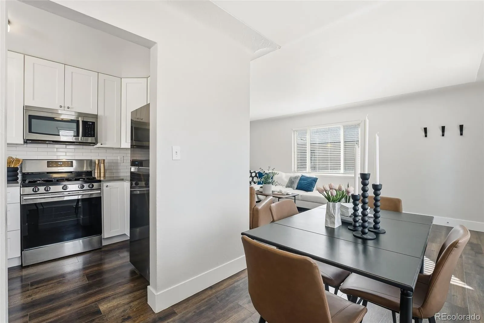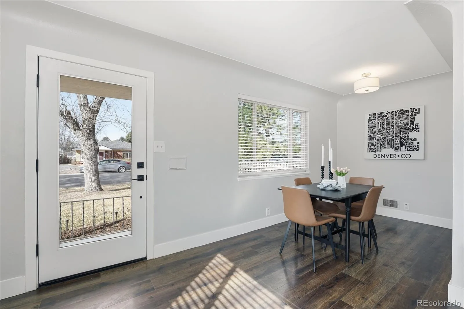 Welcome to 2434 S. Corona Street—a spacious, light-filled townhome just one block from Harvard Gulch Park and within walking distance of the shops, dining, and charm of Downing Street. Positioned at the end of a quiet five-unit complex, this home offers the perfect balance of vibrant city living and peaceful neighborhood comfort. Large windows in the living and dining areas flood the space with natural light, creating a warm and inviting setting for relaxing or entertaining. The modern kitchen features crisp white shaker cabinetry, stylish gray quartz countertops, and matching stainless steel appliances. Just off the kitchen, a dedicated utility area offers custom storage and a new stackable washer and dryer for added convenience.Two generously sized bedrooms with ample closet space are complemented by a full bathroom, along with additional coat and linen storage. Dark engineered hardwood floors and contemporary finishes complete this move-in-ready home. Outside, enjoy a private fenced area ideal for BBQs, pets, or gardening, with landscaped beds ready for spring flowers or a summer garden. The property also includes two dedicated off-alley parking spaces, plus plenty of street parking.