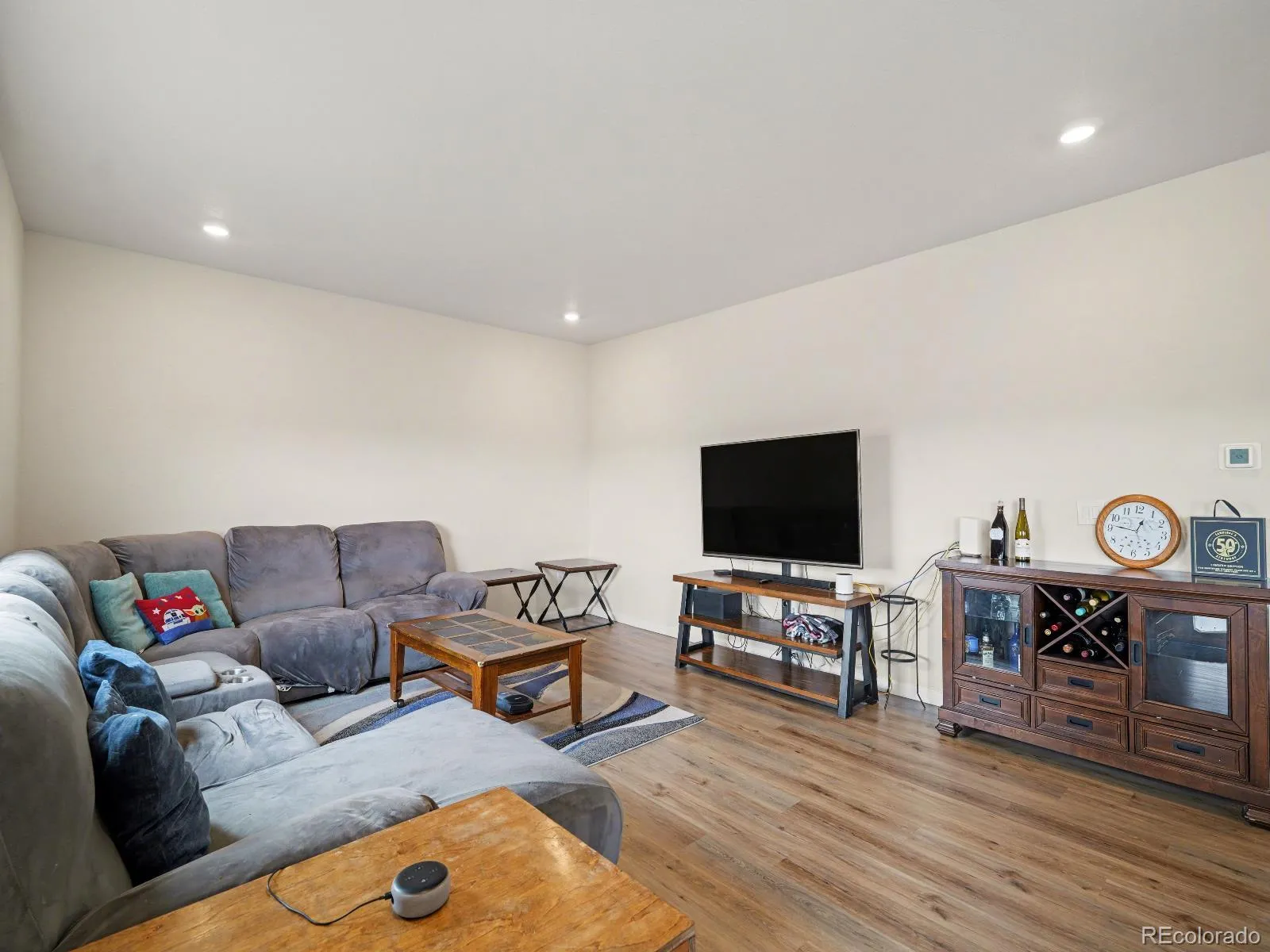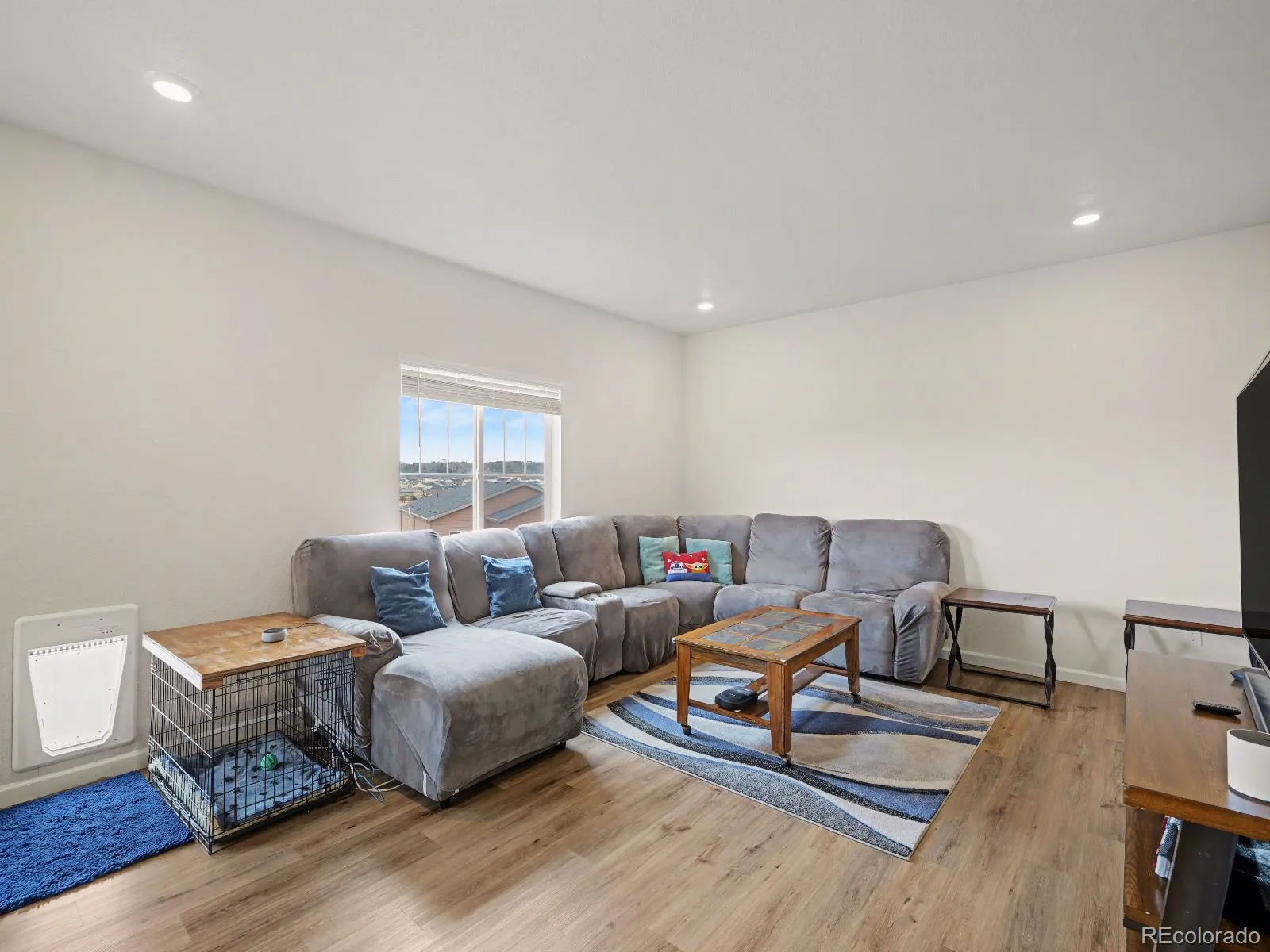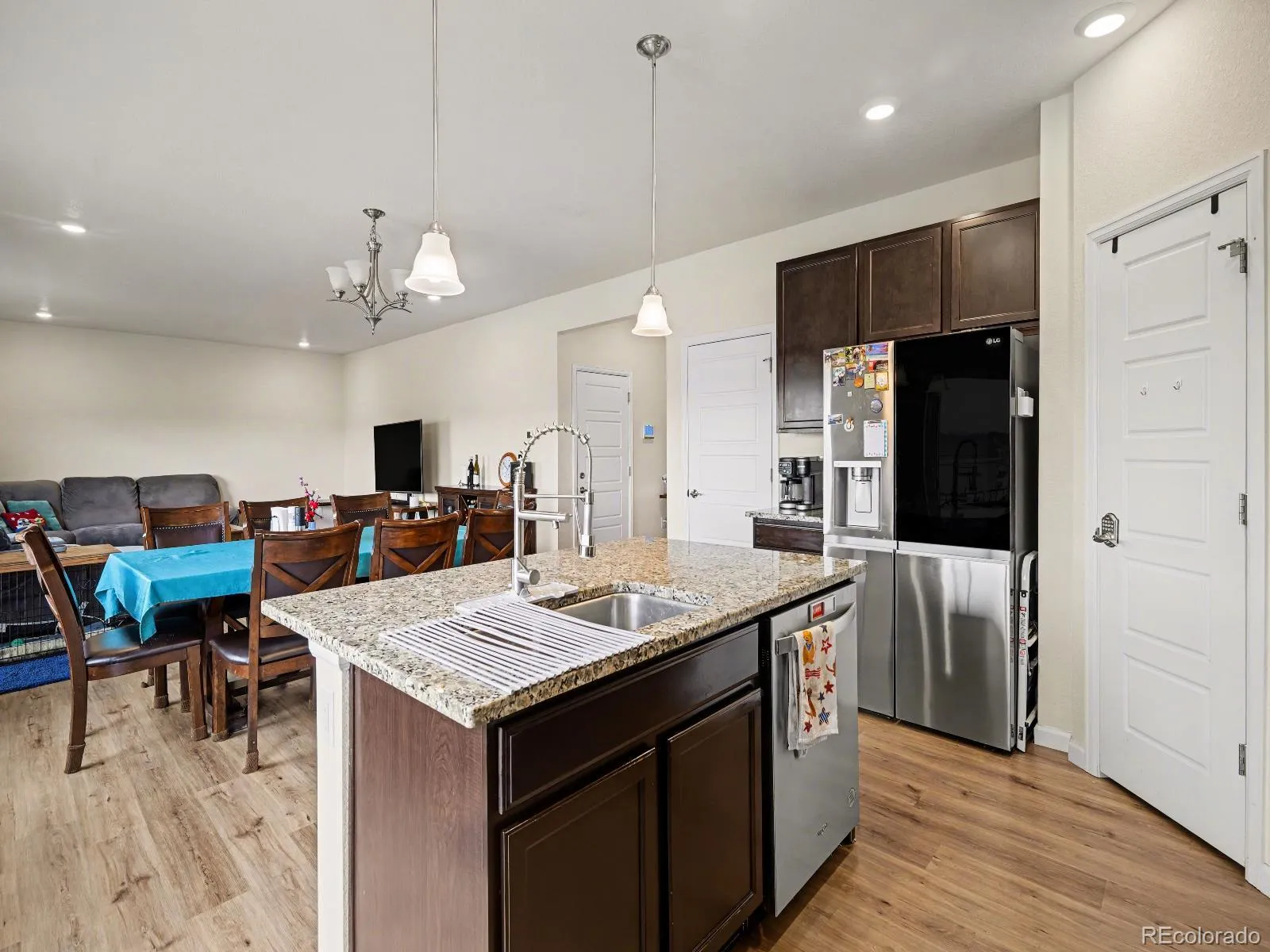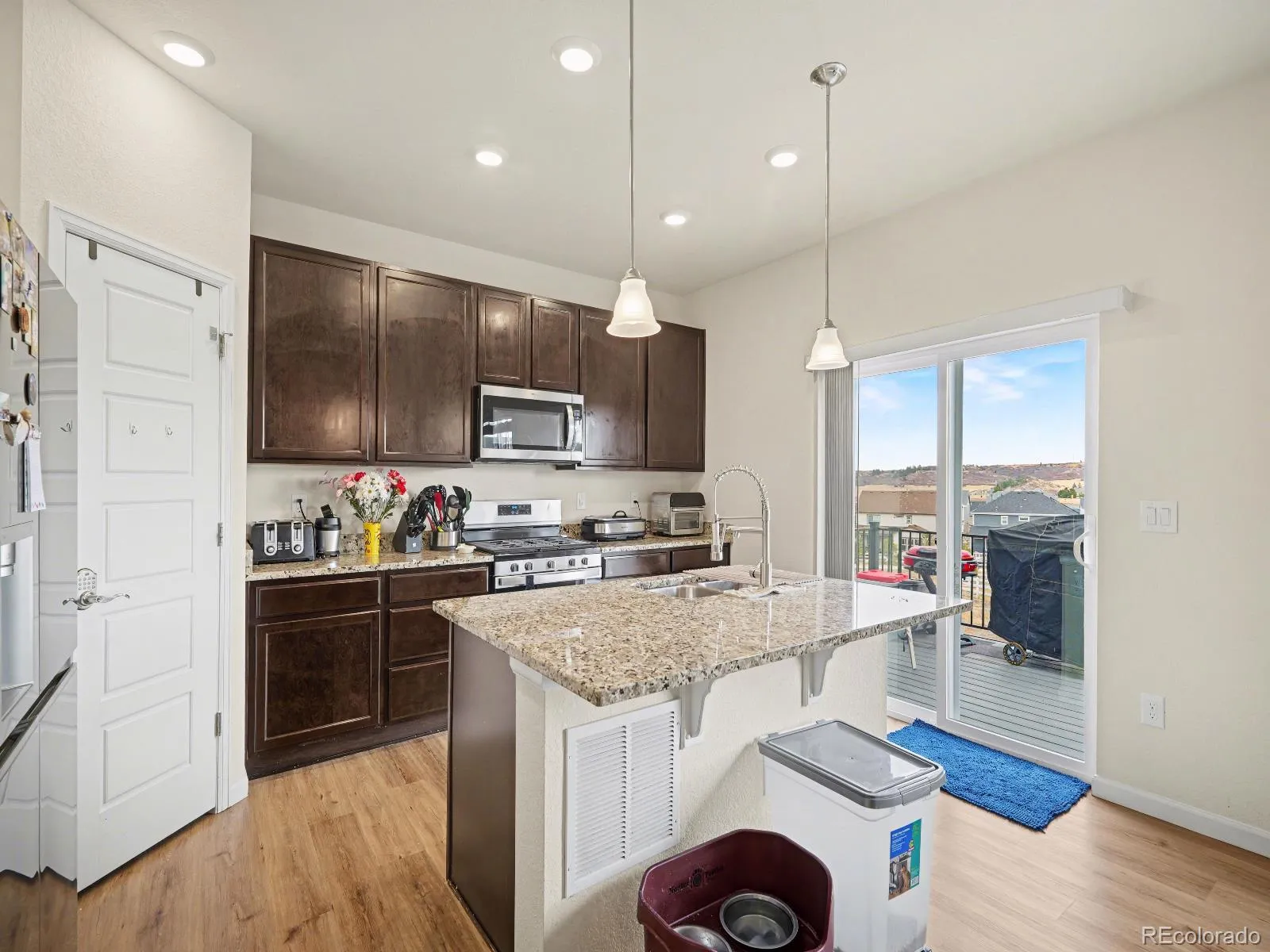 The open-concept main level features durable luxury vinyl plank flooring and plush carpeting. The heart of the home is the expansive kitchen, complete with center island, stainless steel appliances including a gas range, granite countertops, walk-in pantry and abundant cabinetry. The adjoining living and dining areas flow seamlessly, offering plenty of natural light and direct access to the extended deck.