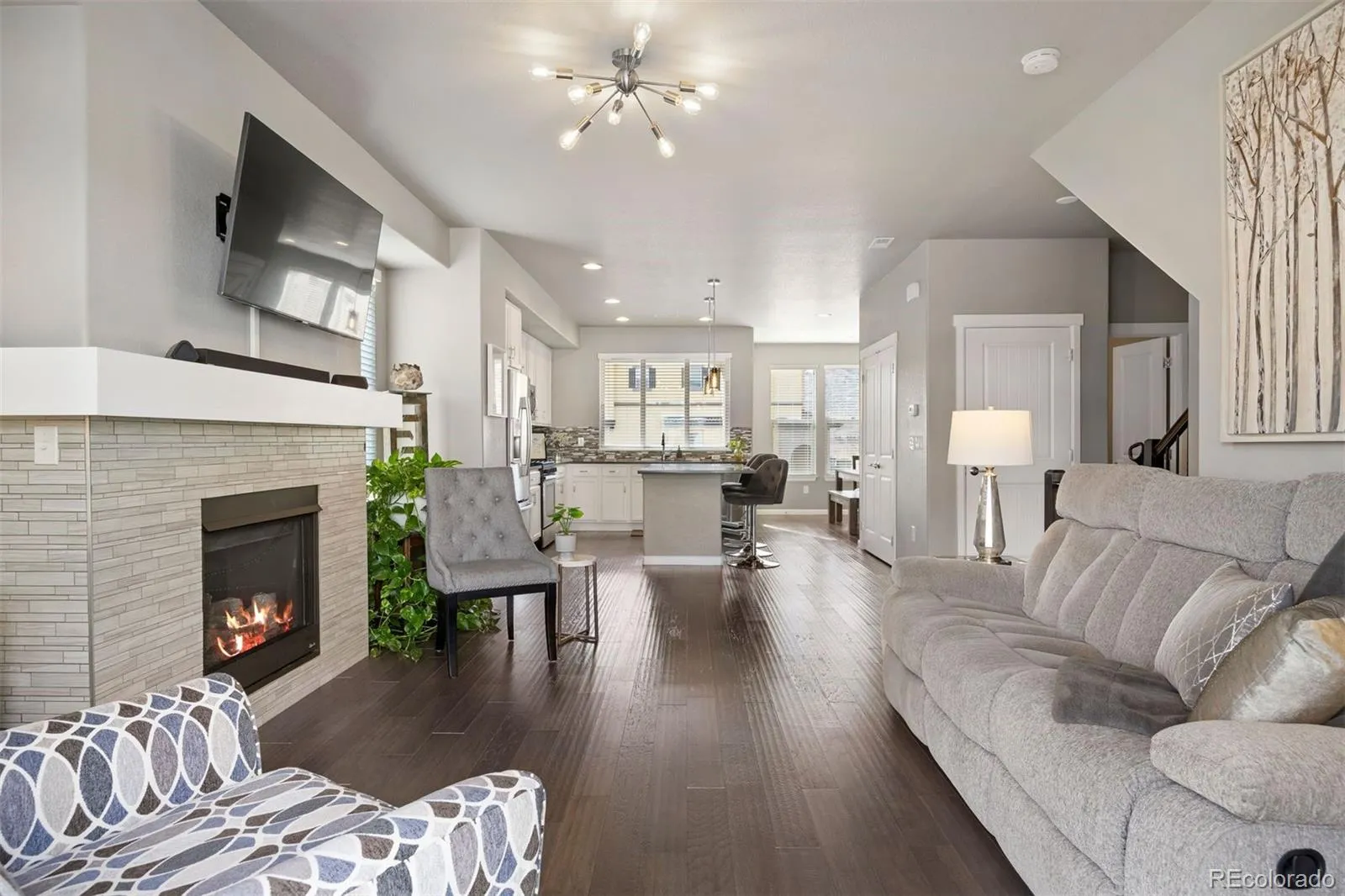 This beautifully maintained end-unit townhome is filled with abundant natural light and sweeping mountain views from every bedroom. The main level showcases high-end finishes throughout, including a stunning kitchen with quartz countertops, an oversized island perfect for casual dining, stainless steel appliances, pantry, separate dining area, and direct access to the private back patio.
