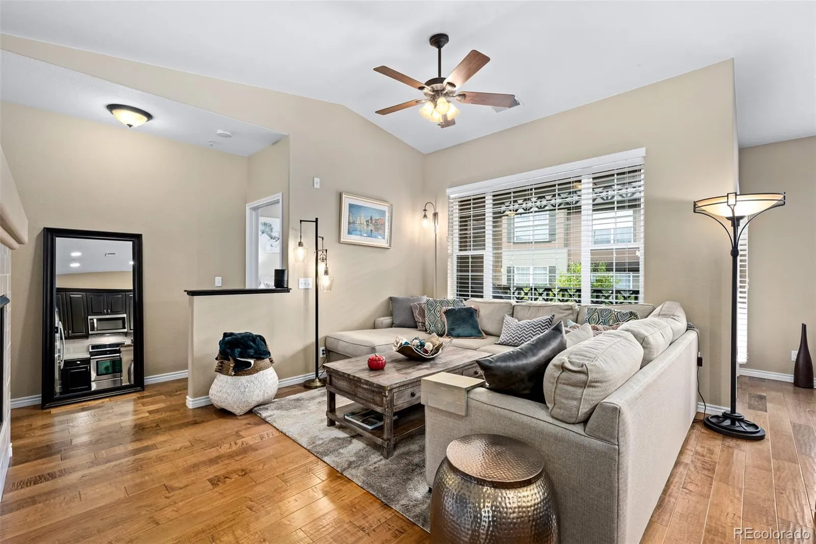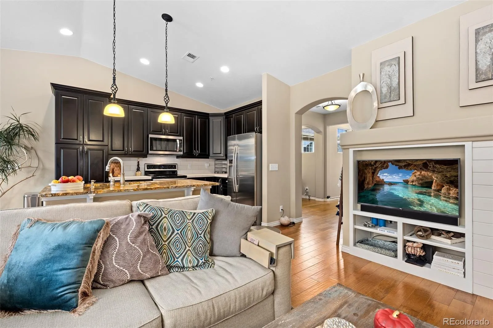 • Dramatic living room with vaulted ceilings, tiled fireplace, and oversized picture window