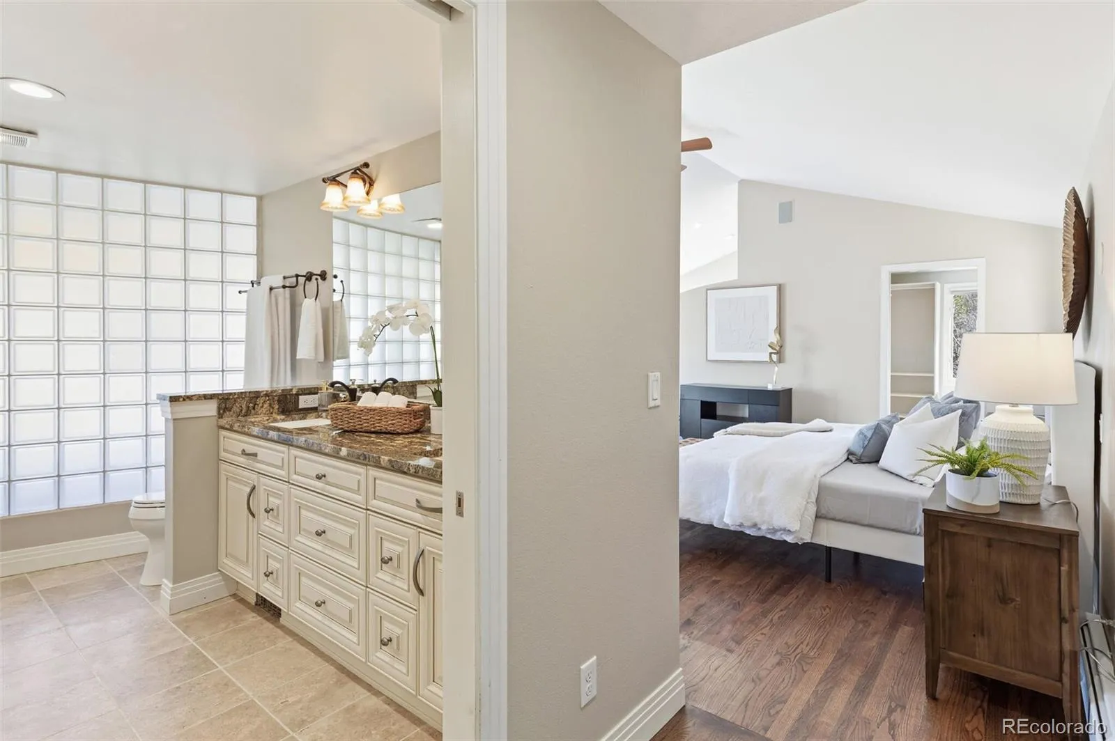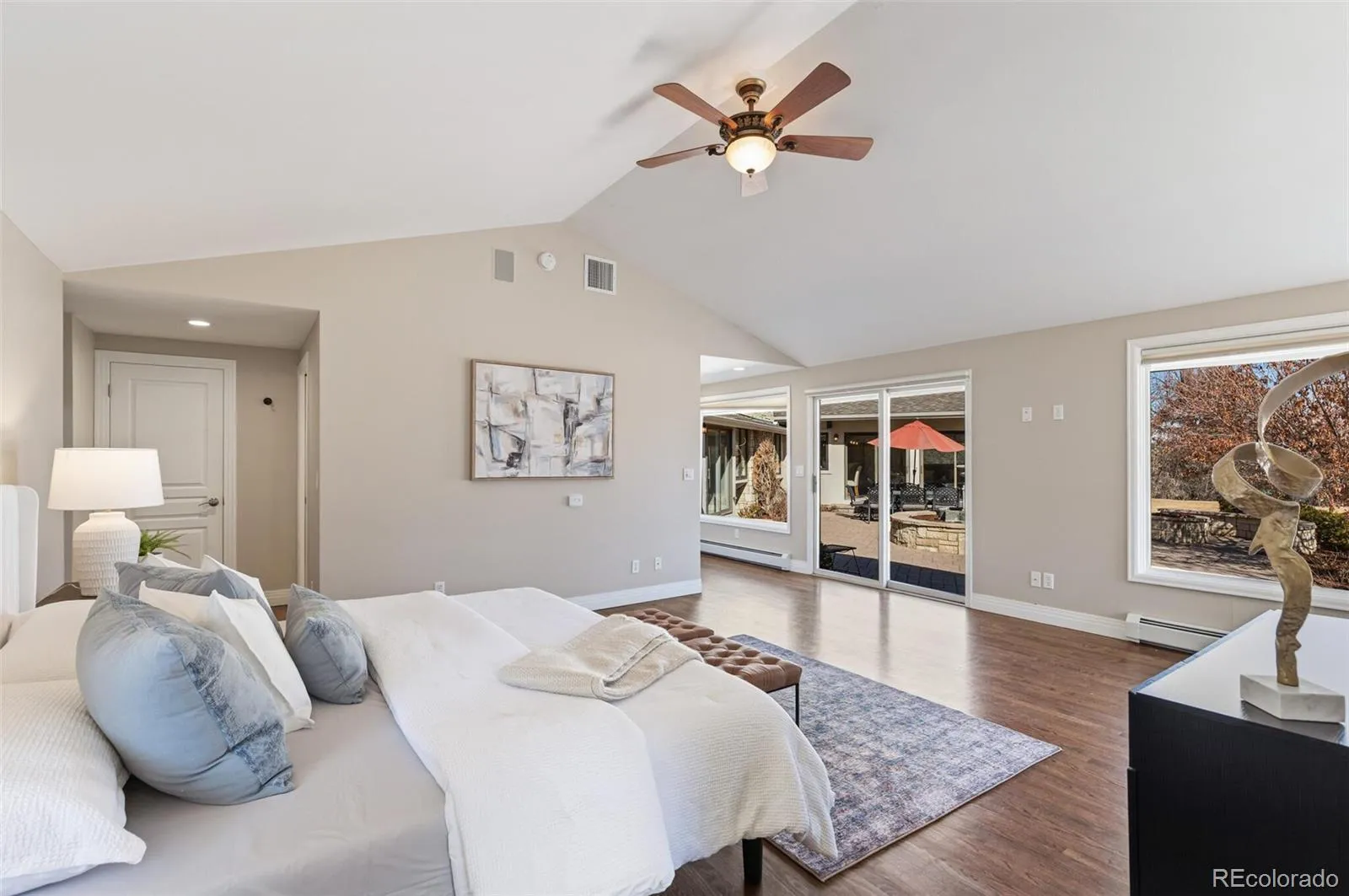 Five bedrooms are situated on the main level, offering comfort and convenience. The vaulted Primary suite has a wall of glass windows and sliders that lead out to the gardens and private patio is positioned on one side of the home while the secondary bedrooms are thoughtfully situated on the opposite wing-creating exceptional separation and privacy. The Primary has a bonus area that could be makeup station/office or dressing space. The vaulted family room is framed by dramatic walls of windows and anchored by a fireplace, while a secondary hearth room fireplace creates an additional intimate gathering space.