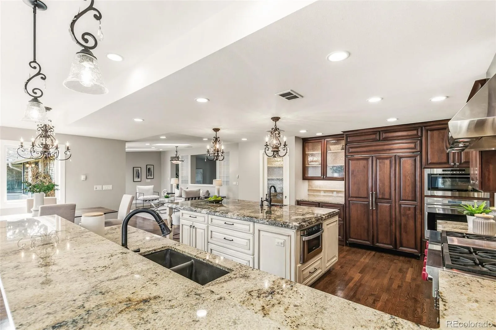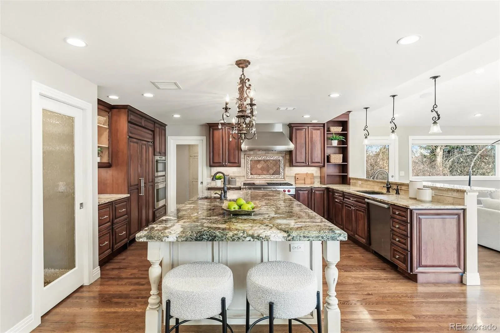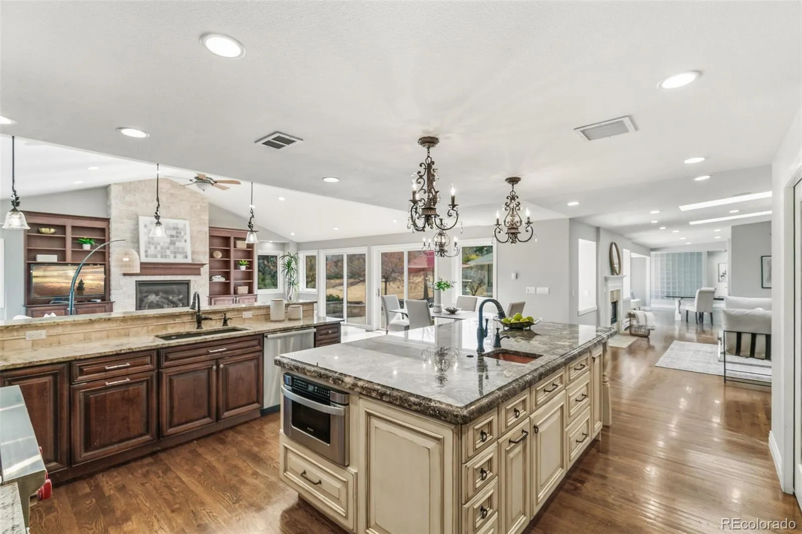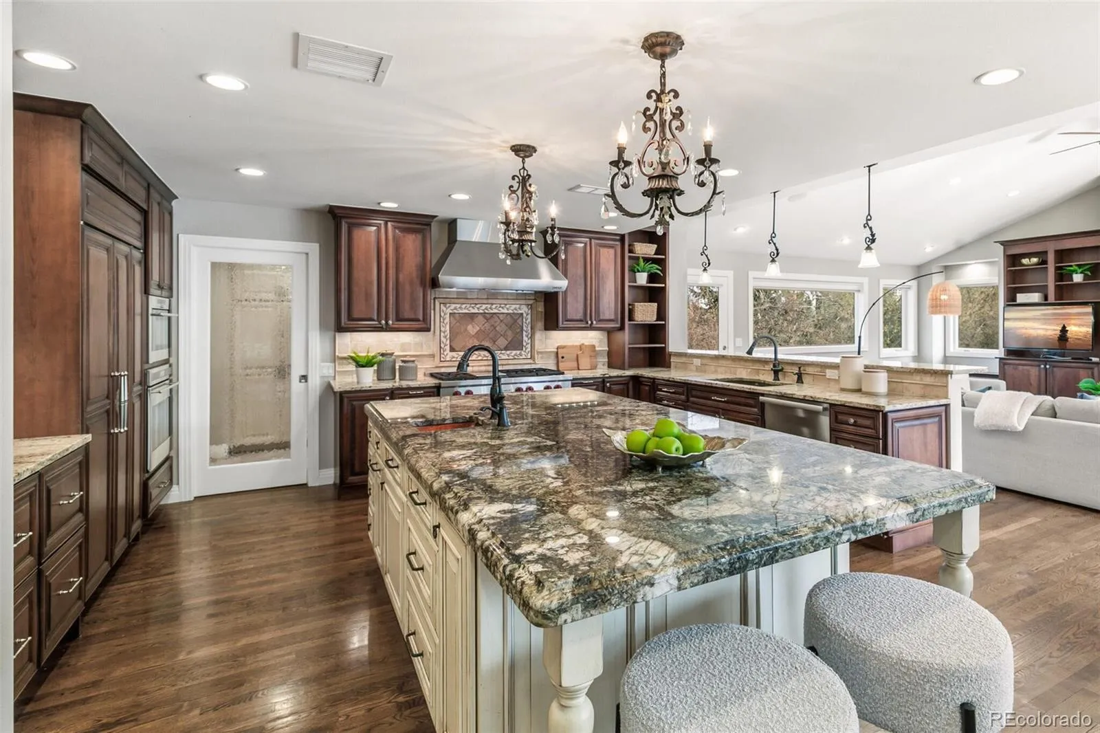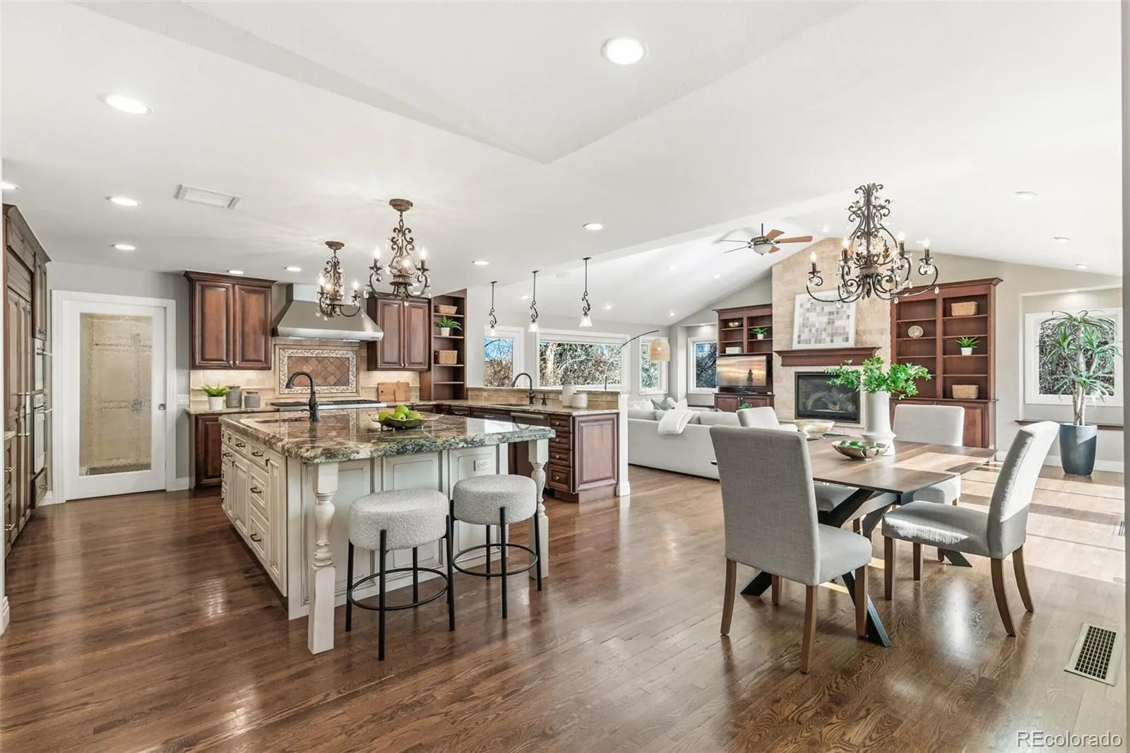Inside, this six-bedroom, five-bath residence blends timeless craftsmanship with livable luxury. Rich hardwood flooring flows throughout the main level, complementing a thoughtfully designed floor plan. The gourmet kitchen serves as the heart of the home, featuring a generous center island, breakfast bar with copper prep sink, spacious informal dining area, and a large walk-in pantry with custom cabinetry. A formal dining room and main-level office provide both elegance and everyday function.