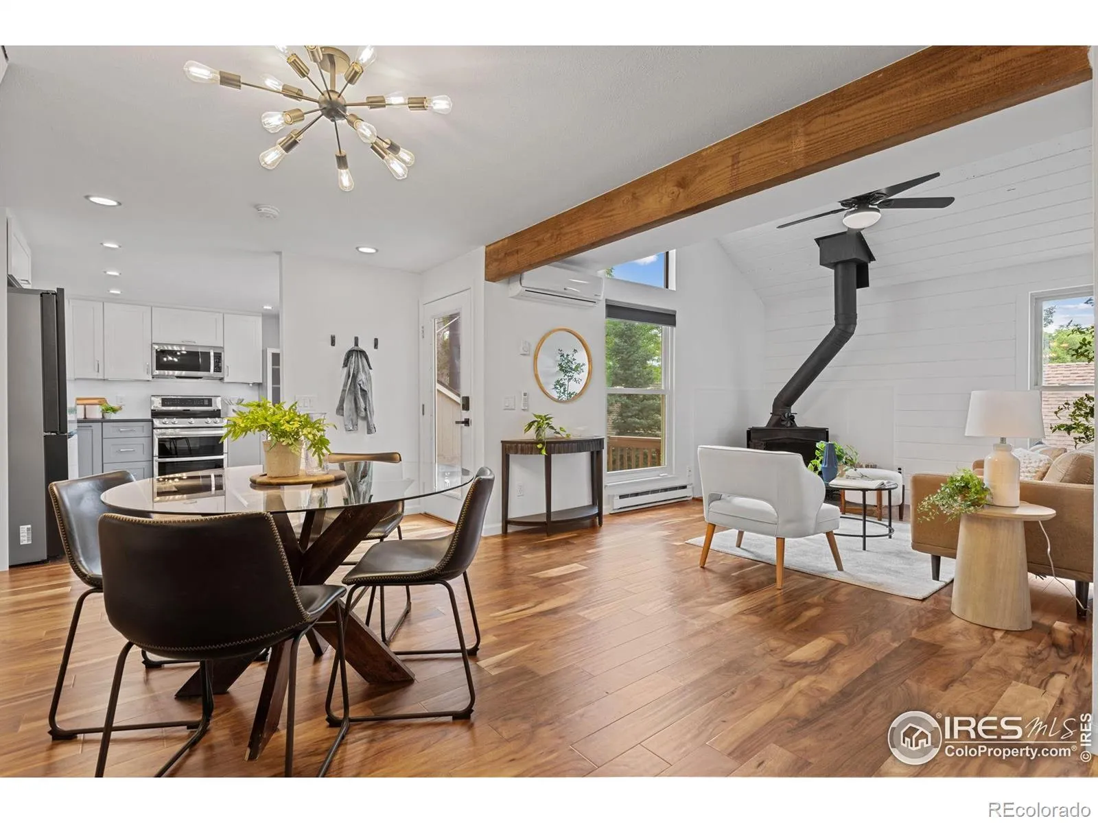 Breathtaking views of the Flatirons and Devil’s Thumb from this beautifully updated Shanahan Ridge S Boulder home, just steps from open space & trails. With vaulted ceilings and two-level living, this residence blends timeless architecture with modern upgrades. The reimagined and fully remodeled kitchen is a showpiece: solid wood cabinetry, eased-edge concrete quartz countertops, apron sink, floating shelves, mobile island, dual convection oven, LG microwave, Delta Pivotal Pull Down Touch faucet and a Samsung Bespoke 4-door glass-paneled refrigerator with beverage center. Comfort is front and center with a high efficiency 4-head mini-split heating and cooling system- ensuring zoned year-round comfort. The gorgeous wide-plank acacia engineered hardwood floors, newer flat weave carpet, LED recessed lighting, and a Lente lighting fixture, elevate the interiors. The main floor half bath room with a new vanity, stackable washer/dryer, and the living room features a cozy wood-burning fireplace maintained annually by the HOA. Upstairs, the primary bedroom showcases unmatched mountain views of Boulder’s iconic Devil’s Thumb and Flatirons, and the 2nd bedroom that could also serve as the perfect office. Outdoor living features a 180sf private and quiet southwest-facing deck with inspiring vistas, plus a hardscape stone patio below with low-maintenance plantings. The oversized one-car garage provides space for a vehicle plus storage. Additional parking is easy and available around the community. Community amenities include a neighborhood pool, trash, and snow removal. This pet-friendly neighborhood is lined with open space and offers quick access to Shanahan Ridge Trailhead, South Boulder Rec Center, Table Mesa shops, including Whole Foods, King Soopers, Illegal Petes and so much more. HOA allows for short term rentals within the City of Boulder rules – get ready for Sundance 2027! Don’t miss this fully updated move-in ready home where all the work has been done for you!