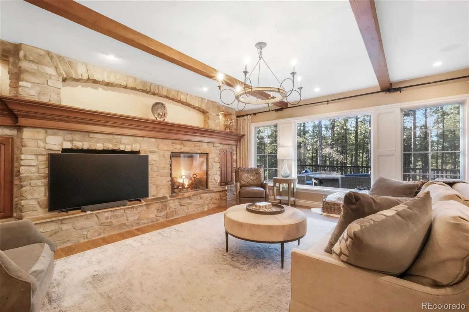 Nestled on 4.31 serene acres at the top of a private cul-de-sac, this 5,937 sq. ft. custom home in the exclusive gated community of High Forest Ranch offers a rare blend of luxury, privacy, and elegance. With 5 spacious bedrooms, 4 bathrooms, and a 3-car heated garage, this residence is thoughtfully designed for both comfort and entertaining. From the moment you enter the grand foyer with heated tile floors, you’ll appreciate the craftsmanship and attention to detail. A private study with built-in wood shelving and glass French doors sits to the left, while to the right the formal sitting room features a gas fireplace and elegant built-ins. The expansive family room boasts a dramatic stone fireplace with wood mantel, large windows, and natural light throughout. The gourmet kitchen is a chef’s dream with high-end Wolf appliances, custom cabinetry, leathered granite countertops, a center island with vegetable sink, walk-in pantry, and a charming breakfast nook with built-in desk and deck access. A butler’s pantry connects to the formal dining room which has an additional outdoor deck. Upstairs, the luxurious primary suite includes a gas fireplace, private deck, spa-like bath with heated floors, standalone tub, large shower, dual vanities, and dual walk-in closets. Two additional bedrooms share a Jack-and-Jill bath, and a loft area offers built-in desks and a cozy window seat. The walk-out basement includes two more bedrooms, a wet bar, rec room, family room with fireplace, and ample storage. Outside, enjoy the built-in fireplace under a pergola, hot tub, and the beauty of mature trees. Additional features include paid-off solar panels w/ Tesla storage system, Russound MCA amplifier, invisible dog fence, custom lighting, hot tub, exterior fireplace, garden beds, exterior landscape lighting and so much more. Located just off Hwy 83, with quick access to Colorado Springs, Monument, and Denver—this is truly a must-see home.