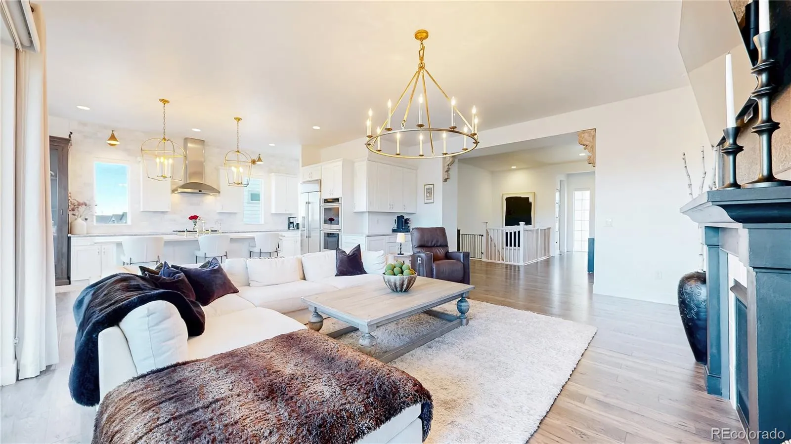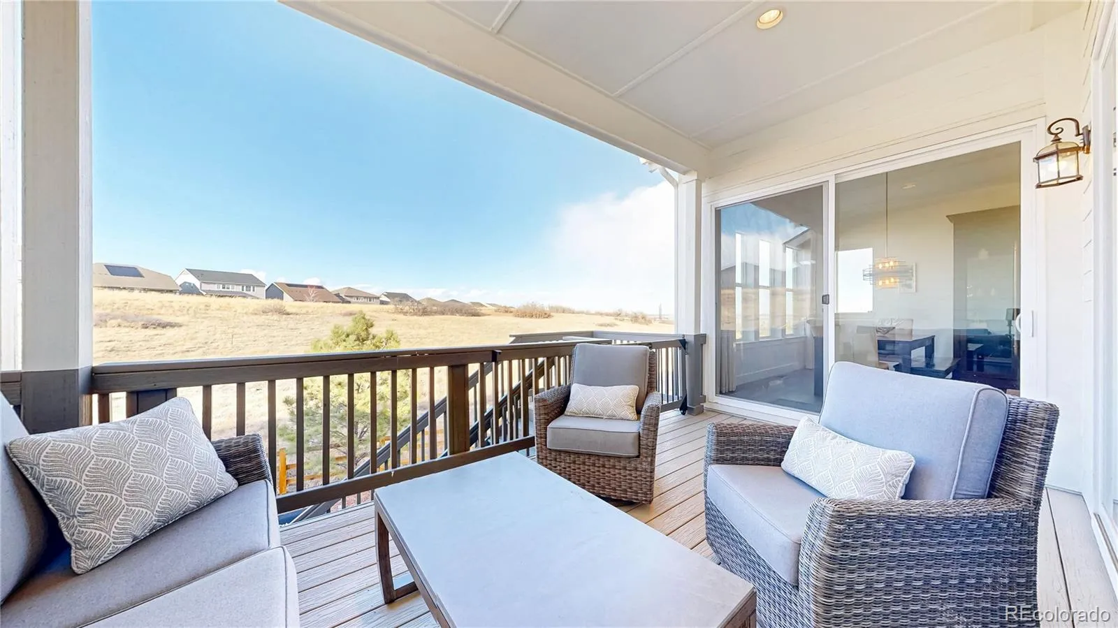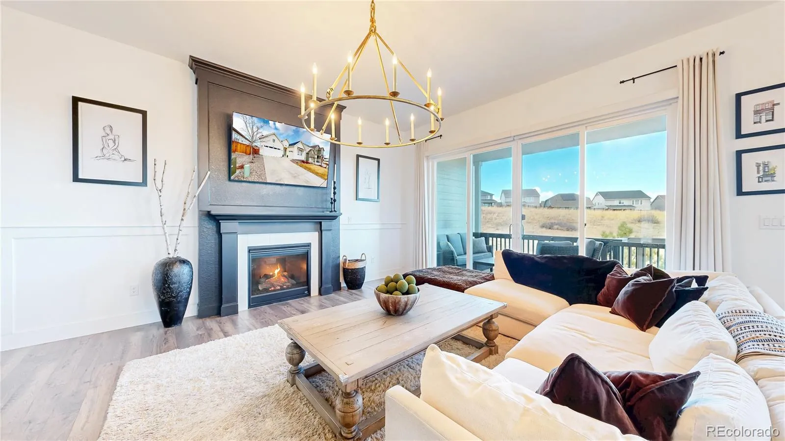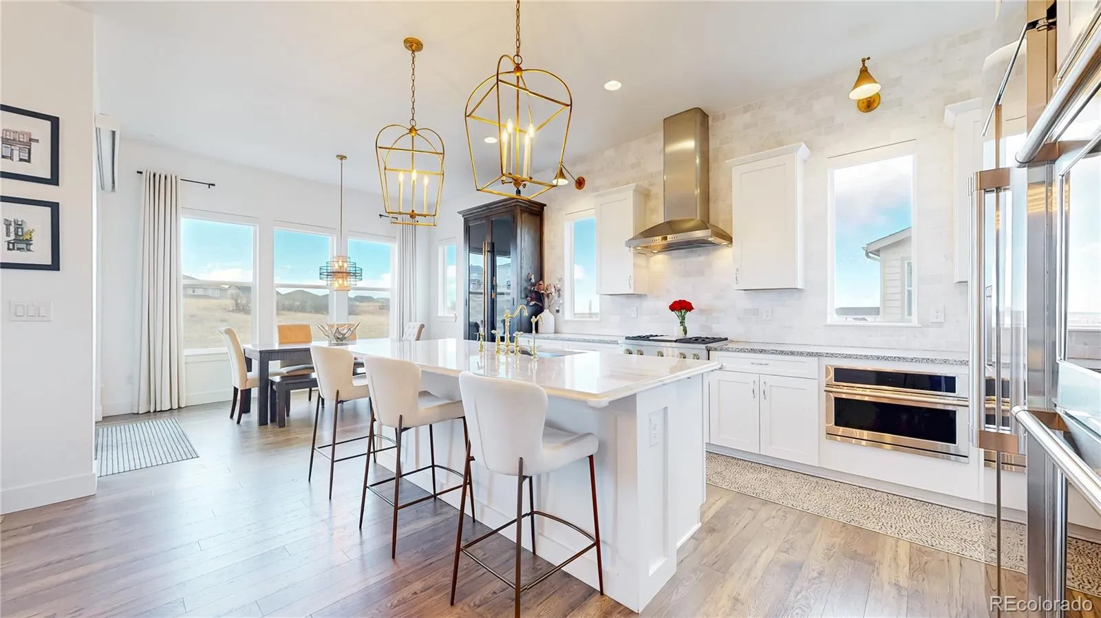 Ranch living at its finest in an exquisite Castle Pines home with a modern farmhouse elevation, backing to open space with mountain views. Live in this newer home with all the custom upgrades and designer finishes already added. From high-end flooring to elegant fixtures, wood trim accents, marble backsplash and mont blanc quartz counters. The spacious, open floor plan with 10 foot ceilings allows for seamless flow and natural lighting flooding the space. The main floor has 2 bedrooms with two ensuite baths, including the the primary with an oversized stunning glass enclosed marble shower. In addition, a large modern office space with black steel modern French doors, mudroom with custom built-ins. The living room has a statement chandelier & modern black fireplace. The stunning kitchen features a 9 ft mont blanc quartz island, gourmet appliances, white shaker soft close tongue and groove cabinetry, striking gold pendant & sconce lights & white carrera marble backsplash to the ceiling. The dining space is just off the kitchen and overlooks the greenspace. All of the windows are shaded with custom Restoration Hardware drapery/window coverings. The large elegant master bedroom overlooks the private backyard and connects to the primary bathroom. Dual vanities, a built-in makeup counter, upgraded tile in the large walk-in shower with dual showerheads. The spacious walk in closet connects you to the laundry room, which showcases black and tan checkered tile. The walk out finished basement houses 2 additional bedrooms, a full bath, a living room with a beautifully designed dry bar, black shiplap, beverage fridge, & quartz counters. The most unique feature of all is the hidden additional basement space you’ll discover behind the armoire doors. Step outside into the landscaped yard with 15 ft pine trees, 2-tiered deck, large brick patio oasis. Throughout the year, large elk herds/deer gather in this open space, creating a remarkable sight paired with breathtaking sunrises.