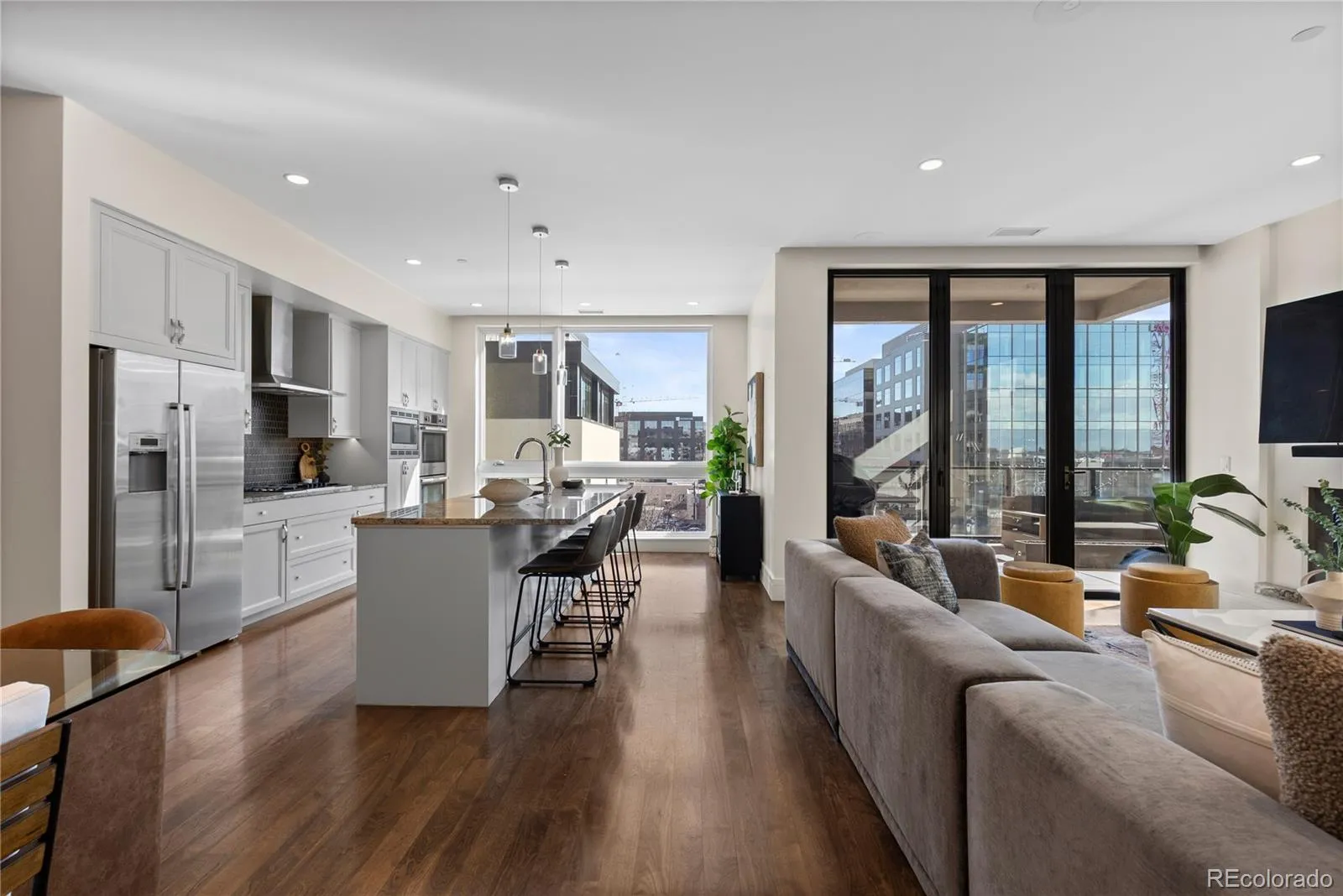 The open floor plan is framed by floor-to-ceiling windows & enhanced by folding glass NanaWall doors, creating a seamless connection between the main living area & private terrace.