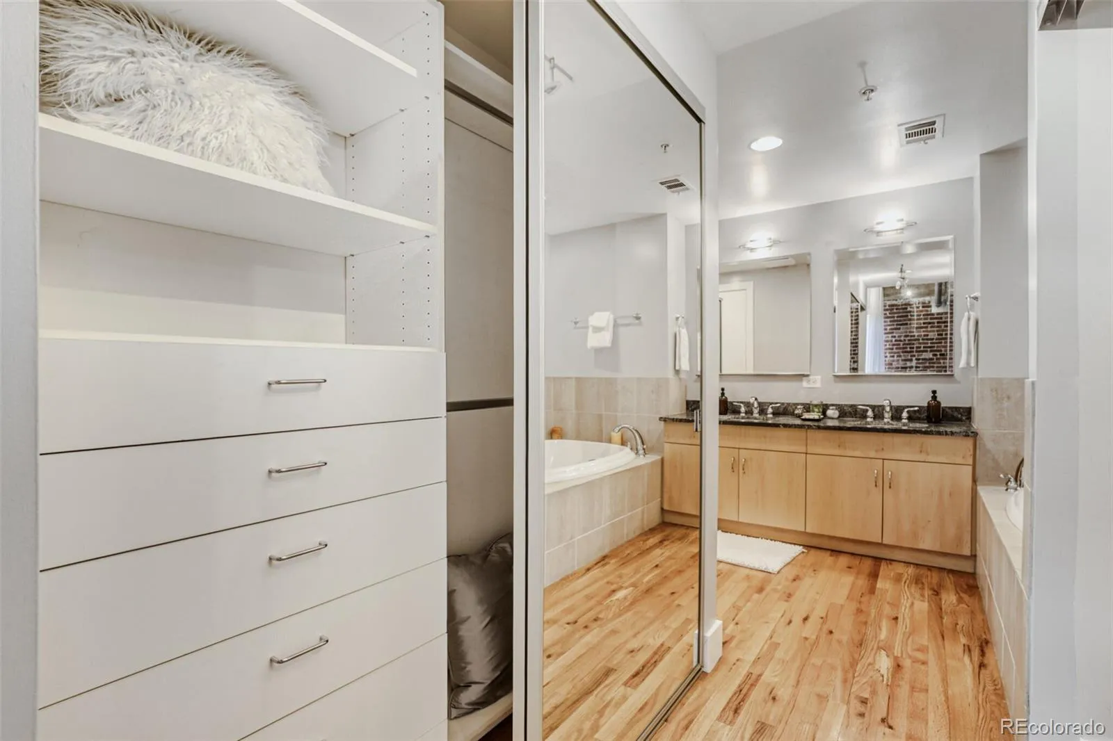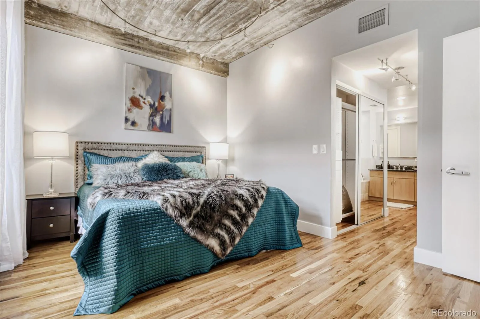 Luxury end-unit loft on the 5th floor of iconic Steelbridge Lofts, featuring 2 bedrooms (including one non-conforming flex-space bedroom), 2 bathrooms, and 2 parking spaces, just one block from Union Station.Originally built in 1919 as a warehouse for the Great Western Sugar Company and converted to residential lofts in 2002, Steelbridge Lofts blends historic industrial character with modern urban living. This six-story building features a dramatic five-story central atrium with nostalgic Hollywood photography, a spacious rooftop terrace with grill and entertaining area, and a secure heated garage with storage.This rare end unit offers soaring ceilings and exposed brick walls along the north and east sides, filling the home with natural light while remaining impressively quiet thanks to quality windows and window treatments. The open floor plan includes a chef’s kitchen with gas range, granite countertops, oversized island, and eat-in nook, flowing seamlessly into the dining and living spaces. Hardwood floors throughout and a gas fireplace add warmth and style.The primary suite features a luxurious 5-piece bath and two large built-in closets. A second full bathroom with shower serves guests and the secondary flex-space bedroom. A rendering is included to illustrate one possible use of the second flex space bedroom, with partitions added for sleeping and opened back up for entertaining. This reflects how the original use of space was intended, preserving openness rather than enclosing it with full drywall. Located on the quiet end of Wynkoop Street, which transitions into a historic rail bridge and does not carry through traffic, this home offers immediate access to Union Station, the airport rail line, Cherry Creek Trail, Coors Field, Ball Arena, top restaurants, and Denver’s best cultural venues.Urban luxury in the heart of LoDo.