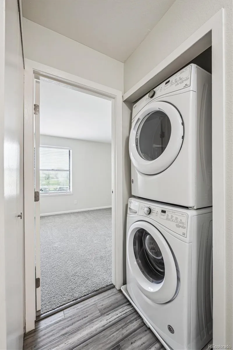 guest bedrooms are both well sized rooms with walk-in closets. The hallway between features an in-unit stackable washer