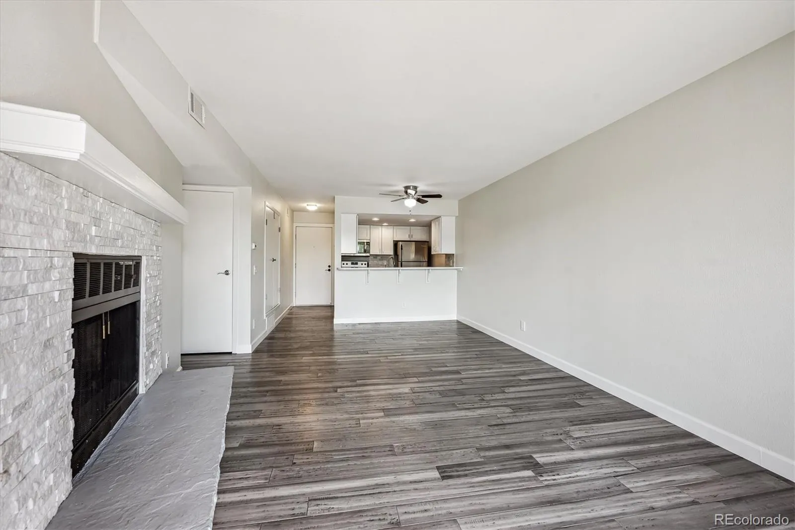 spacious living room with a wood burning fireplace and sliding door that access the outdoor patio. The updated kitchen has