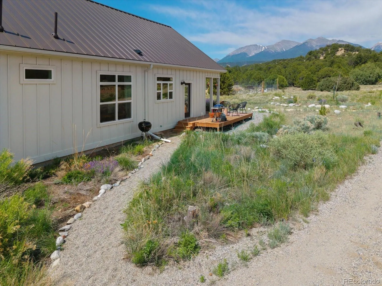 Set on 45.61 acres just minutes from downtown Salida, this custom modular home offers privacy, infrastructure, and usable land that is increasingly hard to find. Built in 2018, the 1,860 square foot residence features 3 bedrooms and 2 bathrooms on the main level, plus a fully framed and insulated upper level designed for a future living area, bedroom, and bathroom, offering excellent expansion potential. Inside, expansive windows fill the home with natural light and showcase surrounding views. The open layout connects the living room, dining area, and kitchen, anchored by a gas fireplace. The kitchen features stainless steel appliances, shaker cabinetry, and a walnut butcher block island ideal for cooking and gathering. Power is supplied by Sangre de Cristo Electric and supported by an owned solar array. Starlink provides reliable high speed internet. Two leased DeLuca propane tanks service the home. A grazing lease with Pridemore Cattle helps maintain agricultural tax status. With no HOA and no covenants, the property offers open views, quiet privacy, and flexibility for future structures or use. A private one mile singletrack trail loops the land, and a bridge crosses the arroyo to a secluded firepit area surrounded by trees. A fenced garden with raised beds is ready for seasonal growing. This is a rare opportunity to own acreage with infrastructure, privacy, and direct access to the Salida lifestyle.