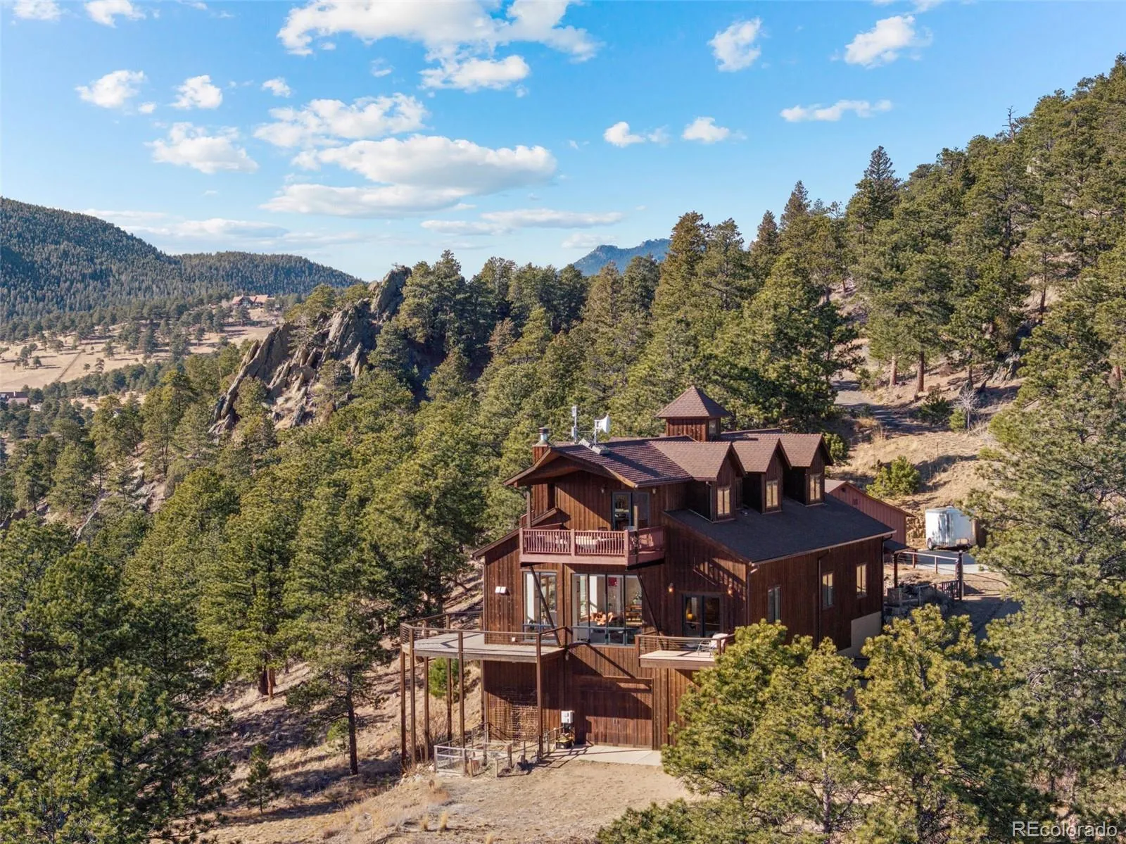 Perched on 35 private acres with true “top-of-the-world” views, this architecturally re-imagined residence delivers the ultimate wow factor — a rare blend of serenity, space and glittering city lights views. All conveniently located in a luxury enclave of just 12 homes with surprising quick access 18 paved minutes from Golden. Originally built as a luxury barn and thoughtfully transformed into a modern, light-filled home, the design celebrates openness and airiness at every turn. The dramatic lofted great room seems to float above the landscape, walls of windows framing sunrises, sunsets, city lights and mountain views that feel almost within reach. Radiant in-floor heat keeps things cozy, while a kitchen designed for gathering makes entertaining effortless. The spacious primary suite includes its own kitchenette/office and wonderful balcony – sleep under the stars! A media room, huge garage, and additional detached garage provide flexibility for hobbies, cars, gear, and guests. Step outside and the experience becomes something special. Expansive decks invite unforgettable nights beneath the Milky Way, hot-tub soaks while deer wander past, and evening sunsets with panoramic views. Up the hill behind the home, a graded path leads to a private RV or camping area complete with electric hookup — your own personal overlook for stargazing nights.The south-facing home and driveway naturally help with snow melt, and you have two garages and plentiful parking and storage. Excellent free internet means working from home is easy… though a quick run to Golden or a nearby café is never far. White Ranch Open Space — with over 20 miles of trails and Golden Gate State Park— are just 5 minutes away. Horses welcome too and well allows for. It feels like a private mountain sanctuary — because it is — yet everyday life remains wonderfully convenient. A rare opportunity to live in your own special paradise! For video, floor plans, 3D tour go to www.27659MistyRoad.com