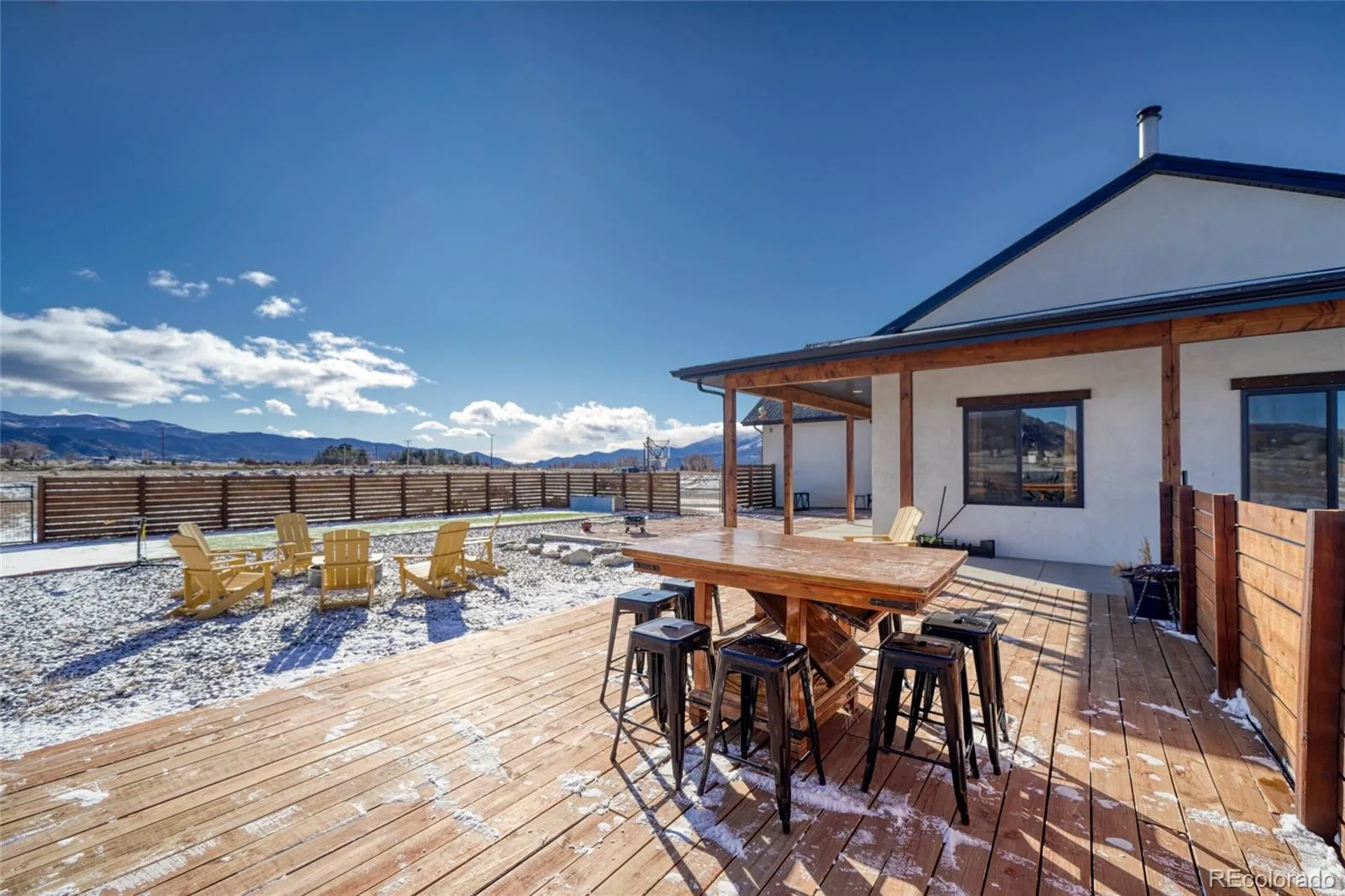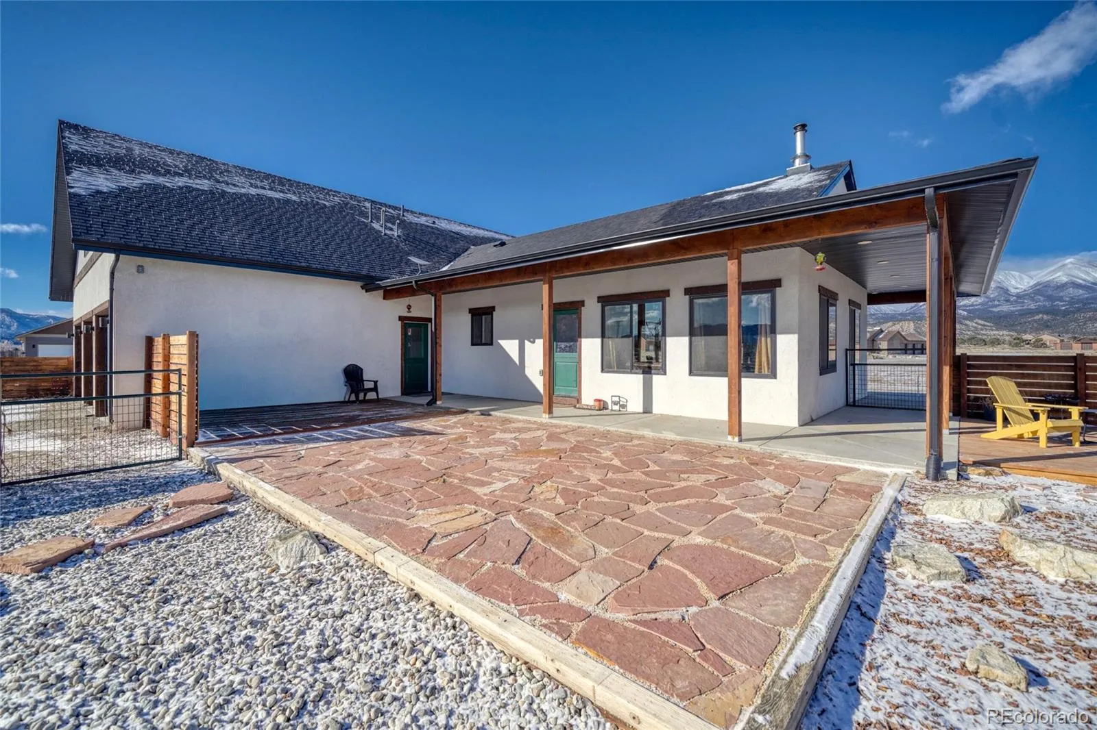 Exterior highlights include a south-facing fenced garden and dog run, additional fenced yard with hot tub pad, flagstone entertaining area, deck, and covered back porch with easy access to a basketball hoop. The acreage provides ample space for future outbuildings, or expanded landscaping. Beautiful wood exterior finishes and an oversized three-car garage complete this private luxury offering in the heart of the Upper Arkansas Valley.