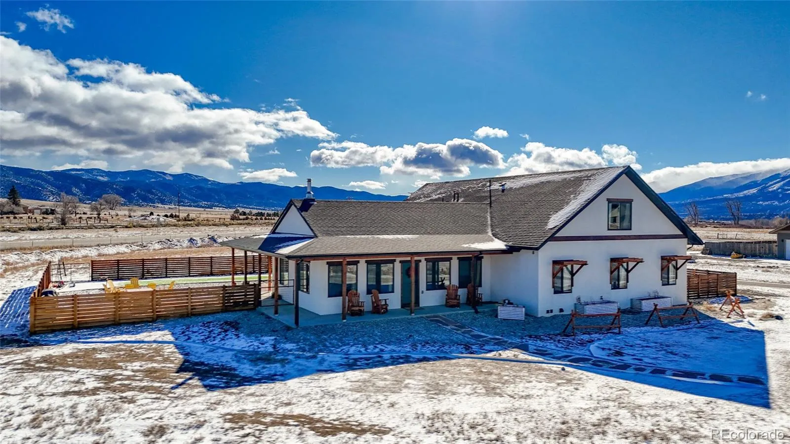 Set on 2 private acres, this 4-bedroom, 3-bath modern farmhouse offers 3,000± sq ft of refined Colorado living. Vaulted ceilings and expansive windows frame panoramic views of Mt. Shavano and Mt. Antero while filling the home with natural light. The open-concept great room, anchored by a wood-burning stove, flows seamlessly for elevated everyday living and effortless entertaining.