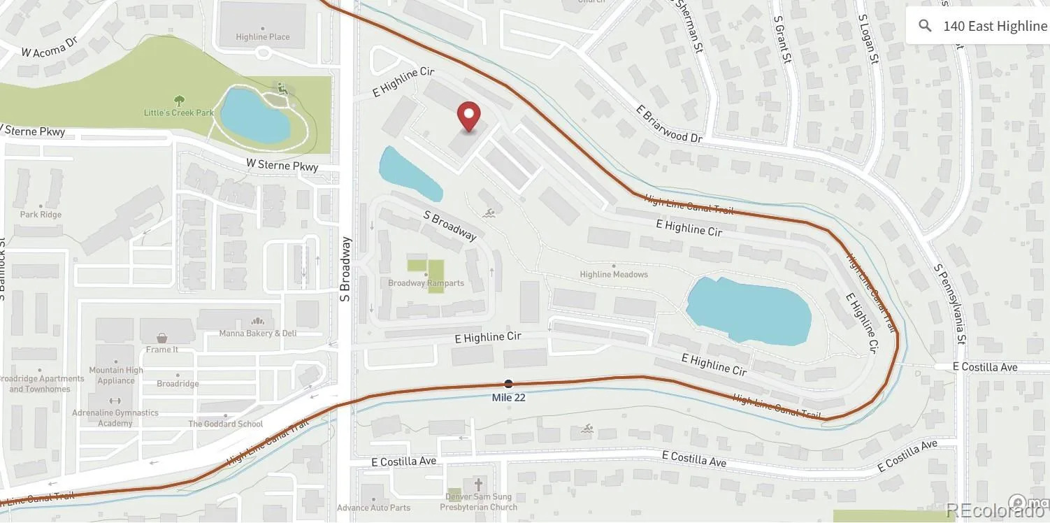 Take Highline Circle off Broadway, East past the buildings to the first right and go staight down and park overlooking the lake in the guest parking. The entry is on the South side of the building.