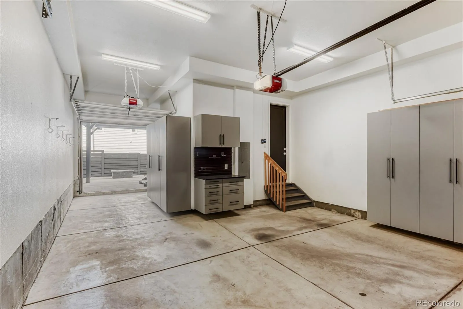 The patio can also be accessed from the three-car garage that features a second garage door that serves as a pass-through to the backyard. The garage features abundant built-in storage, and ample space for organization.