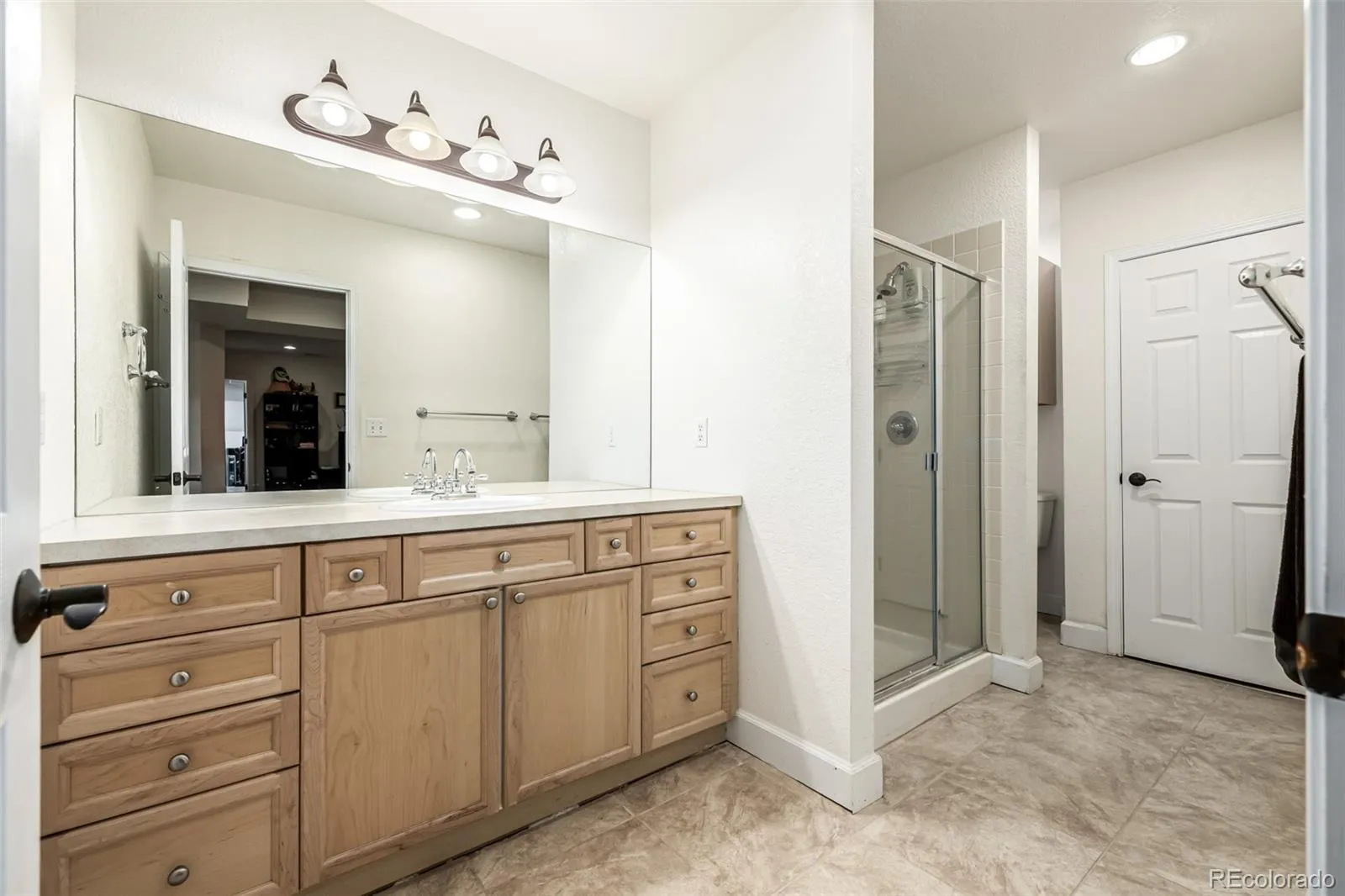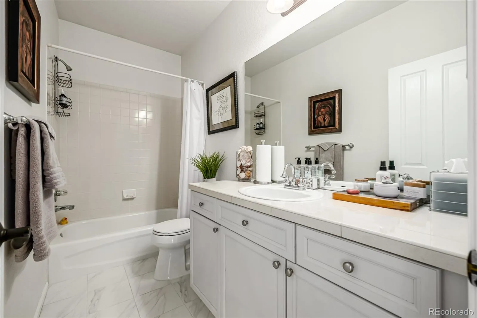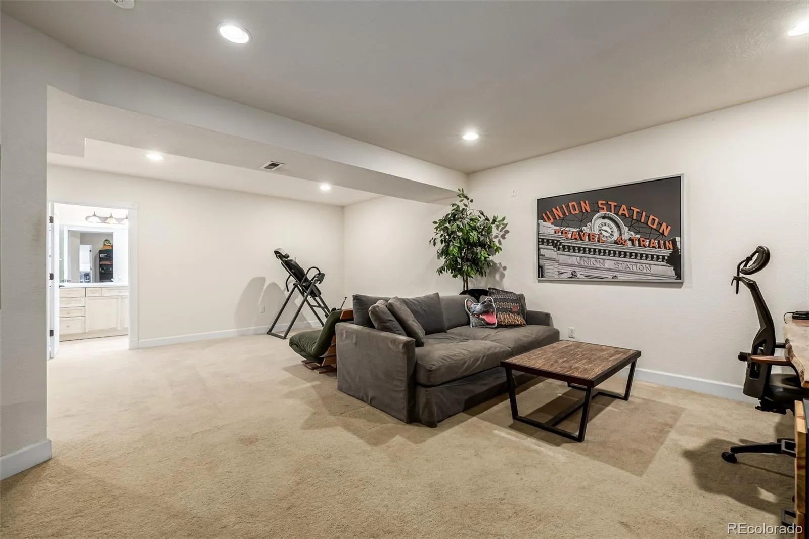 Looking for a home with a main floor primary suite, with plenty of space to host, and close to all that Denver has to offer? This is the home for you! Perfectly situated on a corner lot, this beautifully maintained home offers the perfect balance of style, comfort, and thoughtful updates. With fresh interior paint and new carpet (2024), this home is move-in ready and shines with modern appeal. The open-concept layout is filled with natural light, and the wood floors add warmth and sophistication throughout the main level. The kitchen features custom designer soft-close cabinets with pull-out organizers, quartz countertops, a designer backsplash, a breakfast peninsula, and high-end appliances: a Samsung 4-door refrigerator with a beverage drawer and a Kenmore Elite induction stove. The main floor primary suite offers a peaceful retreat with wood shutters for added privacy, a walk-in closet, and a 5-piece bathroom. The main level has 3 bedrooms. One can be used as a bedroom or an office. In the finished basement, you’ll find a bedroom, a ¾ bath, a large living area, a bonus room, and an unfinished storage or workshop space. Enjoy warm Colorado days on your brick patio beneath a switch-activated retractable awning, surrounded by a fully fenced yard. Sprinklers in the front and side yards make maintenance a breeze. The home includes a 1-car garage with exterior access plus a 2-car garage with direct entry into the home, offering convenience, storage, and security. Additional updates include two Bradford Hicks water heaters (2024), a Samsung top-load washer, a Maytag dryer, quality interior wood shutters, and maintenance items such as roof repairs, a raised garage floor, and a reconditioned electrical panel for peace of mind. Walkable to Lowry’s town center, best parks, trails, dining, shopping, and top-rated schools, this is your opportunity to own a thoughtfully updated home in one of Denver’s most sought-after communities.