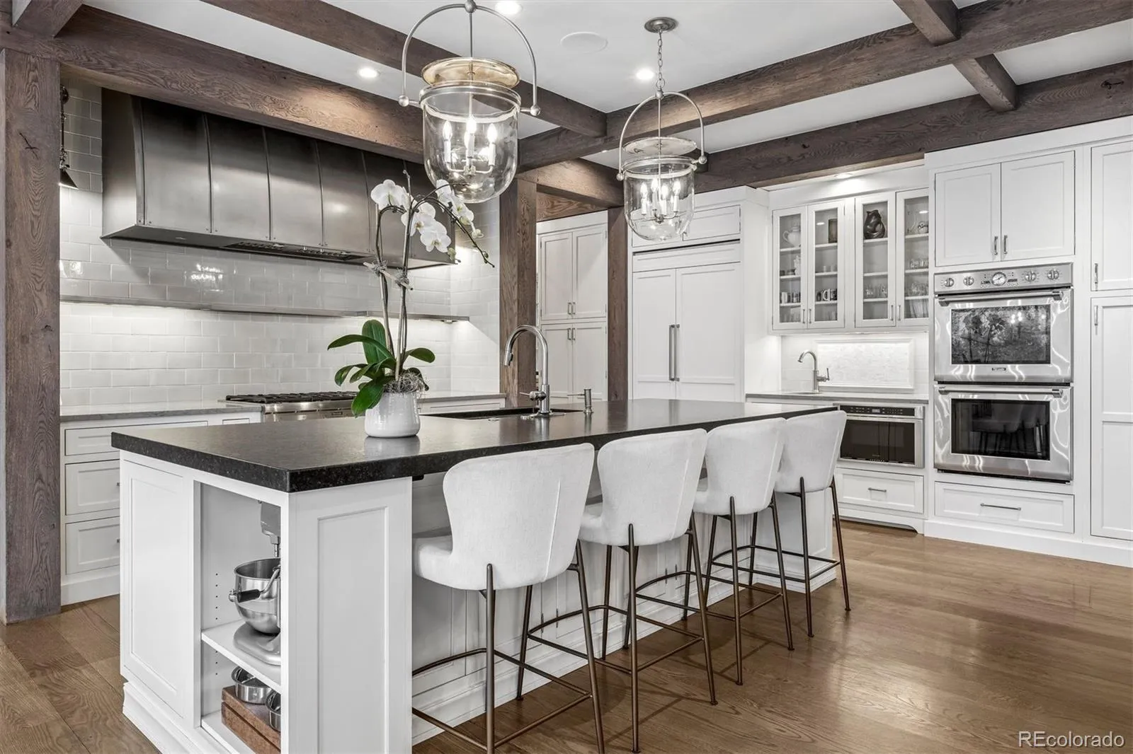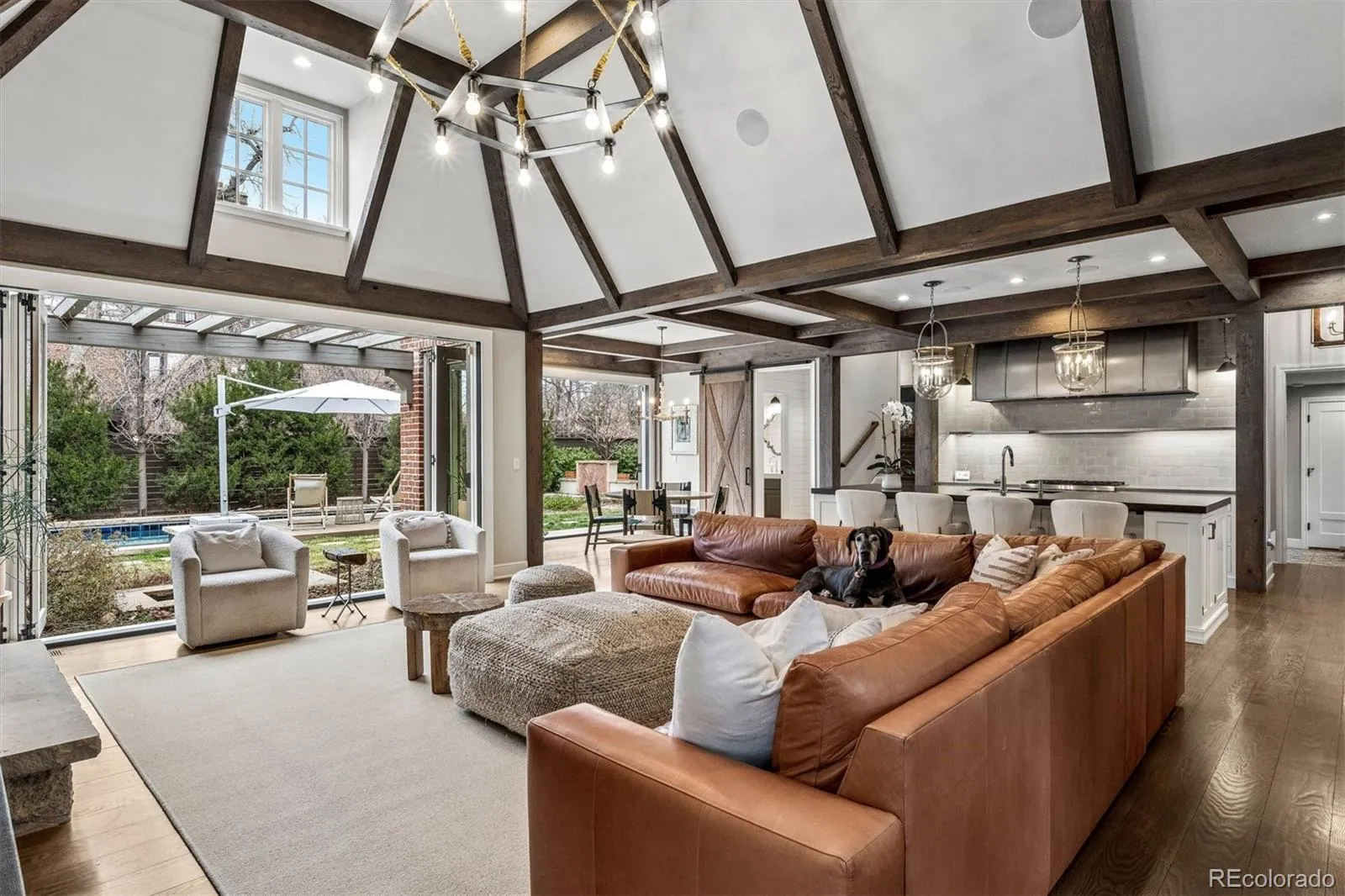The main level is centered around a chef’s kitchen with Thermador appliances and an oversized island, opening to a family room with beamed ceilings, custom built ins, and fireplace. Large accordion doors connect directly to the outdoor living areas.