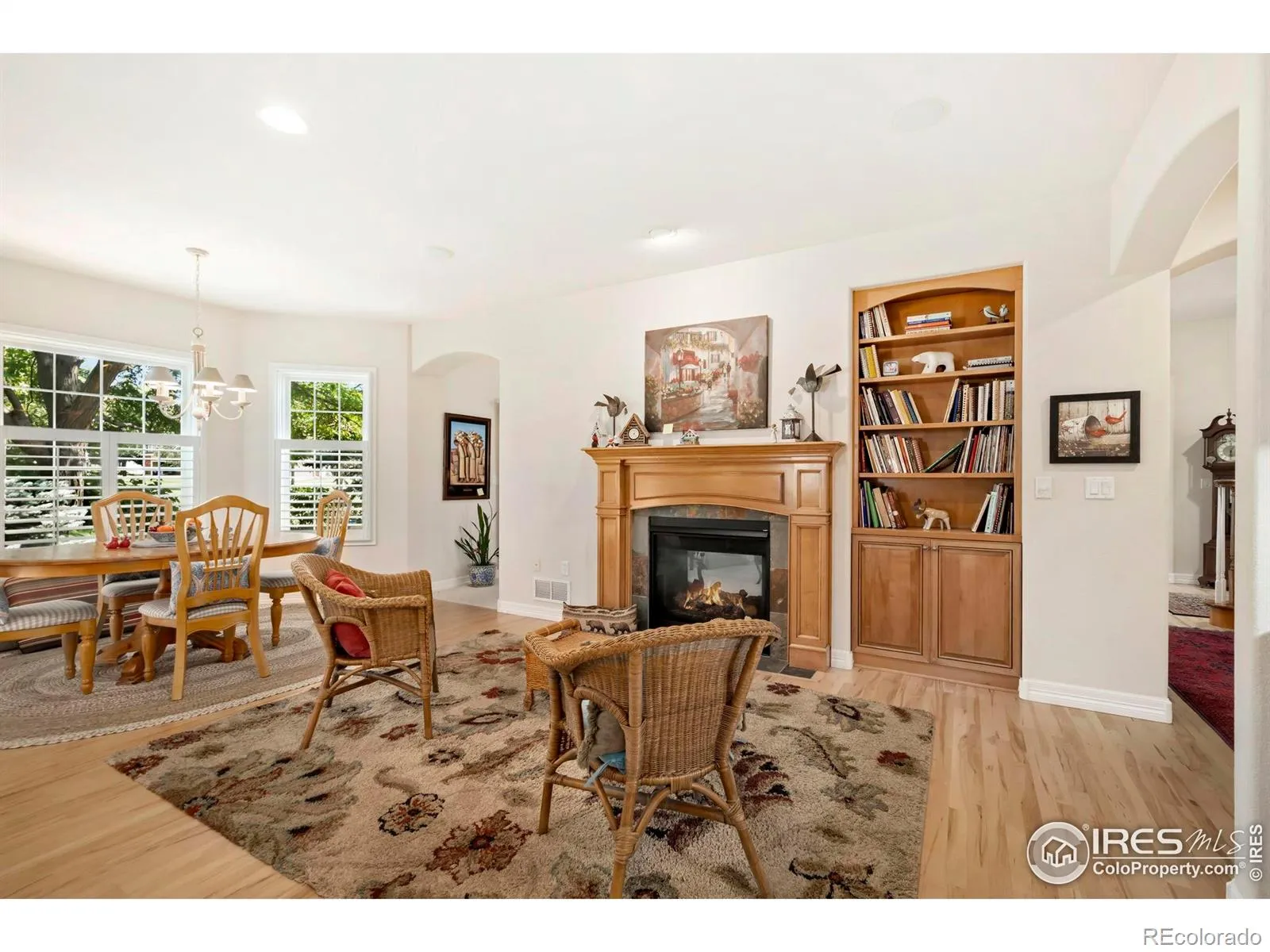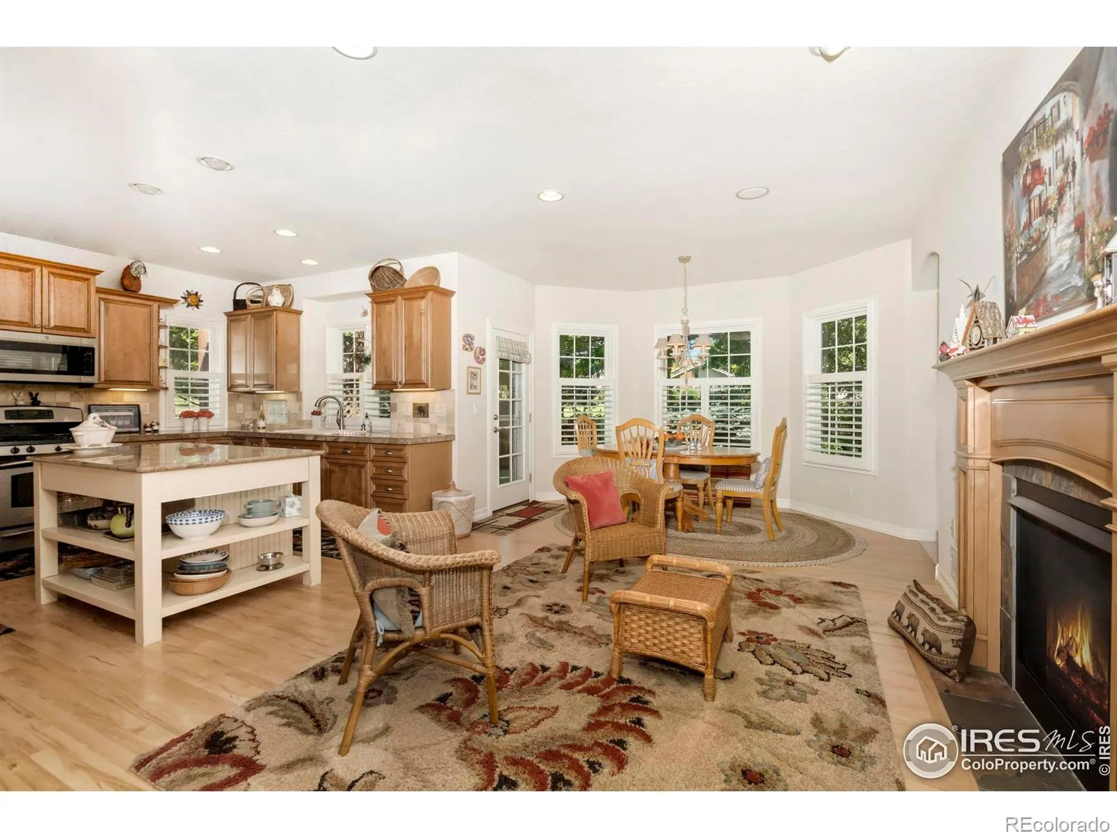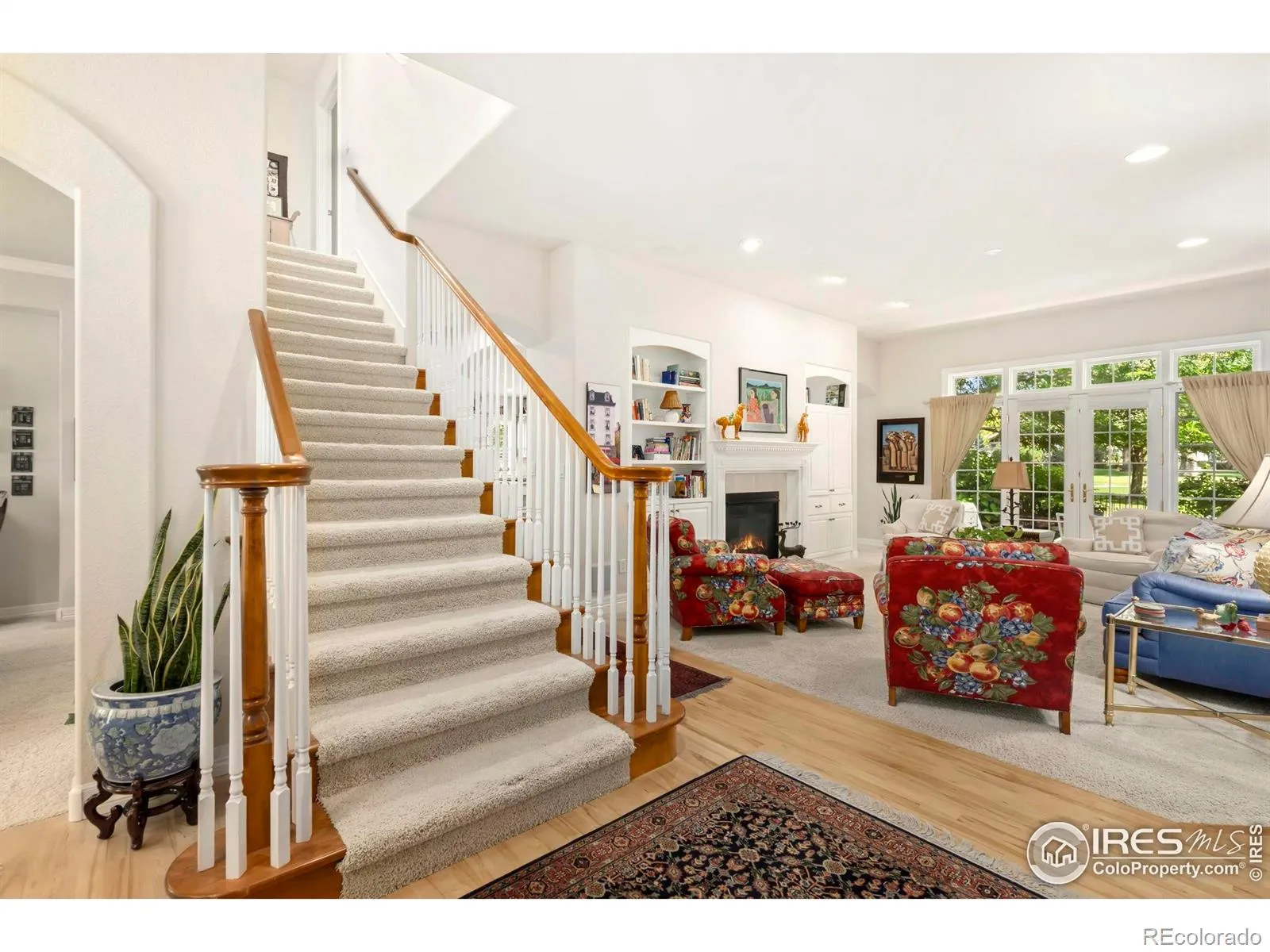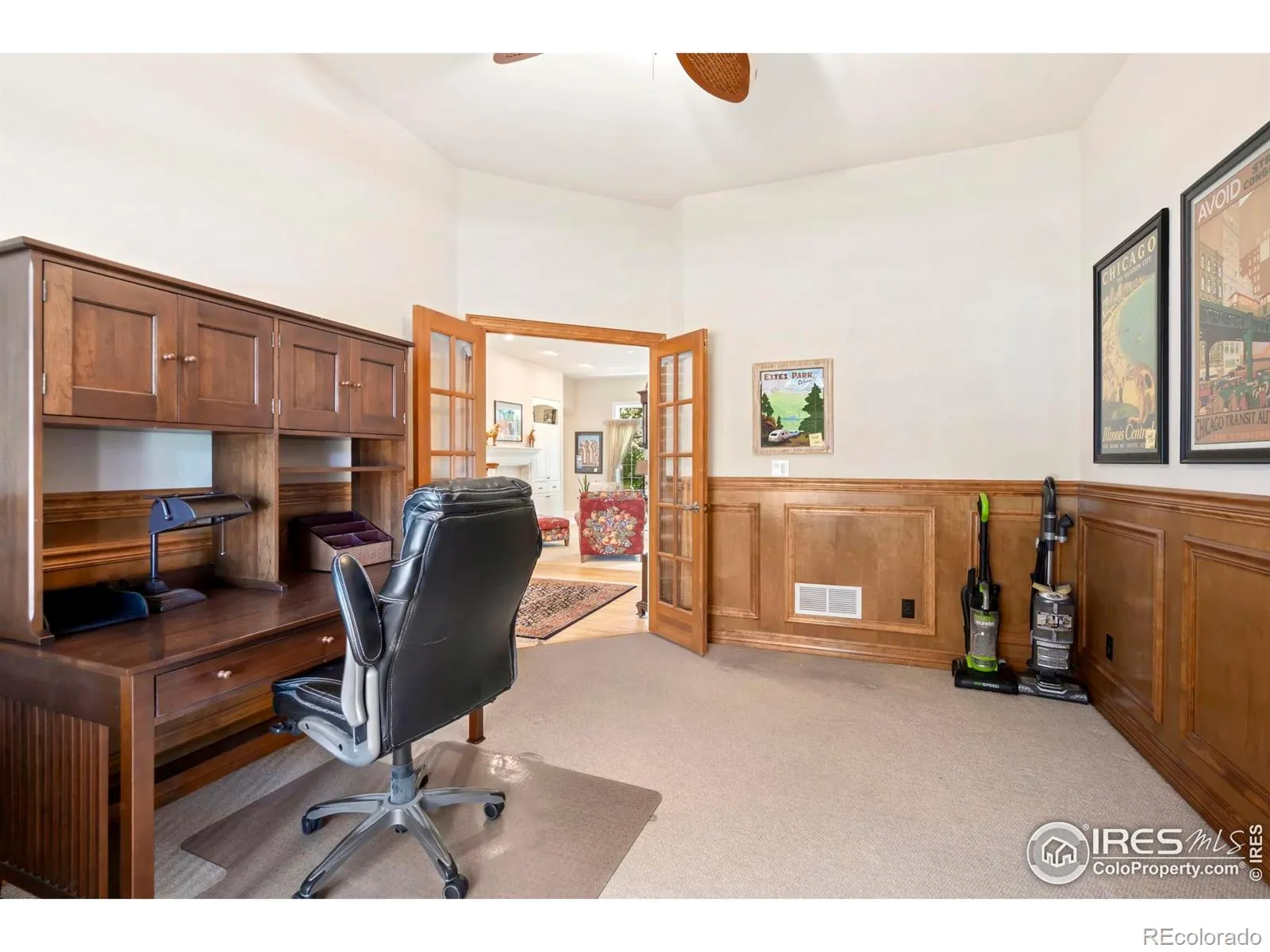 Situated on the 8th fairway of Southridge Golf Course, this custom home sits in a quiet cul-de-sac with beautiful finishes throughout. The main level features a spacious primary suite, private office, and a library-style great room with walkout patio. The kitchen offers a large island and hearth-side seating with a see-through fireplace. Plantation shutters add elegance. Enjoy Southridge Greens living near trails and top Fort Collins amenities. Meticulously maintained and move-in ready.
