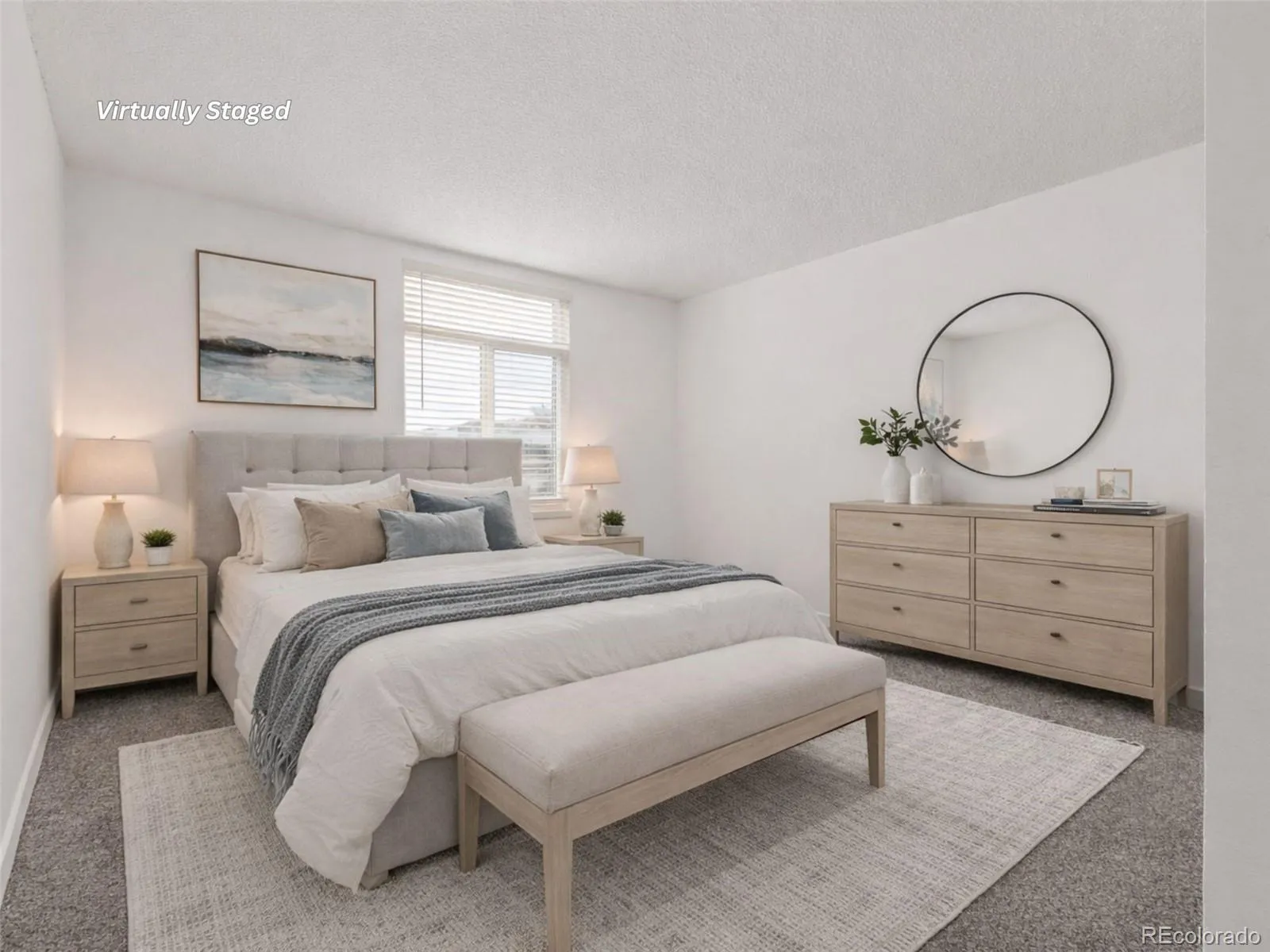 The spacious primary suite offers a private ensuite bath, while the second bedroom sits next to a full hall bath—ideal for guests, a roommate, or a home office setup.