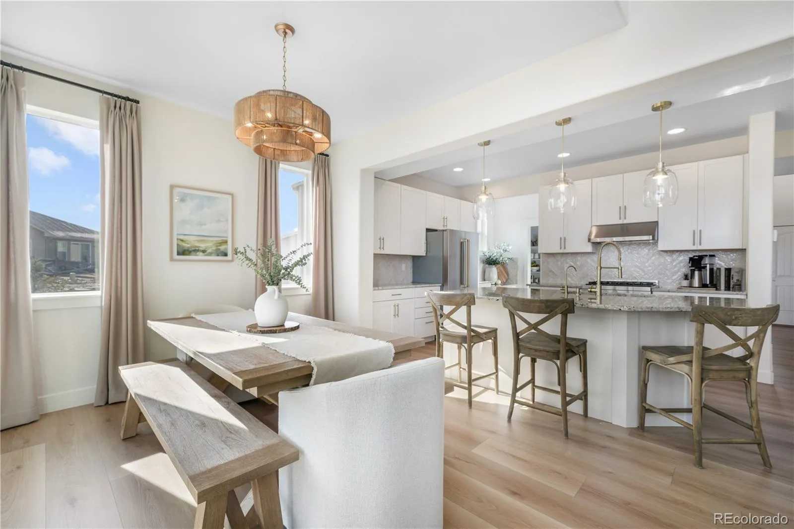 Stunning, highly upgraded two-story home in desirable Banning Lewis Ranch, perfectly situated on a quiet street with open space both in front and behind the home. Set on nearly 1/3 of an acre, this beautifully designed home offers 6 beds, 4 baths, and exceptional finishes throughout. A covered front porch welcomes you inside to soaring ceilings, laminate flooring, custom lighting, and an office to the right with double French doors. The beautiful staircase creates an elegant focal point, while the hidden and thoughtfully designed mudroom off the 3 car garage features impressive built-ins that truly set this home apart. The kitchen is the showstopper, complete with Z Line appliances, gas stove, farm sink, granite countertops, tile backsplash, and large walk-in pantry. The attached dining area walks out to a covered patio and an expansive, fully fenced backyard with stunning landscaping. The living room’s stone fireplace and abundant windows that flood the space with natural light are perfect for entertaining. The main-level primary suite offers motorized blinds and a luxurious bath with tile flooring, dual vanities, custom closet, and large walk-in shower with bench and beautiful tile work. Upstairs, a spacious loft overlooks the living room below and leads to 3 generously sized bedrooms, a full bath and upstairs laundry add convenience. The finished basement features 2 additional bedrooms, a recreation room with built-in dry bar and refrigerator, custom cabinetry with granite countertops, a versatile flex room ideal for an office or gym, a beautifully upgraded 3/4 bath, and a large mechanical/storage room with potential to finish as an additional bedroom. Located within walking distance to schools and the community park, Banning Lewis Ranch offers pool, parks, workout facility, walking trails, and more. With easy access to military bases, shopping, dining, and medical facilities, this exceptional home truly has it all. Schedule your showing today.