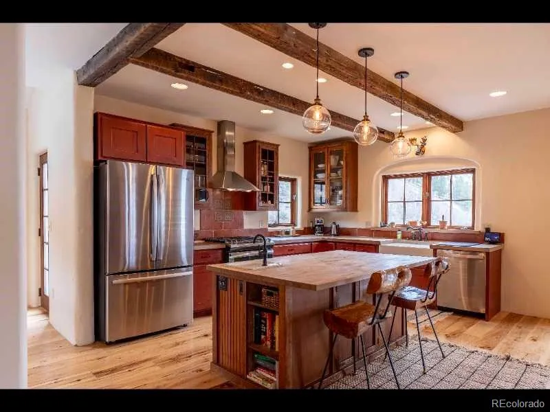 Perched atop one of the premier lots in Crested Butte South, this 3 bedroom, 3.5 bath home offers a rare combination of elevation, exposure, and thoughtful updates. Situated at the end of a quiet cul-de-sac, the 1/2 acre property provides a sense of seclusion and vastness that is increasingly hard to find. The primary draw is the extraordinary down-valley views, which remain unobstructed and expansive – as well as views of Whetstone and Red Lady. Lot also features a seasonal stream in the aspen grove below the front of the home. Perhaps most importantly for life in the mountains, this west and south facing home enjoys an additional two hours of daily sunlight compared to town or the lower “flats” of the valley. This extended golden hour isn’t just a luxury—it’s a game-changer for winter warmth and natural light – and long summer evenings spent on the deck. Modernized for Mountain Living Inside, the solidly built residence brings a clean, modern mountain aesthetic with updated wide plank hickory engineered floors throughout the home, clay paint walls, and two master suites – including a steam shower in one of the masters and cathedral ceilings throughout all of the bedrooms. The master above the garage could also possibly converted into a family suite or ADU in the future for owners looking for more flexibility in their setup. The kitchen was also modernized in 2019 with a full suite of new appliances. The wood stove sitting central to the living room, library and kitchen brings together the warmth of the home and is a favorite space