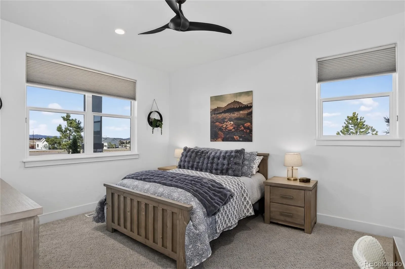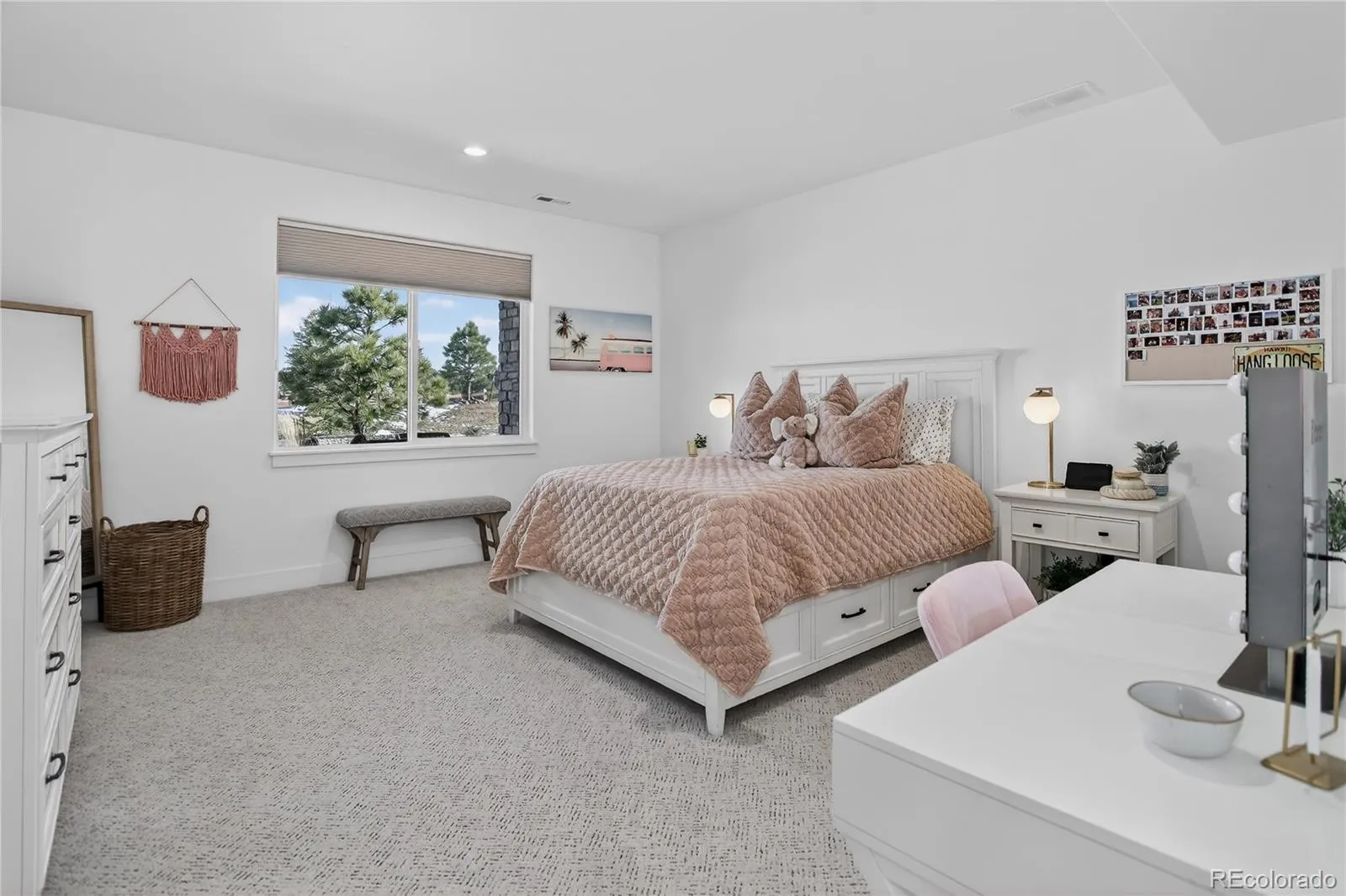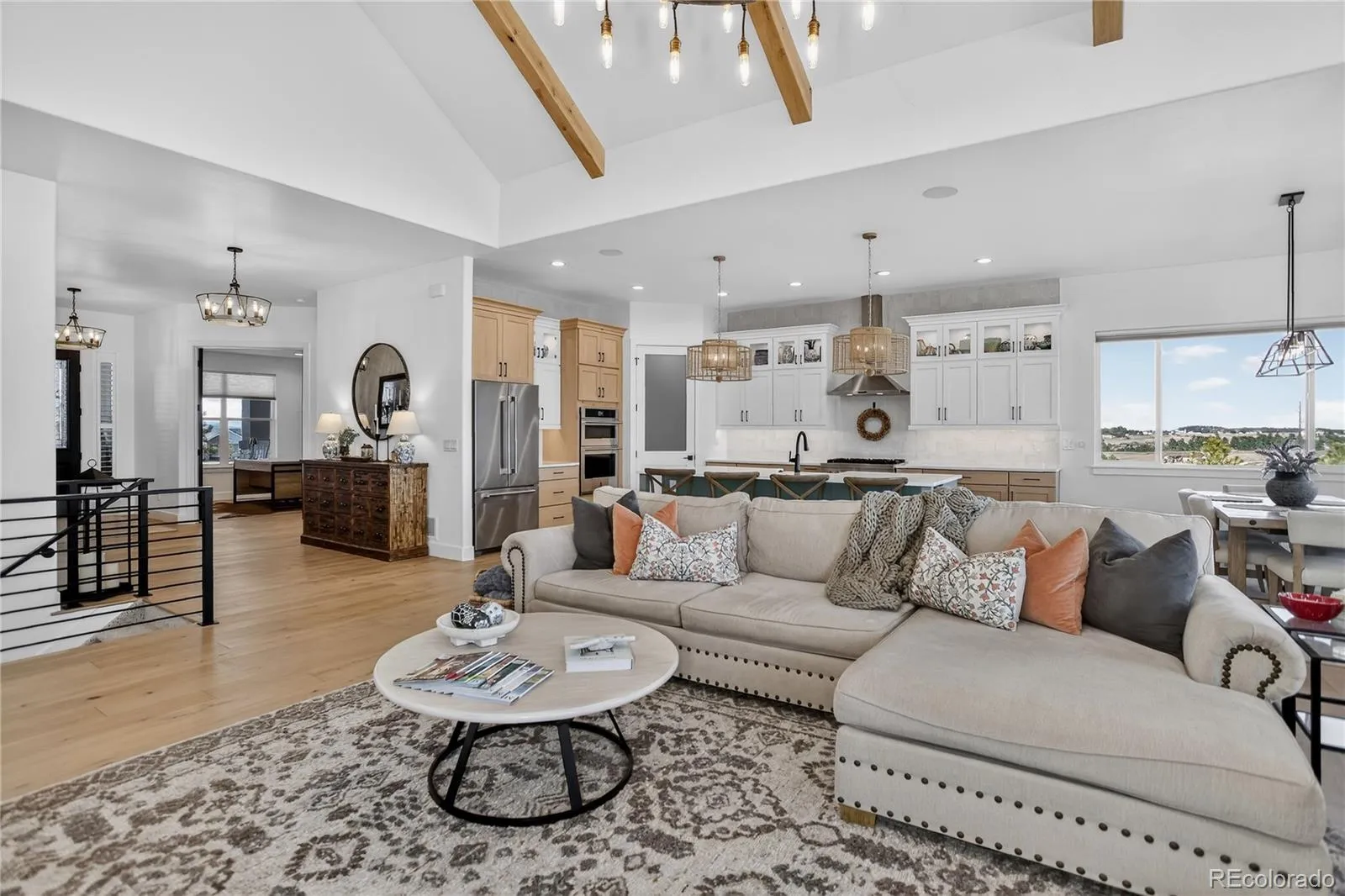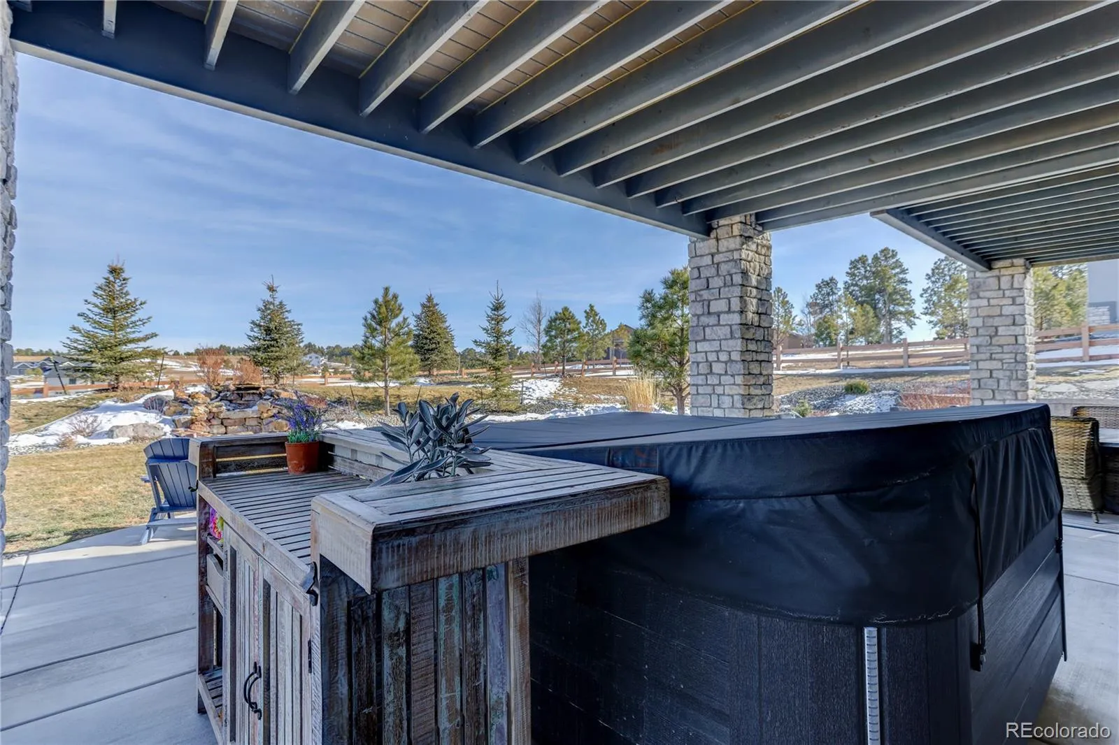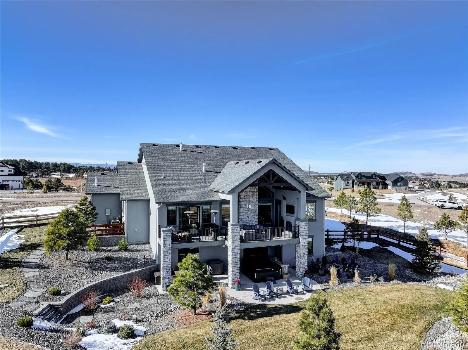 Escape the frenzied pace of city life in this fabulous 5BR/5BA custom ranch home located in Rollin Ridge Estates within the highly coveted Lewis-Palmer District 38. Completed in 2023, it offers exceptional design, superior quality, premium finishes and smart-home technology throughout. Set on a 2.5 acre tranquil cul-de-sac lot, it has both 4-car attached & 4-car detached heated, insulated, fully finished garages! Step through the welcoming covered front porch and foyer into the modern open floor plan and spacious light-filled great room with wide-plank hardwoods, soaring vaulted/beamed ceilings and a grand stone gas fireplace (1 of 4 in the home)! The gourmet eat-in kitchen features a massive entertaining island, quartz countertops, Jennair stainless steel appliances, farmhouse sink, spacious walk-in pantry and custom soft-close cabinetry. The luxurious main-floor owner’s retreat has a high coved/beamed ceiling, fireplace, and private deck access. The spa-inspired ensuite bath has radiant heated floors, double vanities, an enlarged glass shower, a soaking tub and an expansive walk-in closet with access to the utility/mud room. A second spacious guest bedroom with ensuite bath & walk-in closet, an office/guest bedroom, a ½ bath, mud room & well-appointed laundry complete the main level. Downstairs, the fully finished walkout basement boasts high ceilings, a large rec room with fireplace, wet bar, two additional bedrooms with ensuite baths & huge walk-in closets, and a third non-conforming bedroom or flex space. The large deck and lower-level patio have open & covered entertaining areas and include a fireplace, TV, 8-person hot tub, and gas fire pit all overlooking an extensively landscaped treed irrigated yard with beautiful stone water feature, split-rail fence, and invisible fencing for your pets. Experience the perfect blend of comfort and elegance in this exceptional home offering a rare balance of close-in country living with easy access to urban conveniences.