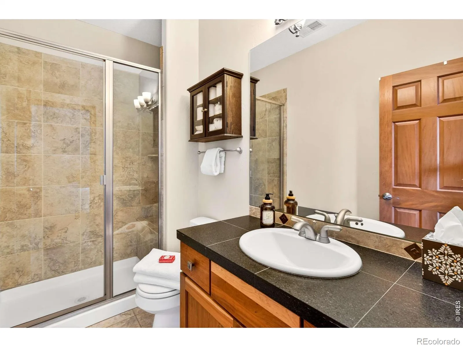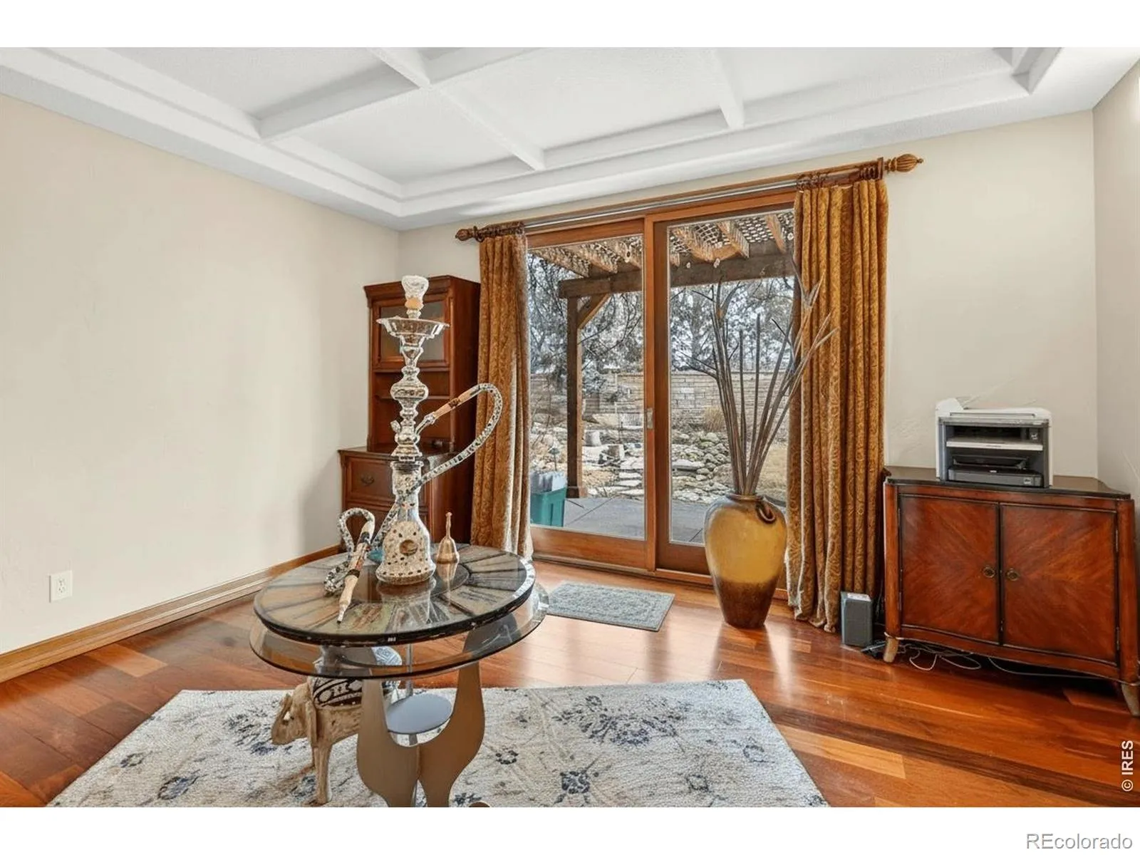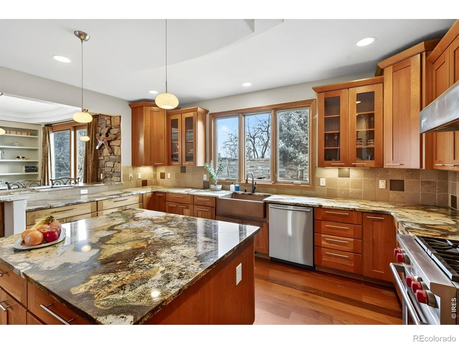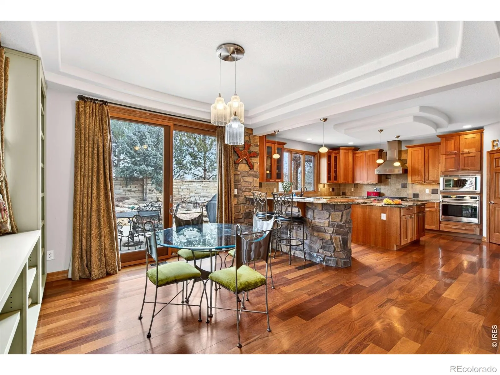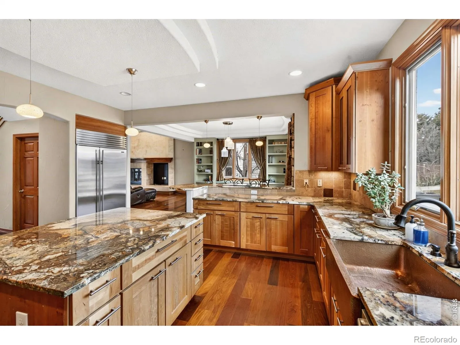 Blue Heron House. Set within the coveted Somerset Meadows, this timeless residence is designed for elevated everyday living and effortless entertaining, with warmth, beauty, and thoughtful craftsmanship seamlessly coming together. A welcoming front porch and soothing water feature set a serene tone upon arrival. Inside, rich Brazilian walnut floors, expansive windows, and gas fireplace anchor the living room, creating an inviting space filled with natural light. The home flows beautifully for entertaining, with spaces that feel both open and intimate. The kitchen is a true centerpiece, featuring premium Wolf and Sub-Zero appliances, a custom gas range, double ovens, a large island, copper sink, and walk-in pantry. Designed to host with ease, it opens effortlessly to the dining and living areas, making gatherings feel natural and connected. Indoor-outdoor living is a defining highlight. Step outside to a backyard retreat complete with a tranquil pond and water feature-visited by blue herons-offering a peaceful respite. Covered patios, vine-lined outdoor spaces, extend the living experience and create multiple settings for entertaining or unwinding. The upper level is anchored by a stunning primary suite with mountain views, vaulted ceilings, a luxurious five-piece bath with jetted tub, an oversized shower, and a walk-in closet. Additional upper-level bedrooms are light-filled and generously sized, each with walk-in closets. The finished lower level continues the home’s entertaining focus, featuring a travertine-floored rec room with quality finishes, built-in surround-sound speakers, arched architectural details, a full bar with a beverage refrigerator and dishwasher, a wine cellar, a bath, and a fifth bedroom, ideal for guests. Thoughtful details throughout, including a main-level office with access to a covered patio. Conveniently located in a great neighborhood, this residence offers a warm, cozy atmosphere with a timeless design.