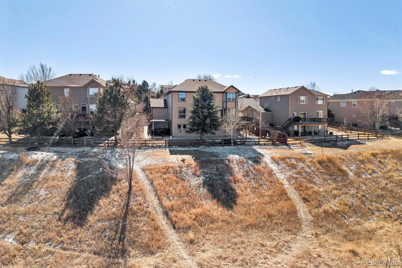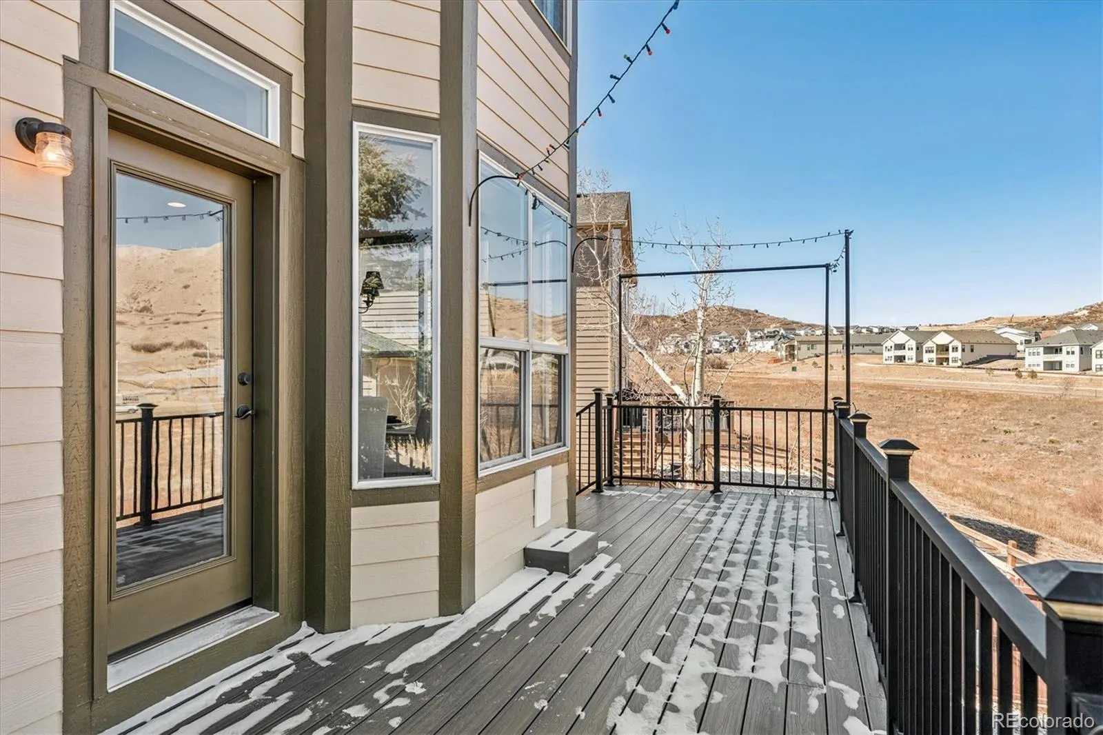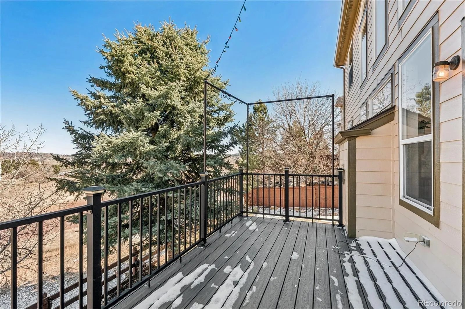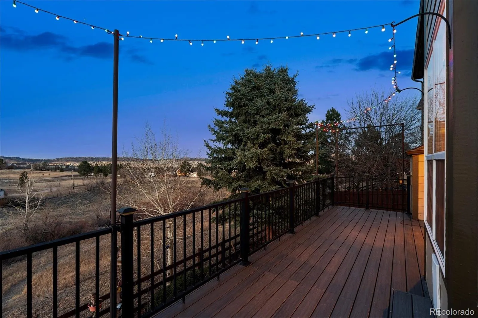 Show Stopper backing to open space in a beautifully private setting! From the inviting front porch to the expansive deck overlooking nature, this home delivers the perfect blend of comfort, style & setting. Step inside to an open floorplan filled w/natural light, fresh interior paint & engineered hardwood floors flowing throughout the main level. The formal dining room is highlighted by a classic bay window, while the dramatic great room features soaring two-story ceilings, walls of windows & a cozy gas fireplace w/blower for added warmth. The spacious kitchen is both functional & inviting, featuring stylish granite countertops, stainless appliances, a center island w/seating, distinctive copper sink & a sunny bay-window nook w/direct access to the deck — ideal for indoor-outdoor living. A main floor bedroom offers flexibility for guests or a home office, & the laundry room includes washer & dryer for added convenience. Upstairs, luxury vinyl flooring extends throughout the entire level — there is no carpet anywhere in the home. A loft overlooks the main living area, while the catwalk creates a striking architectural feature leading to the primary suite. The spacious primary retreat features double-door entry, a bay window & room for a sitting area overlooking the backyard & open space. The updated ensuite bath & walk-in closet w/built-ins complete the suite. The unfinished walkout basement w/rough-in plumbing offers excellent future expansion potential. Step outside to an expansive deck surrounded by trees & open space, where a private hot tub is tucked away for quiet evenings under the stars. The oversized 3-car garage provides generous storage & workspace. Ideally located close to Philip S. Miller Park, historic downtown Castle Rock, restaurants & everyday conveniences w/easy access to I-25, this home offers the privacy of open space living while still being close to everything.