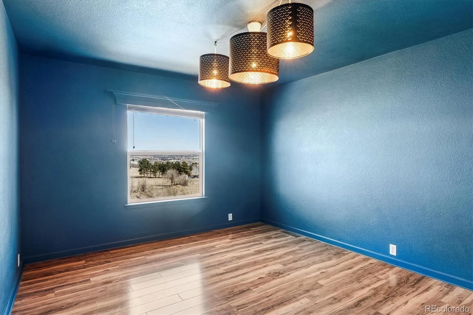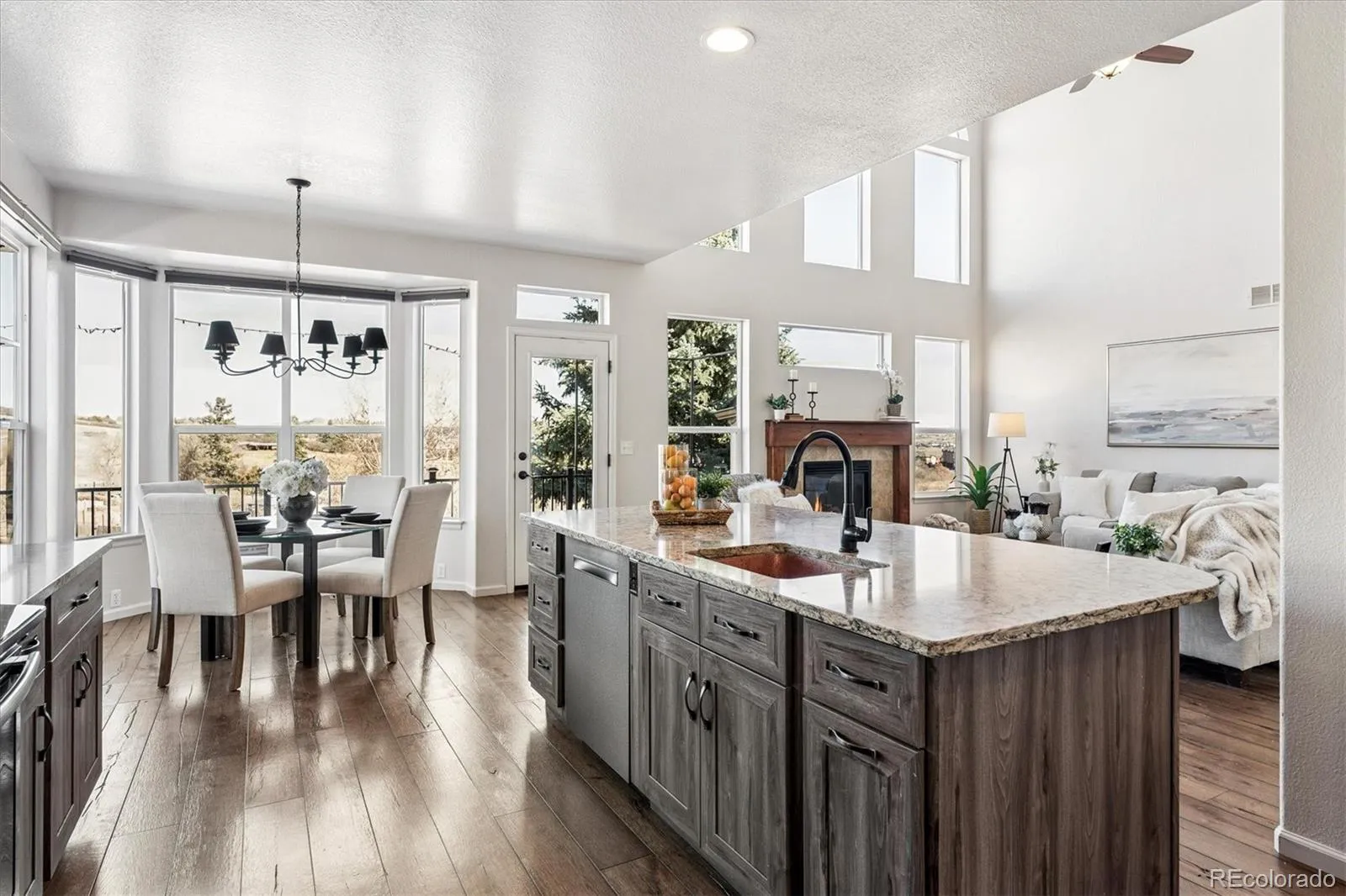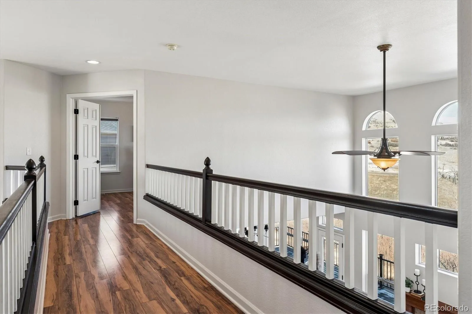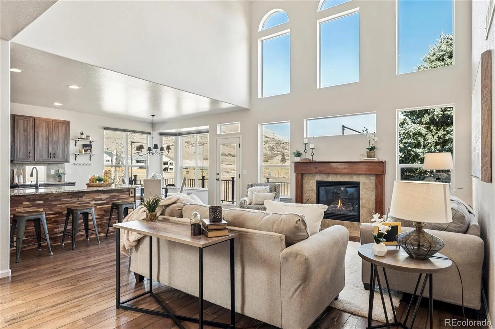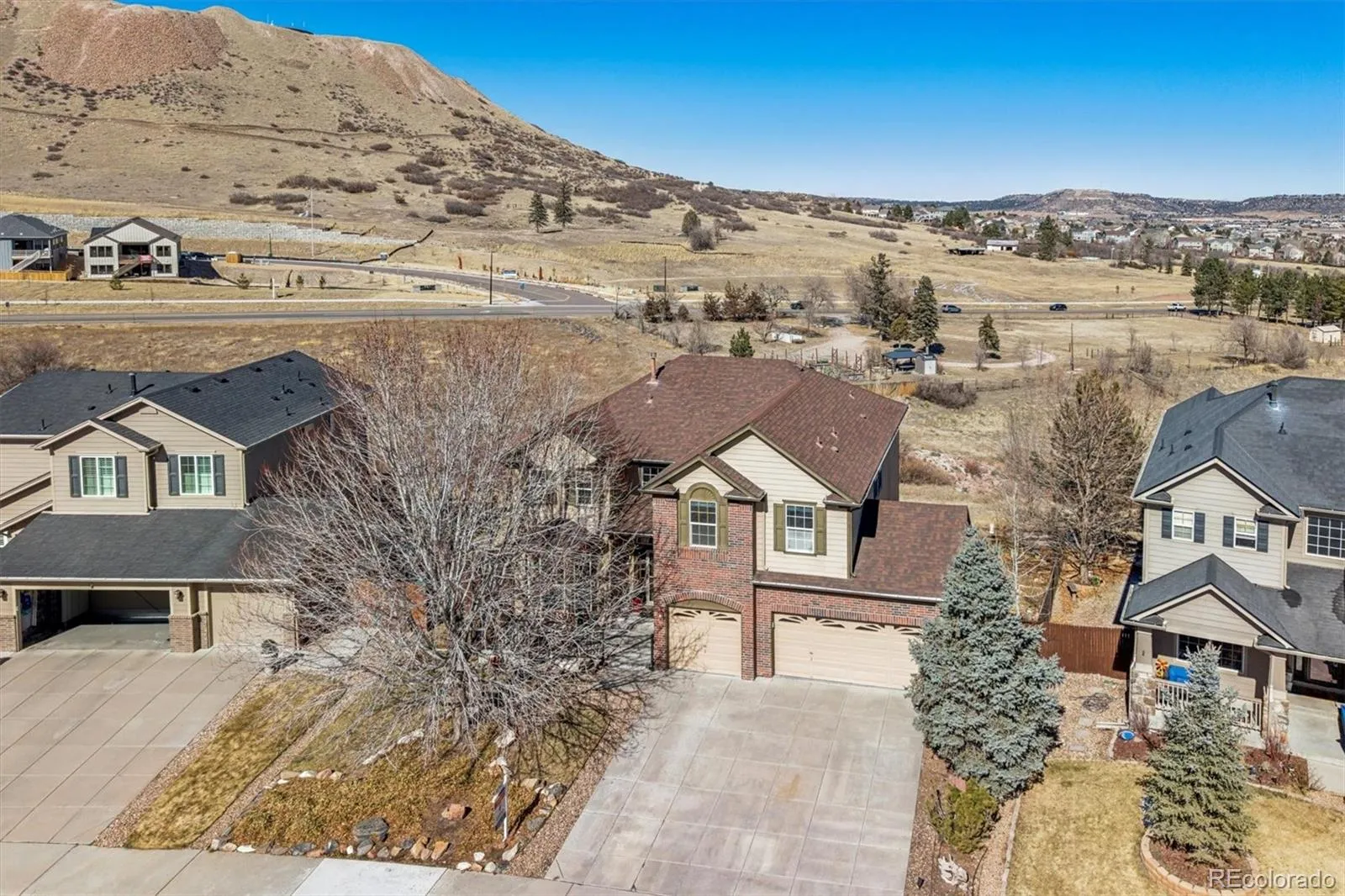 Show Stopper backing to open space in a beautifully private setting! From the inviting front porch to the expansive deck overlooking nature, this home delivers the perfect blend of comfort, style & setting. Step inside to an open floorplan filled w/natural light, fresh interior paint & engineered hardwood floors flowing throughout the main level. The formal dining room is highlighted by a classic bay window, while the dramatic great room features soaring two-story ceilings, walls of windows & a cozy gas fireplace w/blower for added warmth. The spacious kitchen is both functional & inviting, featuring stylish granite countertops, stainless appliances, a center island w/seating, distinctive copper sink & a sunny bay-window nook w/direct access to the deck — ideal for indoor-outdoor living. A main floor bedroom offers flexibility for guests or a home office, & the laundry room includes washer & dryer for added convenience. Upstairs, luxury vinyl flooring extends throughout the entire level — there is no carpet anywhere in the home. A loft overlooks the main living area, while the catwalk creates a striking architectural feature leading to the primary suite. The spacious primary retreat features double-door entry, a bay window & room for a sitting area overlooking the backyard & open space. The updated ensuite bath & walk-in closet w/built-ins complete the suite. The unfinished walkout basement w/rough-in plumbing offers excellent future expansion potential. Step outside to an expansive deck surrounded by trees & open space, where a private hot tub is tucked away for quiet evenings under the stars. The oversized 3-car garage provides generous storage & workspace. Ideally located close to Philip S. Miller Park, historic downtown Castle Rock, restaurants & everyday conveniences w/easy access to I-25, this home offers the privacy of open space living while still being close to everything.