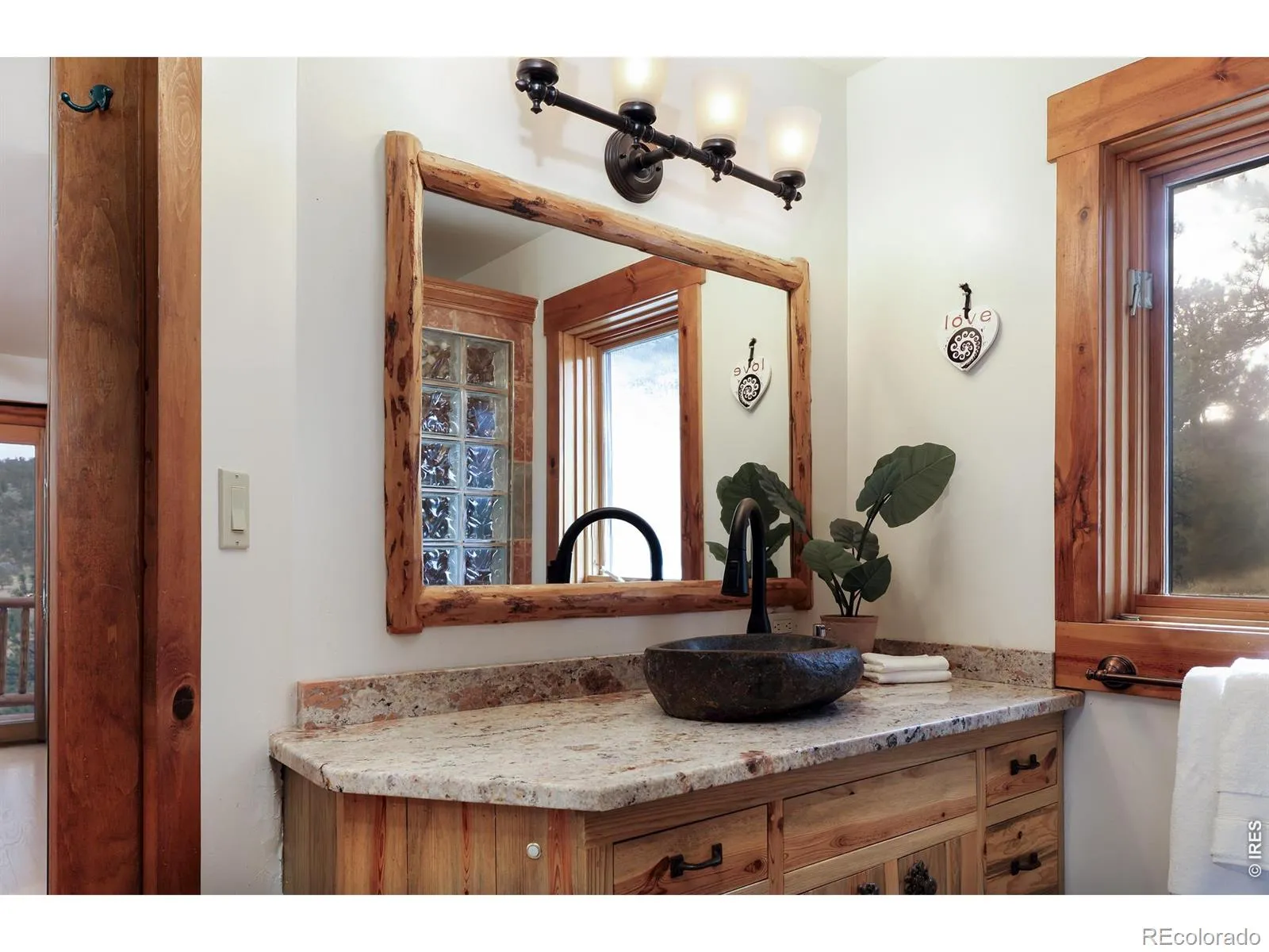 One-of-a-kind Colorado mountain home on 1.47 acres backing to National Forest with panoramic south-facing views from nearly every window and deck. Soaring ceilings, dramatic south-facing windows, and a massive moss rock fireplace define the great room. Artisan finishes throughout including hand-peeled log accents, native flagstone, slate, and recently refinished hardwood floors. Primary suite features fireplace, private deck, tiled bath, and dual walk-in closets. Updated kitchen with new granite countertops and custom cabinetry. One of the home’s most distinctive features is the tavern-style bar with log siding, historical red brick and sandstone accents, an unforgettable space for your next gathering. A unique indoor atrium/rainforest office brings nature inside year-round, while the enclosed sunroom adds over 220 square feet of additional flexible living space beyond the home’s core interior space. Oversized decks, terraced garden space, custom stone walkway, new custom metal railing, and concrete driveway – a luxury in the mountains. Rare (owned) Tesla solar roof tiles are beautiful and so much better than solar panels. Updated mechanical systems including boiler, water heater, and water filtration system. Direct access to hiking trails from your backyard. A truly distinctive mountain retreat minutes to downtown Lyons and only 20 minutes to Rocky Mountain National Park.