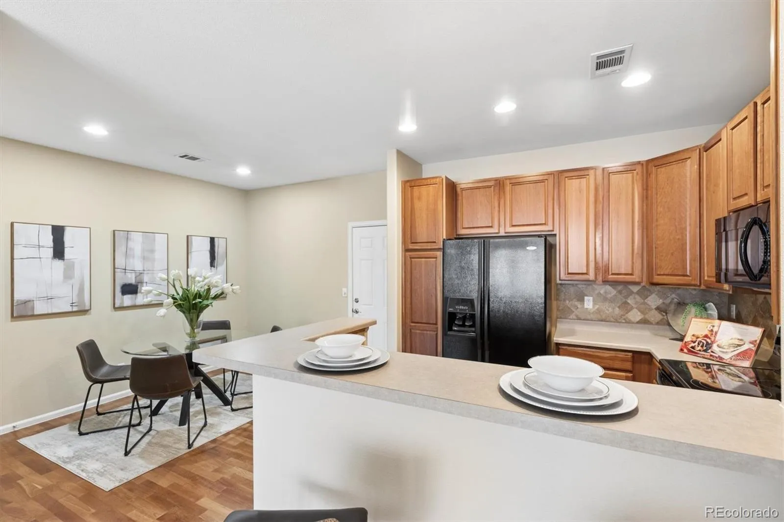 Welcome to an exceptional opportunity in the highly sought-after Stonybridge Townhomes of Highlands Ranch, where spacious living, thoughtful upgrades, and an unbeatable location come together. Freshly painted in August 2025, this move-in-ready home feels bright, clean, and inviting. The main level features an open layout with a separate dining area and a well-appointed kitchen with upgraded wood cabinetry, matching black appliances, pull-out storage, and a breakfast bar that flows into the living space. The cozy living room fireplace creates the perfect place to relax, while the front patio offers space to unwind or BBQ. Upstairs are two generously sized bedrooms with vaulted ceilings and private en-suite baths. The expansive primary suite includes a sitting area, gas fireplace, and a built-in bookcase. Laundry is conveniently located upstairs. Additional highlights include a fully finished attached two-car garage with abundant built-in shelving and storage. Enjoy access to four private recreation centers with indoor/outdoor pools, fitness facilities, tennis and pickleball courts, plus 70+ miles of trails and the 8,200-acre Backcountry Wilderness Area. Ideally located near C-470, South Suburban Golf Course, shopping, and dining. Low-maintenance Highlands Ranch living combines space, comfort, amenities, and location. Homes priced like this in great condition don’t last long—schedule your showing today.