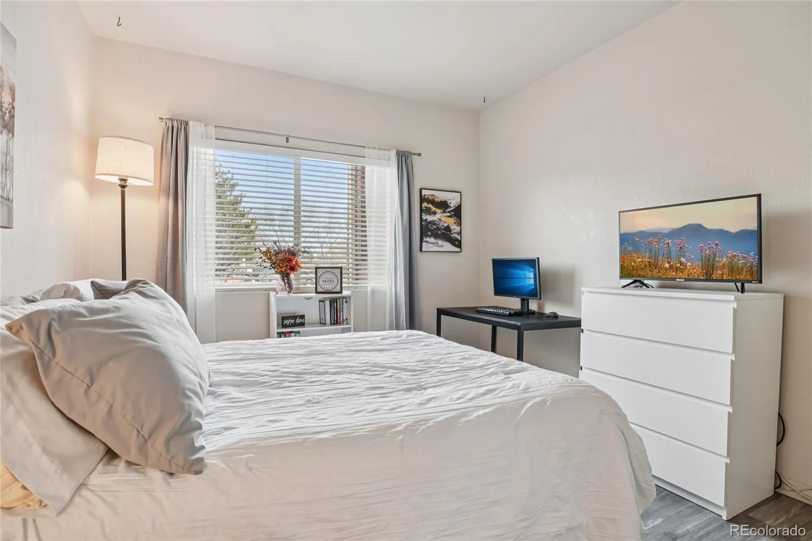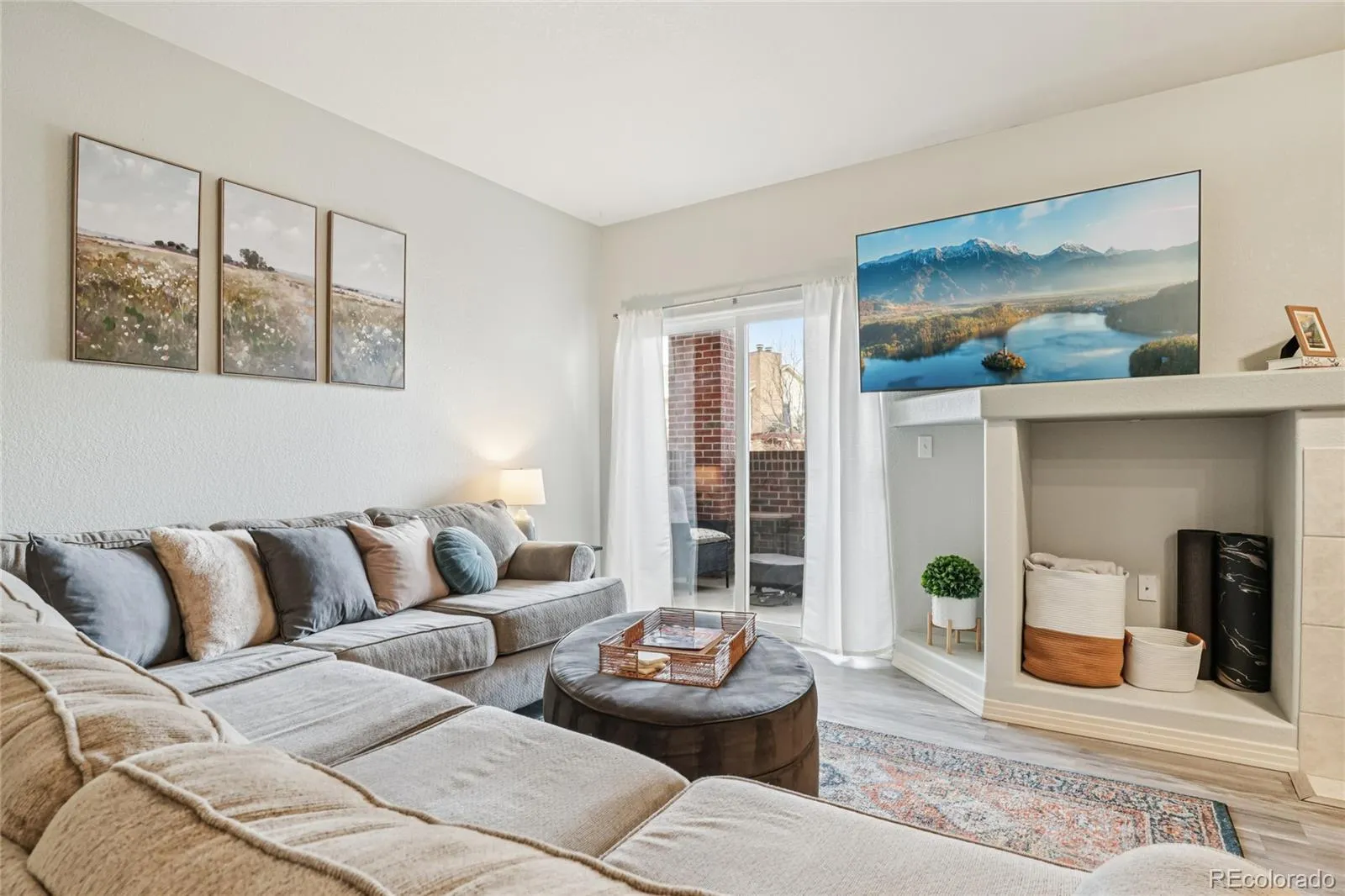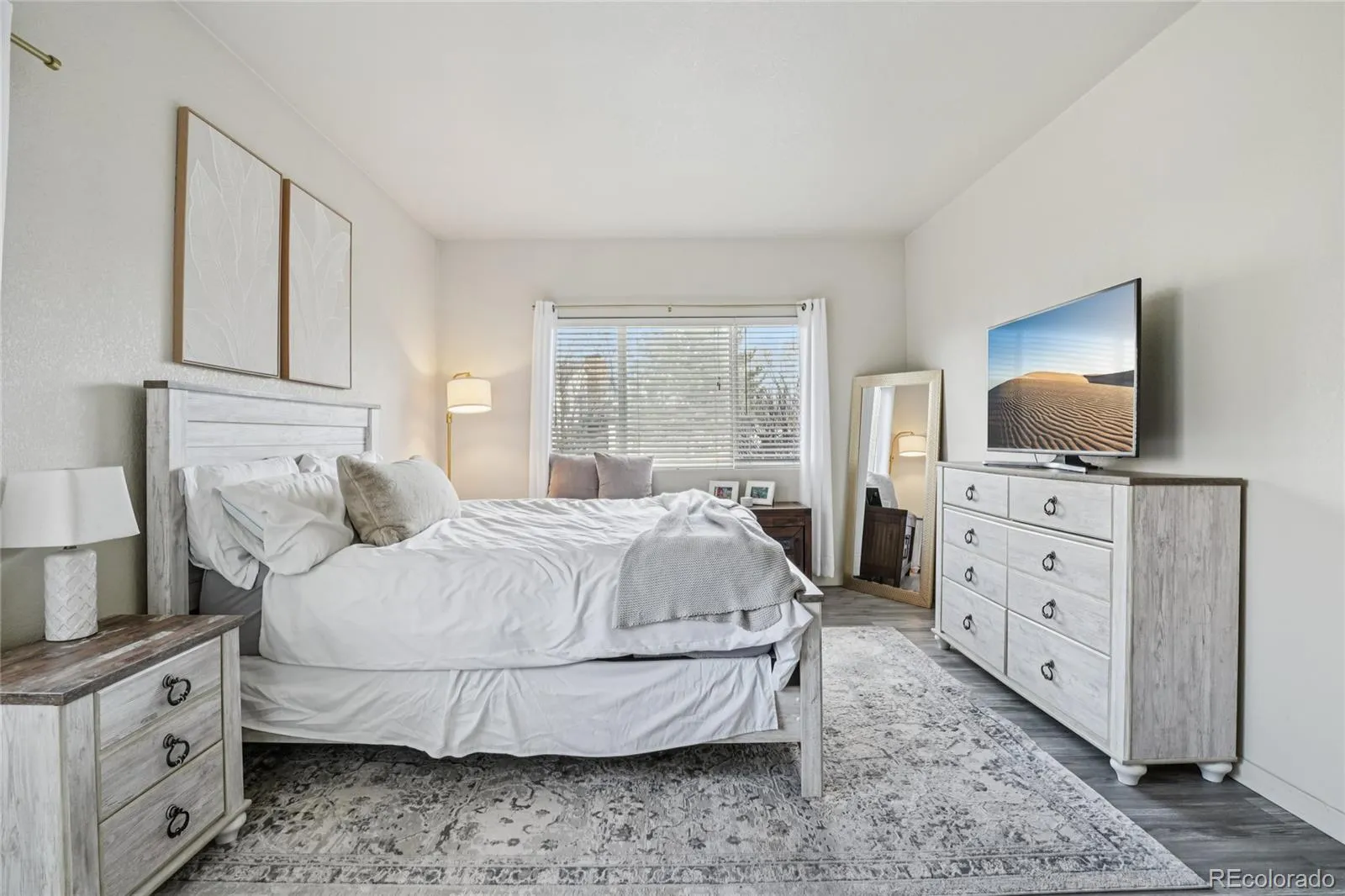 Enjoy zero-maintenance living in this main-floor turnkey condo in Thornton’s centrally located Oakshire neighborhood. This east-facing residence features fresh interior paint, stunning laminate hardwood floors, and an open floor plan for functional everyday living. Enjoy preparing a meal in the updated kitchen, complete with stainless steel appliances, painted two-tone cabinetry, and a cozy breakfast counter for barstool seating. Step out of the large glass slider leads to a sizeable covered patio with a bonus closet for added storage. The laminate hardwoods extend into a generously sized secondary bedroom, a full bath, and the primary suite. This spacious retreat includes a walk-in closet, a linen closet, and an ensuite 4-piece full bath. Additional features of this property include in-unit laundry, all appliances included, a large crawlspace for added storage, a gas fireplace, and 2 reserved parking spots. The low HOA includes a community pool, trash, water, and sports courts. Ideally situated within minutes of shopping, dining, public transportation, and major roadways. This property is ready for its next chapter; all it needs is you.