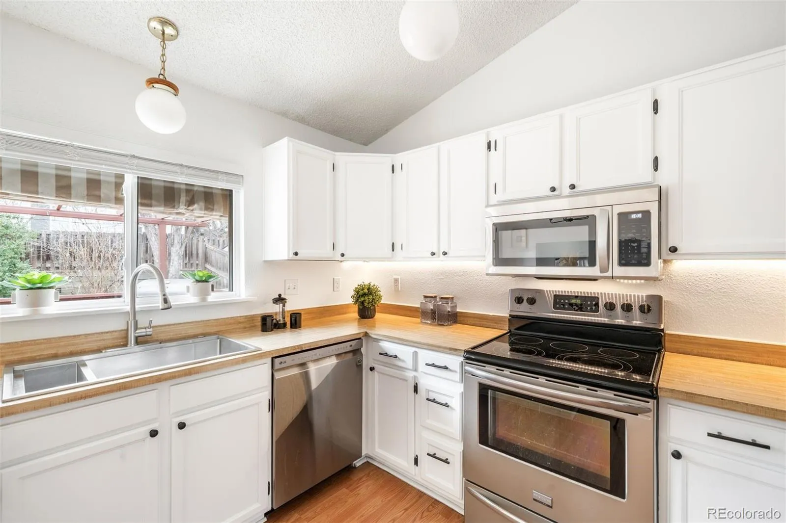 The light-filled kitchen features stainless steel appliances, under-cabinet lighting, a cozy breakfast nook, and ample cabinet storage. Upstairs, three bedrooms and a full bathroom provide comfortable living, while vaulted wood ceilings in both the spacious primary suite and a secondary bedroom add warmth, character, and a sense of openness.