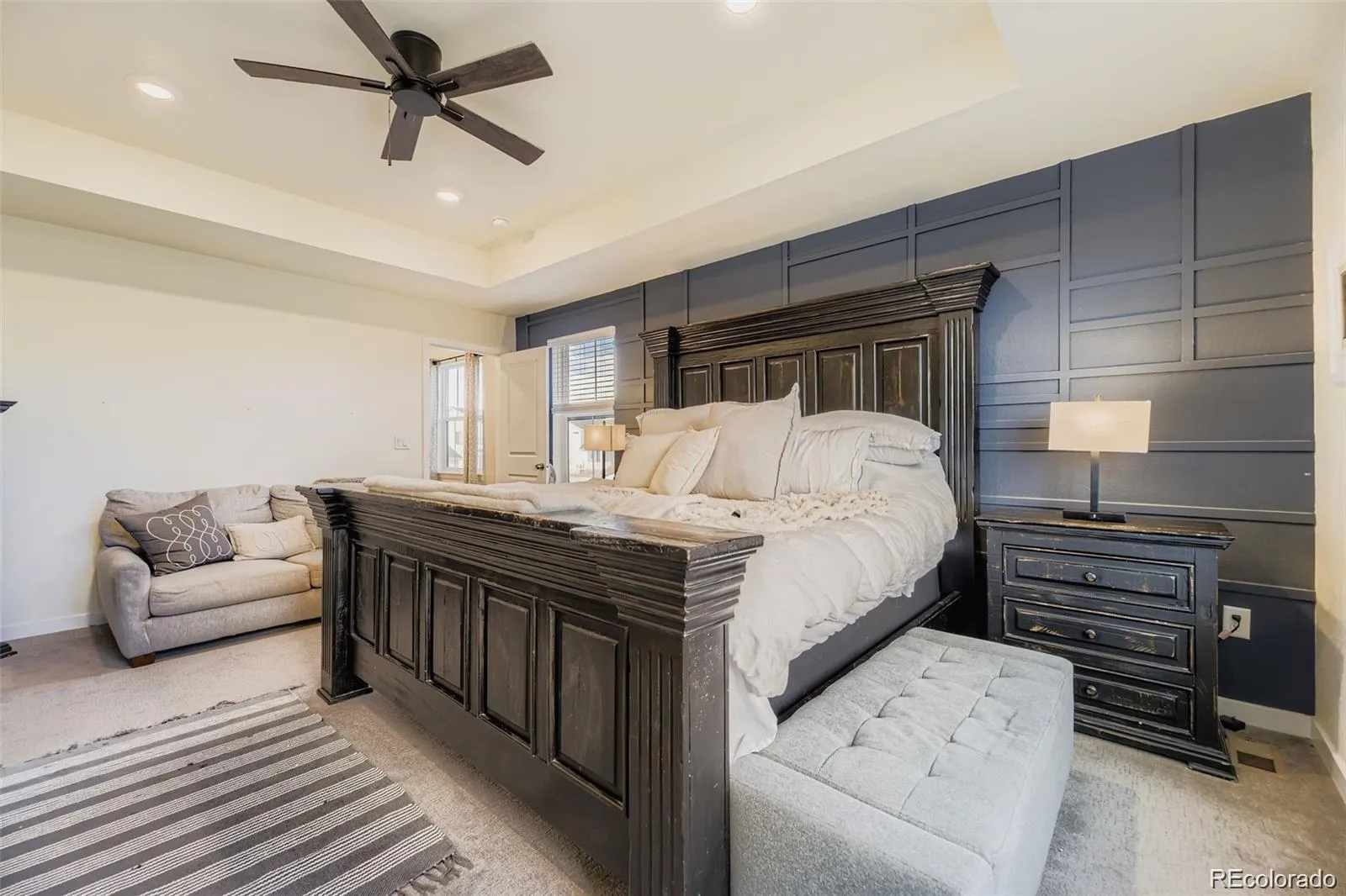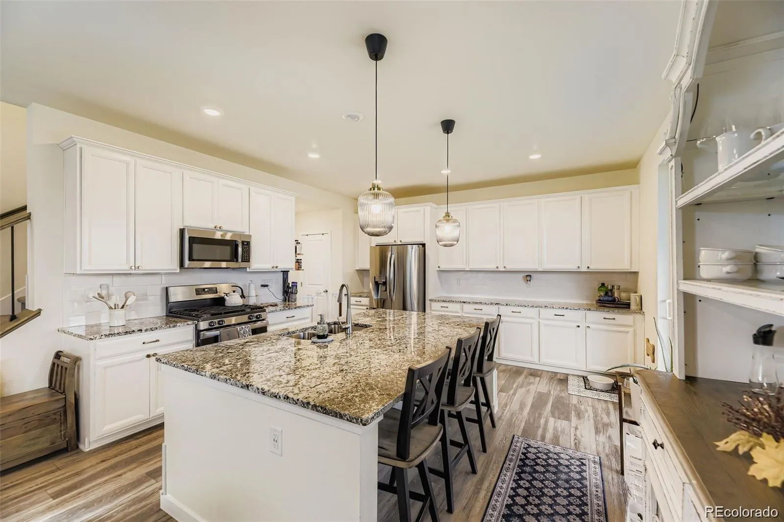 This stunning 5-bedroom, 3-bath Lennar home boasts a partially finished basement and modern upgrades throughout. The bright, spacious kitchen features a large island with ample seating, white cabinetry, granite countertops, a subway tile backsplash, a gas range, and stainless steel appliances, all complemented by laminate vinyl plank flooring on the main level. A main-floor office, outfitted with custom doors and wood blinds, provides the perfect work-from-home space. The large family room showcases designer paint and a wood accent wall, offering a cozy yet stylish atmosphere. Upstairs, the expansive master suite impresses with its designer paint and wood accents, granite countertops, a walk-in closet, and a beautifully tiled shower and flooring. Three additional bedrooms share a bathroom equipped with dual sinks, granite countertops, and a spa tub for relaxation. The finished basement includes a decorative brick wall feature, an electric fireplace, an extra family room (perfect for a man cave), a non-conforming bedroom or office, and a sizable workout gym or storage area. Outside, enjoy a trek deck, covered patio, and an extended concrete patio ideal for barbecuing or gathering around a fire pit. The low-maintenance backyard features turf grass, saving on water bills and upkeep. The home also has a newer roof and assumable efficient solar plans from ION at $105.00 monthly, making it an eco-friendly and cost-effective choice.
