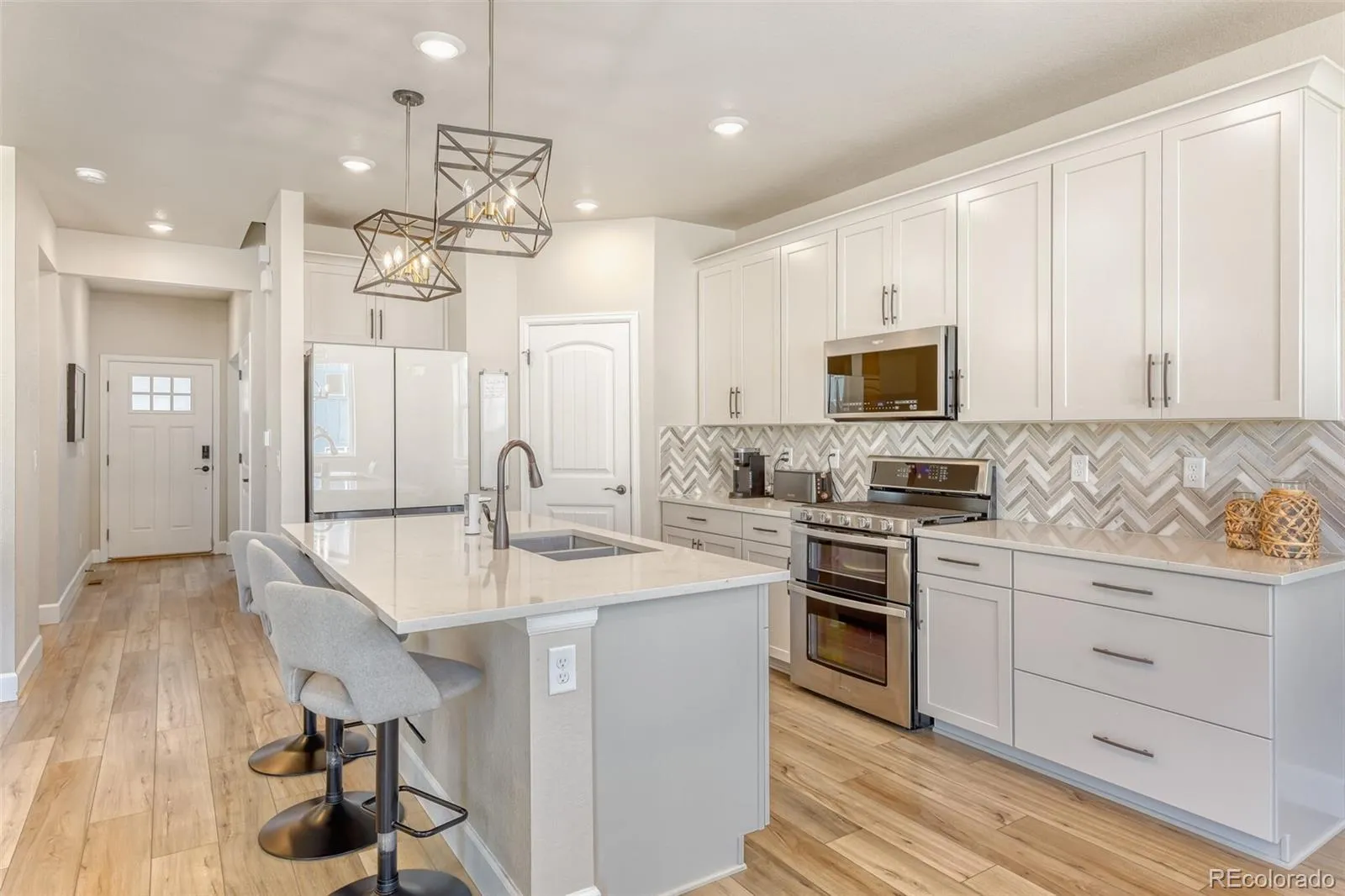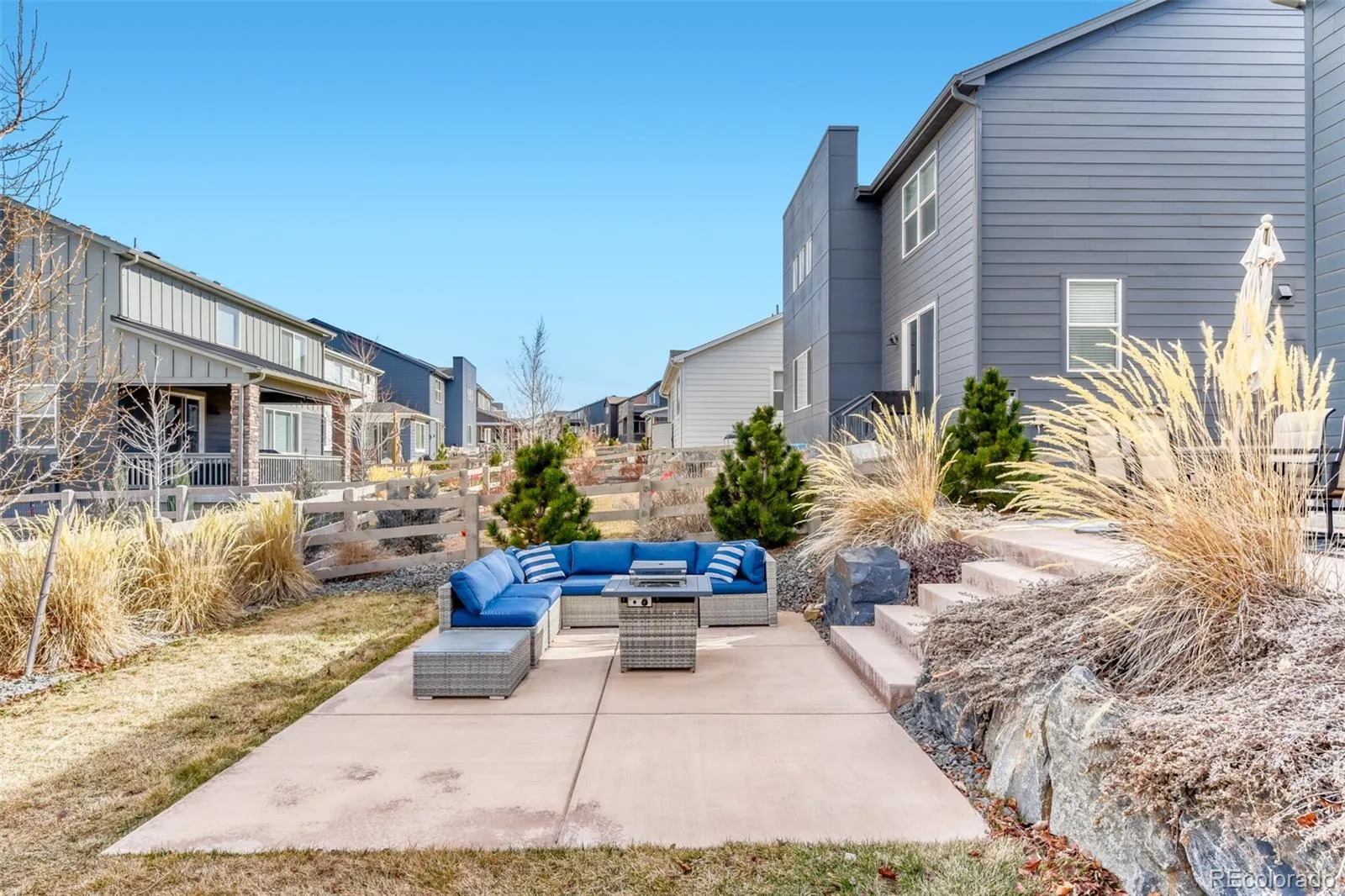 Welcome to 9857 Rosalee Peak Street in Sterling Ranch — a truly one-of-a-kind home in one of Colorado’s most sought-after lifestyle communities. Built in 2022 and thoughtfully upgraded throughout, this beautifully landscaped property offers 3 bedrooms, 3 bathrooms, and over 2,200 finished square feet above grade, plus a large unfinished basement with rough-in plumbing ready for a future bathroom and additional living space. Inside, you’ll find designer finishes, quartz countertops, luxury plank vinyl flooring, high ceilings, and an open-concept layout ideal for modern living. The spacious kitchen serves as the heart of the home with a large island, bonus eat-in dining area, stainless steel appliances, and a top-of-the-line Samsung refrigerator, while upgraded décor zebra blinds add a refined touch throughout. Upstairs, a generous loft provides flexible space for entertaining, a media room, or home office. The primary suite is exceptional, featuring a large five-piece bath that flows directly into a custom ELFA-finished oversized walk-in closet designed for both luxury and organization. Step outside to a private backyard retreat complete with irrigation in the front and rear, plus a custom two-tiered patio with firepit perfect for Colorado evenings. Additional highlights include a 2-car garage, forced air heat with solar integration, central air conditioning, mountain views, and access to Sterling Ranch’s clubhouse, fitness center, pool, parks, playgrounds, and extensive trail system. Enjoy the convenience of walking to Safeway, Starbucks, dining, and everyday amenities while being minutes from hiking, biking, Waterton Canyon, and the beginning of the Colorado Trail. This is not just a home — it’s a lifestyle opportunity in one of Douglas County’s most dynamic communities.